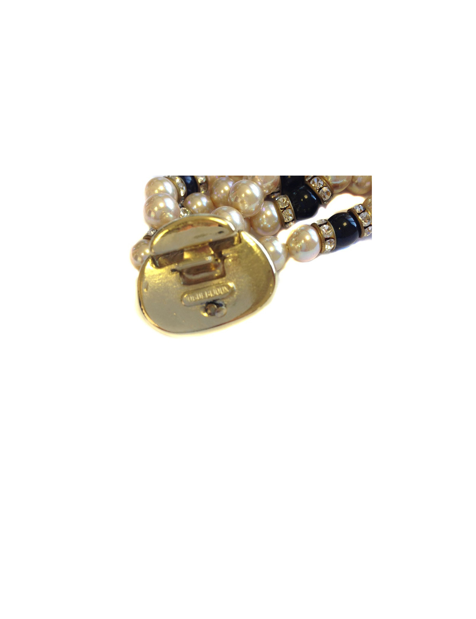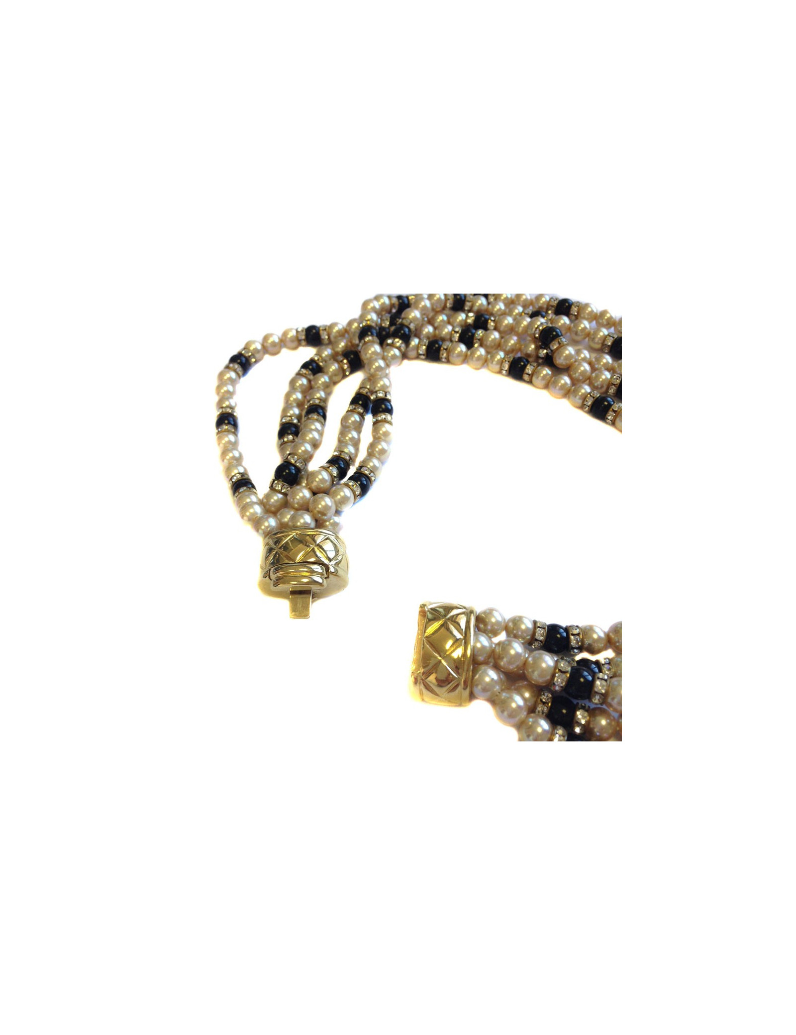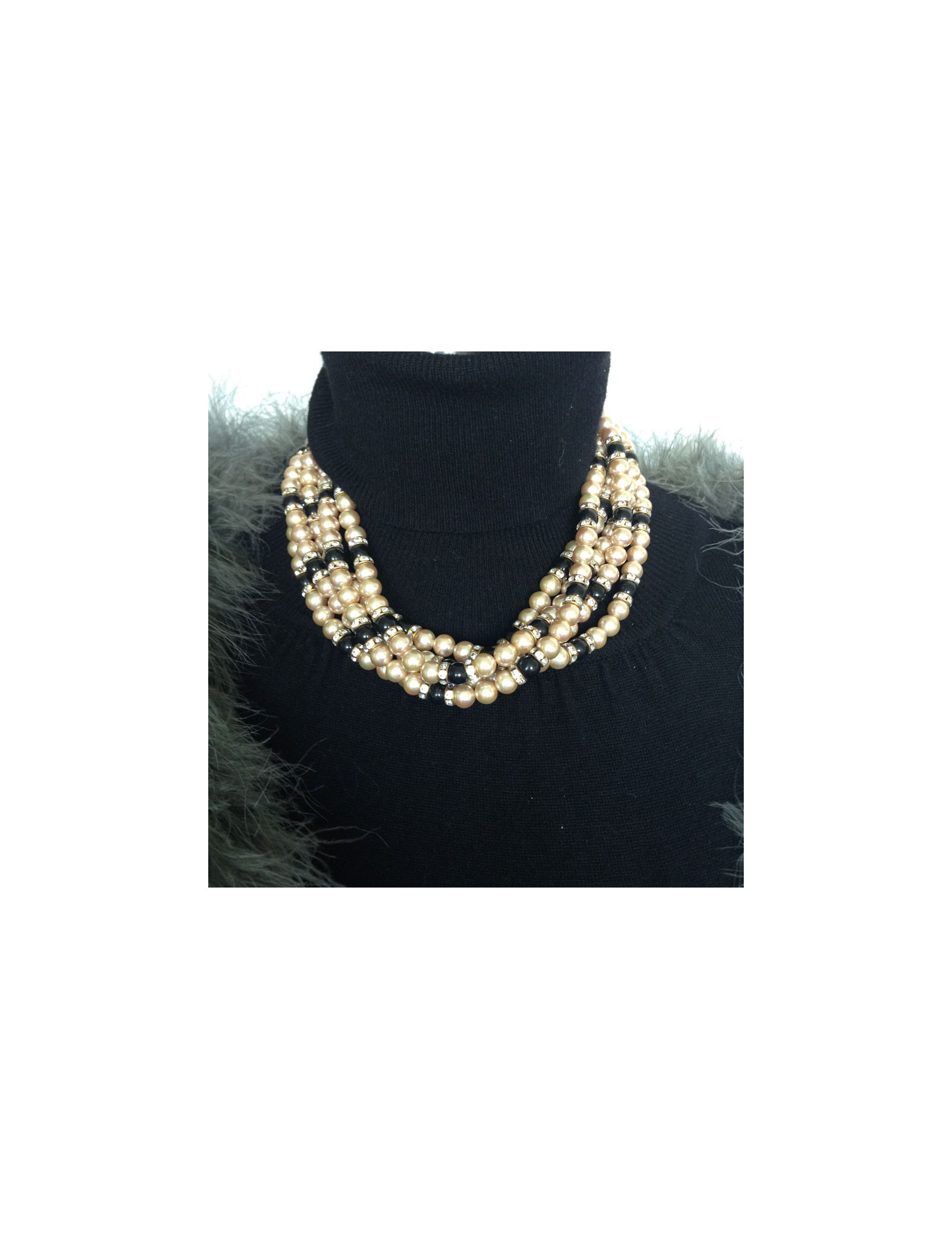 Très beau collier ras du cou de la maison VOGUE BIJOUX, mutli-rangs de perles nacrées et noires, serti également de strass swarovski blancs. Fermoir à cliquet en métal doré, effet matelassé.