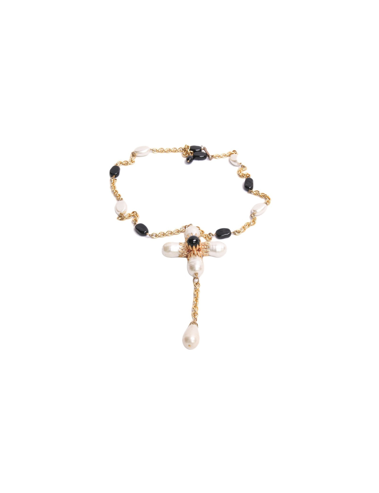 Sautoir croix Couture en pâte de verre nacré ou noir, Marguerite de Valois. Fabrication dans les ateliers de la marque. Bijouterie dorée.