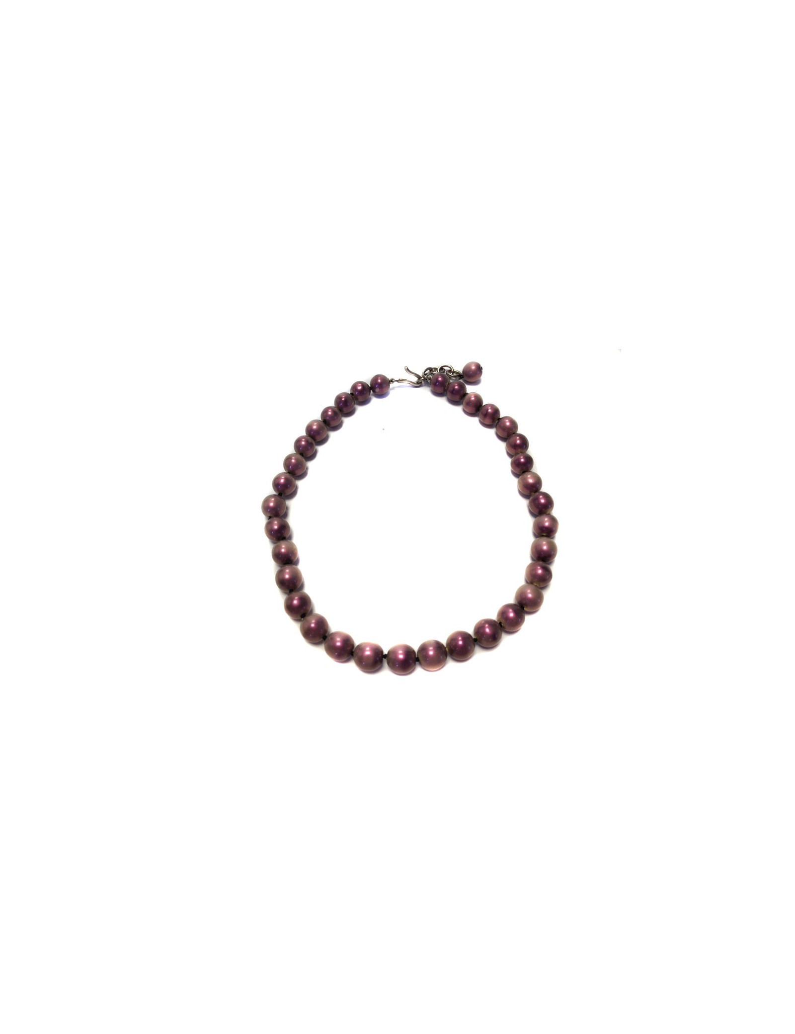 Collier CHANEL vintage (collection 98) en perles nacrées violettes. Une perle proche du fermoir est un peu abîmée (voir photo). Collier en très bon état général. Fermoir crochet.