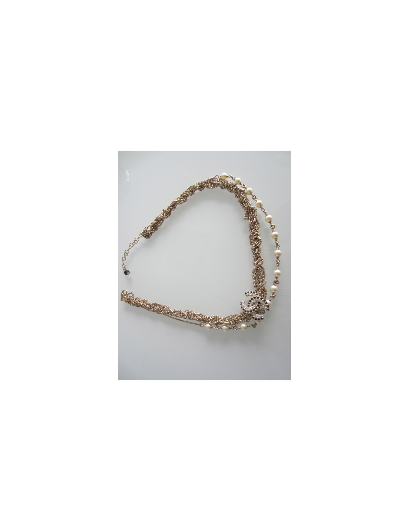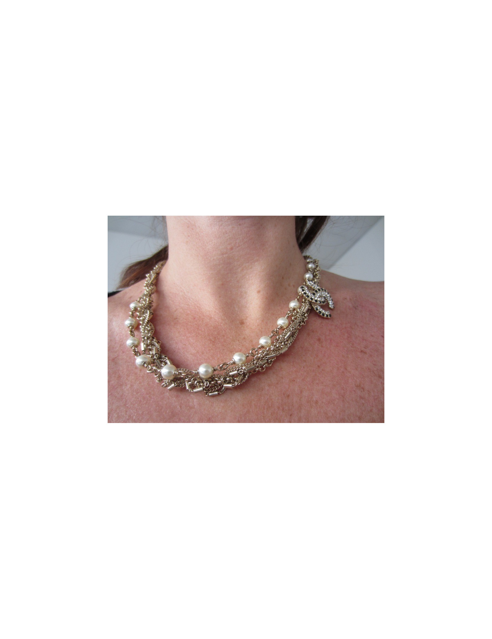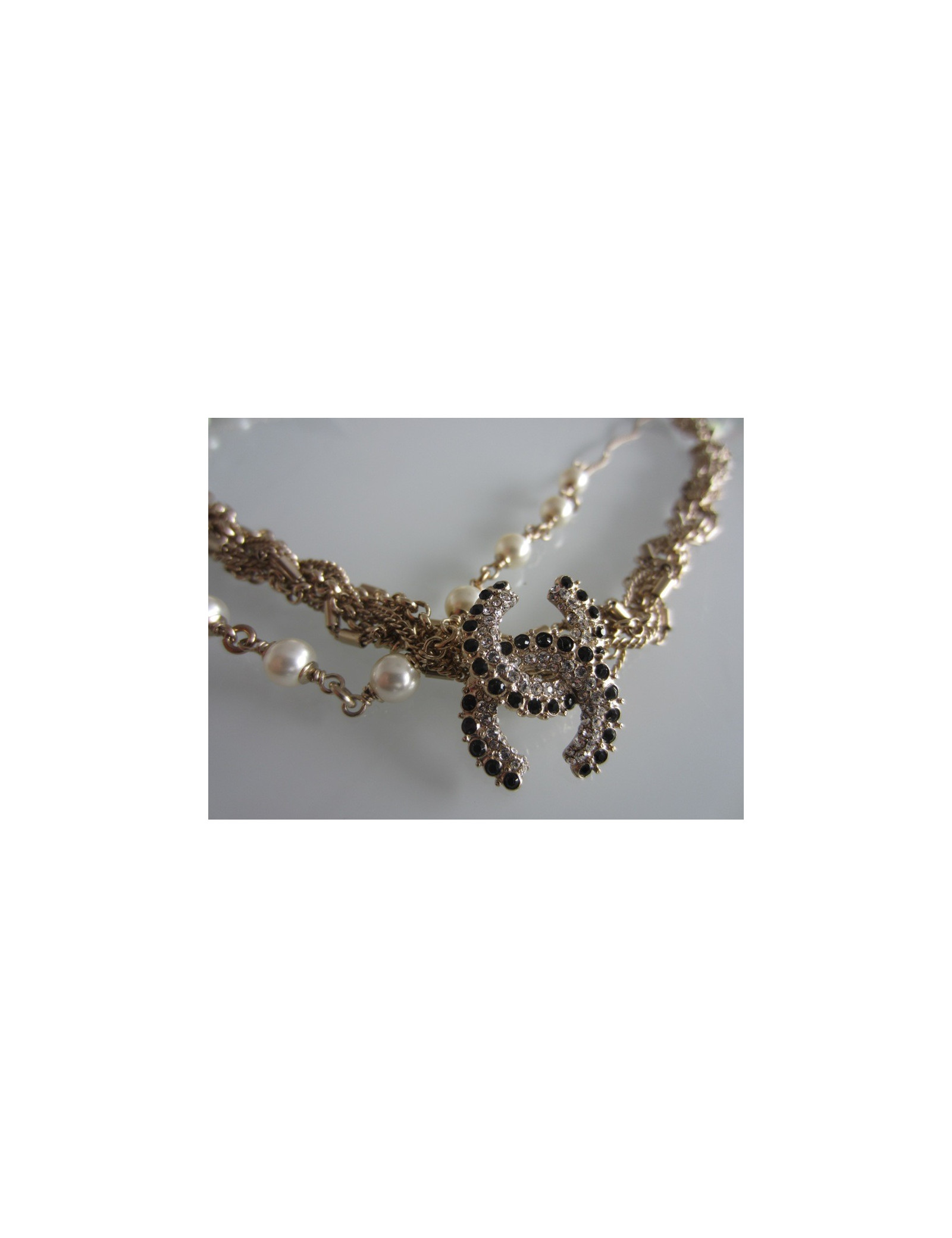Sublime collier Chanel en métal doré à l'or fin, mélande de 6 chaines Chanel entrelacées surmonté d'un magnifique CC en strass blanc et noir (2 X 2,5cm) + une chaine indépendante composée de perles nacrées.