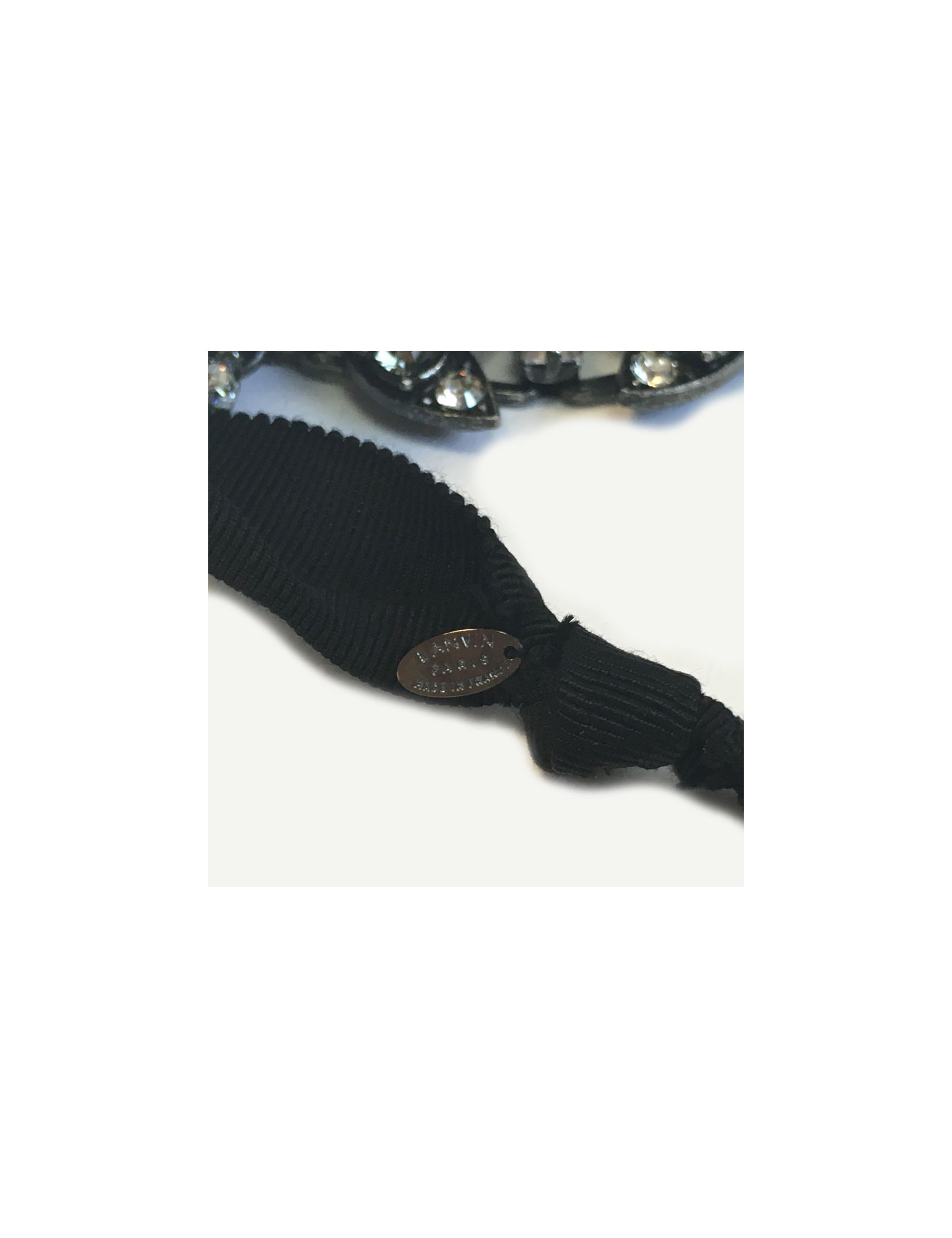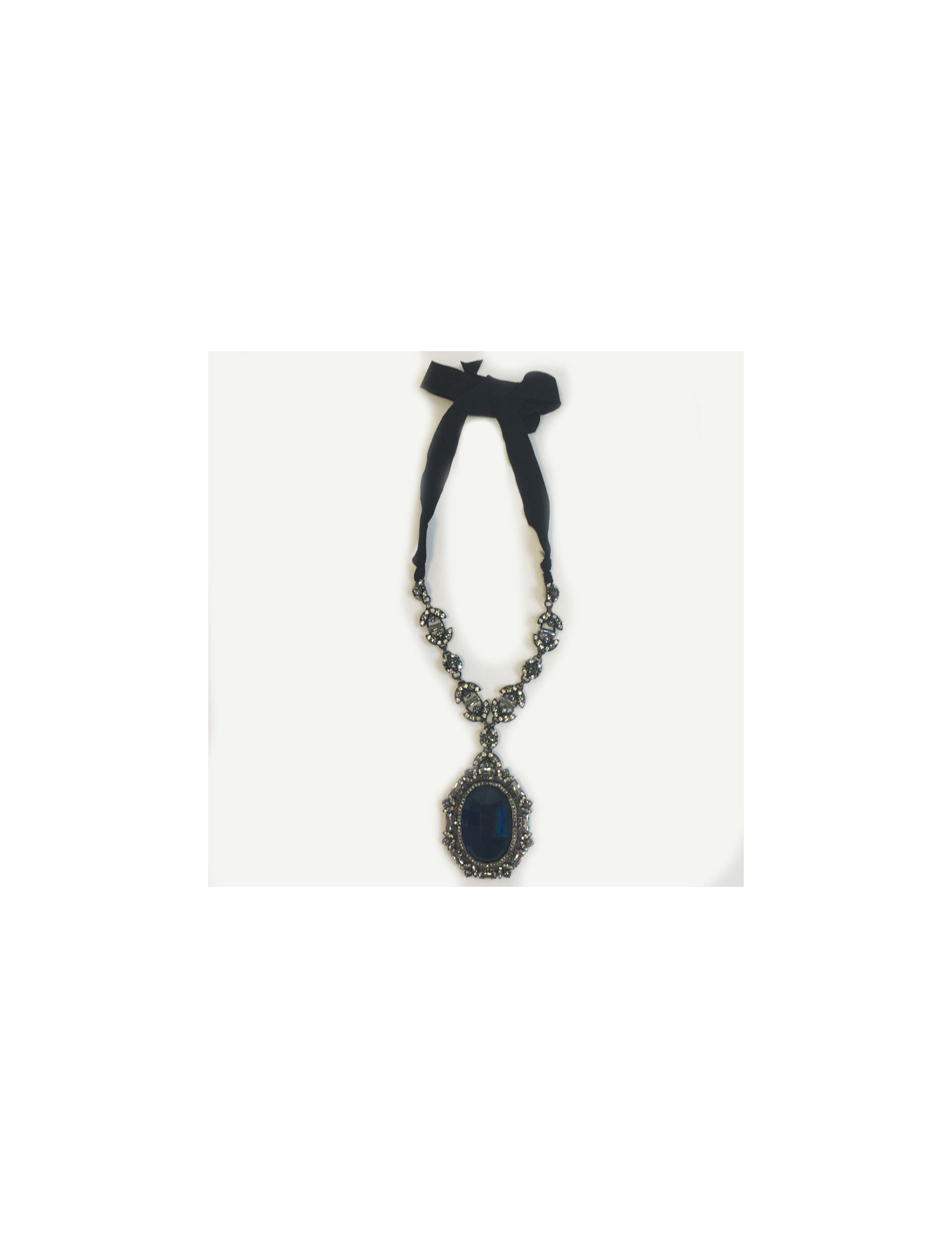 Couture!! Superbe collier LANVIN pendentif pierre bleue facettée en plexi, métal argent noirci et strass. Microrayure sur la pierre bleue. Attache en ruban gros grain noir satiné.