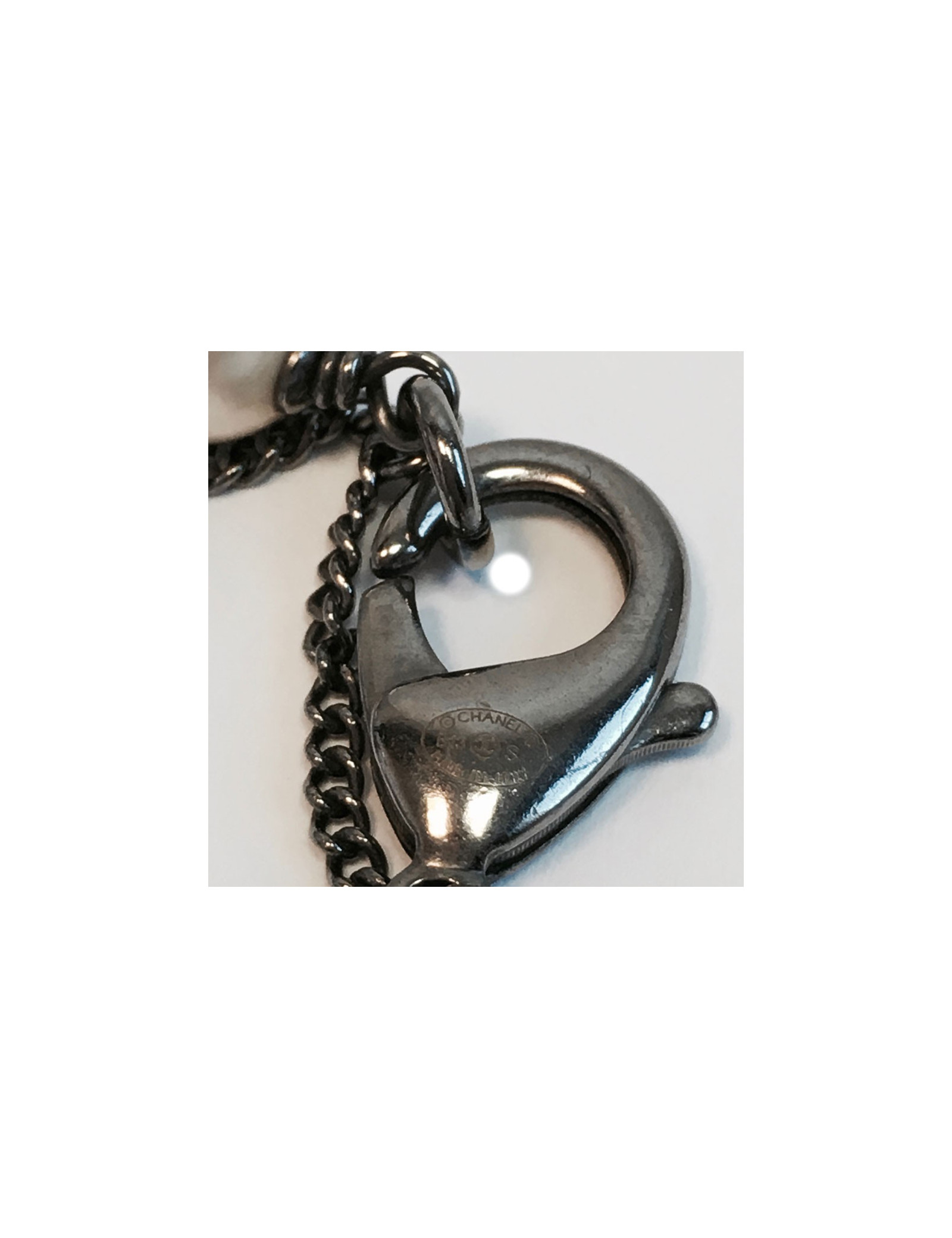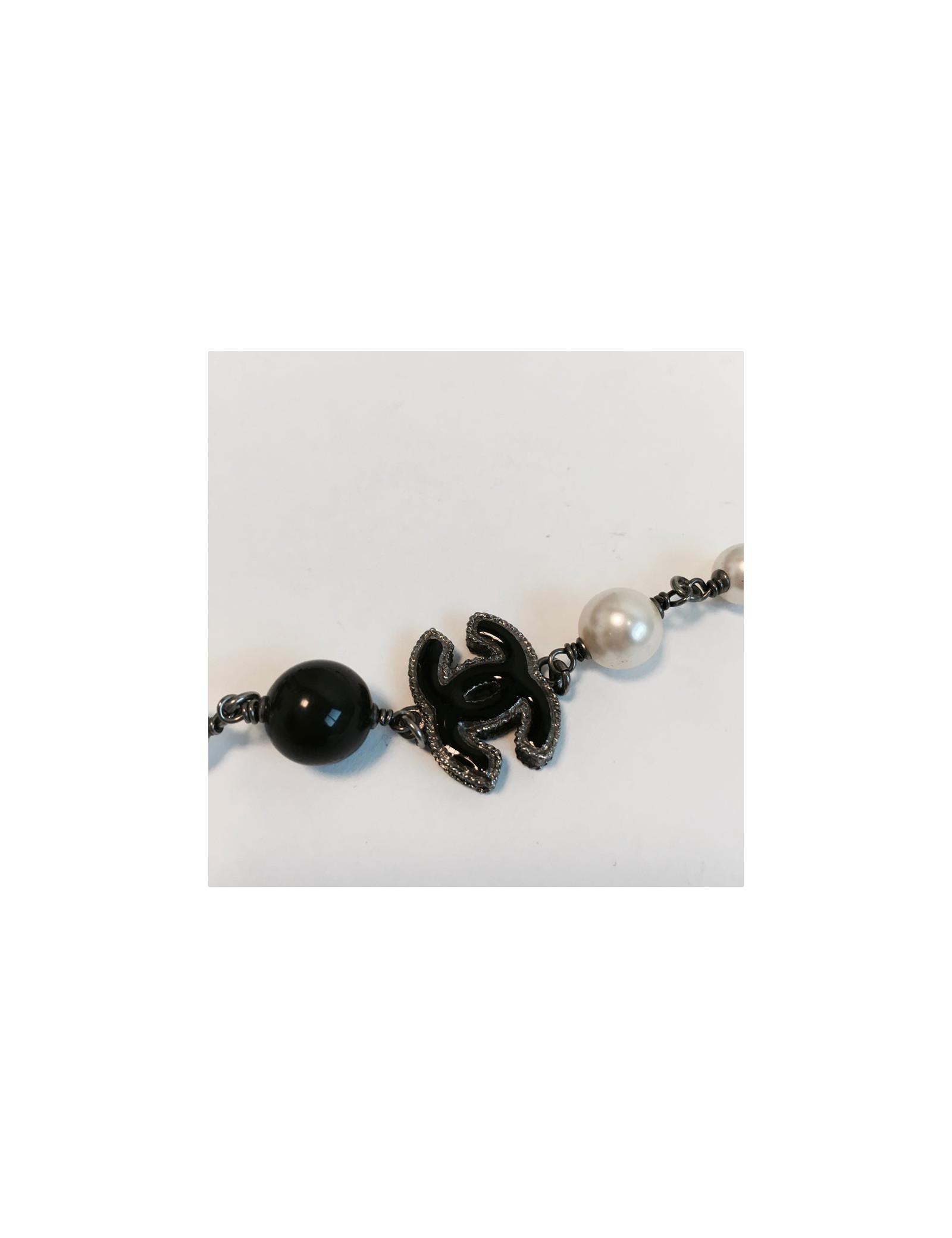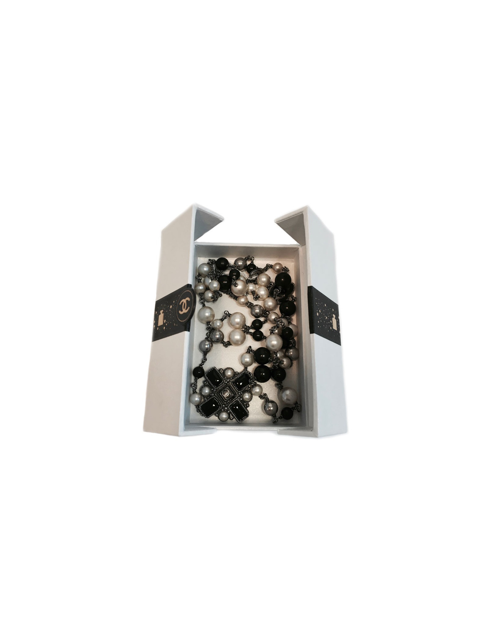 Superbe sautoir CHANEL en ruthénium et perles nacrées blanches, grises et noires. Une croix en émail noir et sertie de demi perles nacrées et un CC en émail noir. Jamais porté.