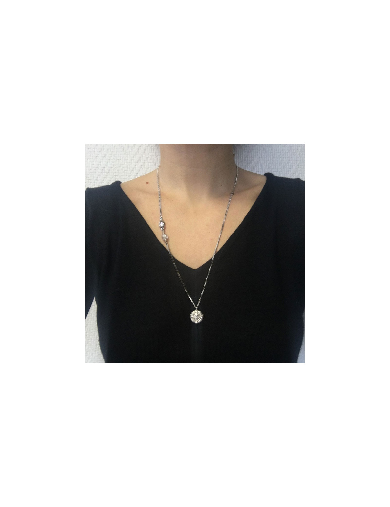 Collier CHANEL en métal argenté, pendentif rond avec un CC en son centre et 4 brillants. Perles transparentes et strass biseauté sur la chaîne. Jamais porté.