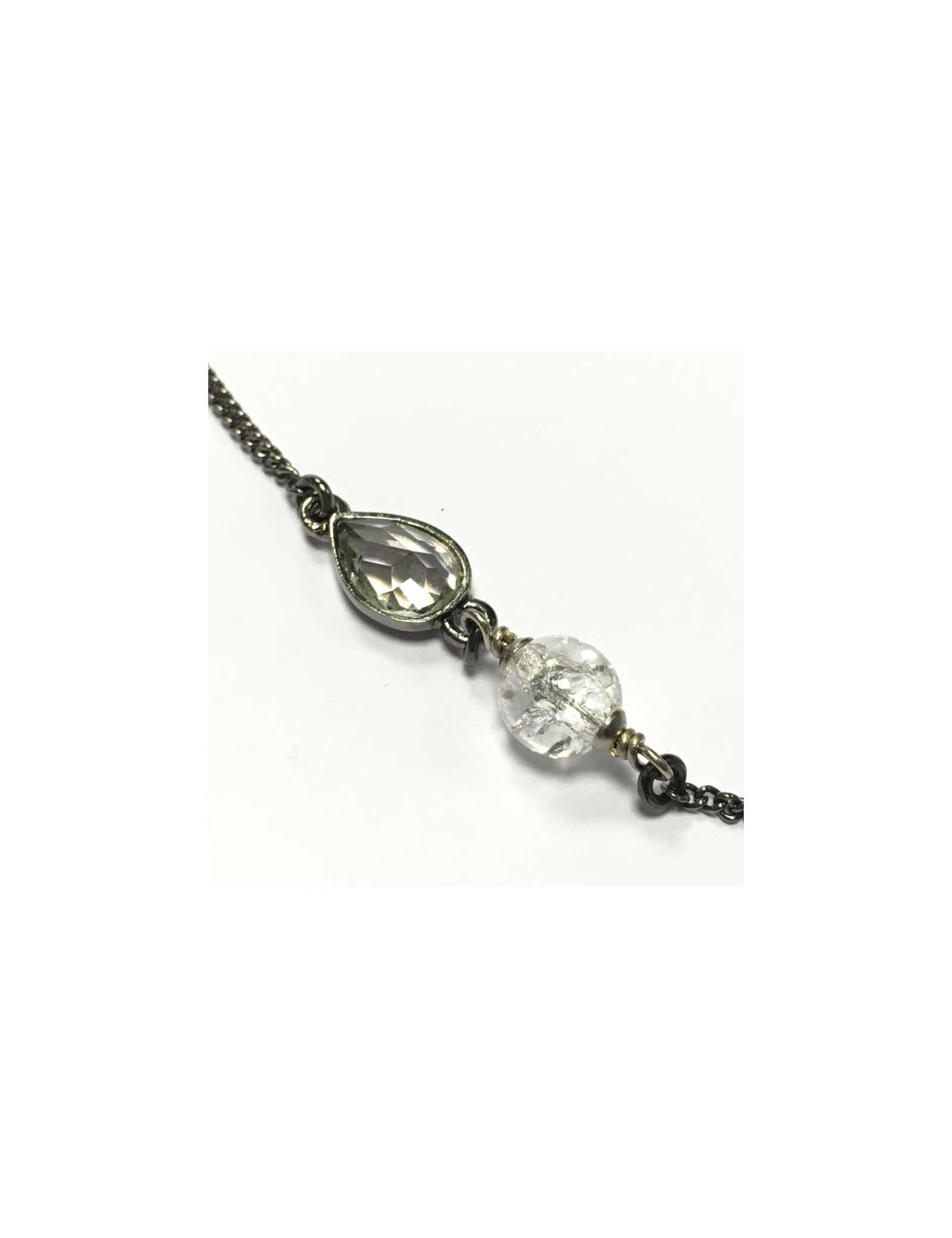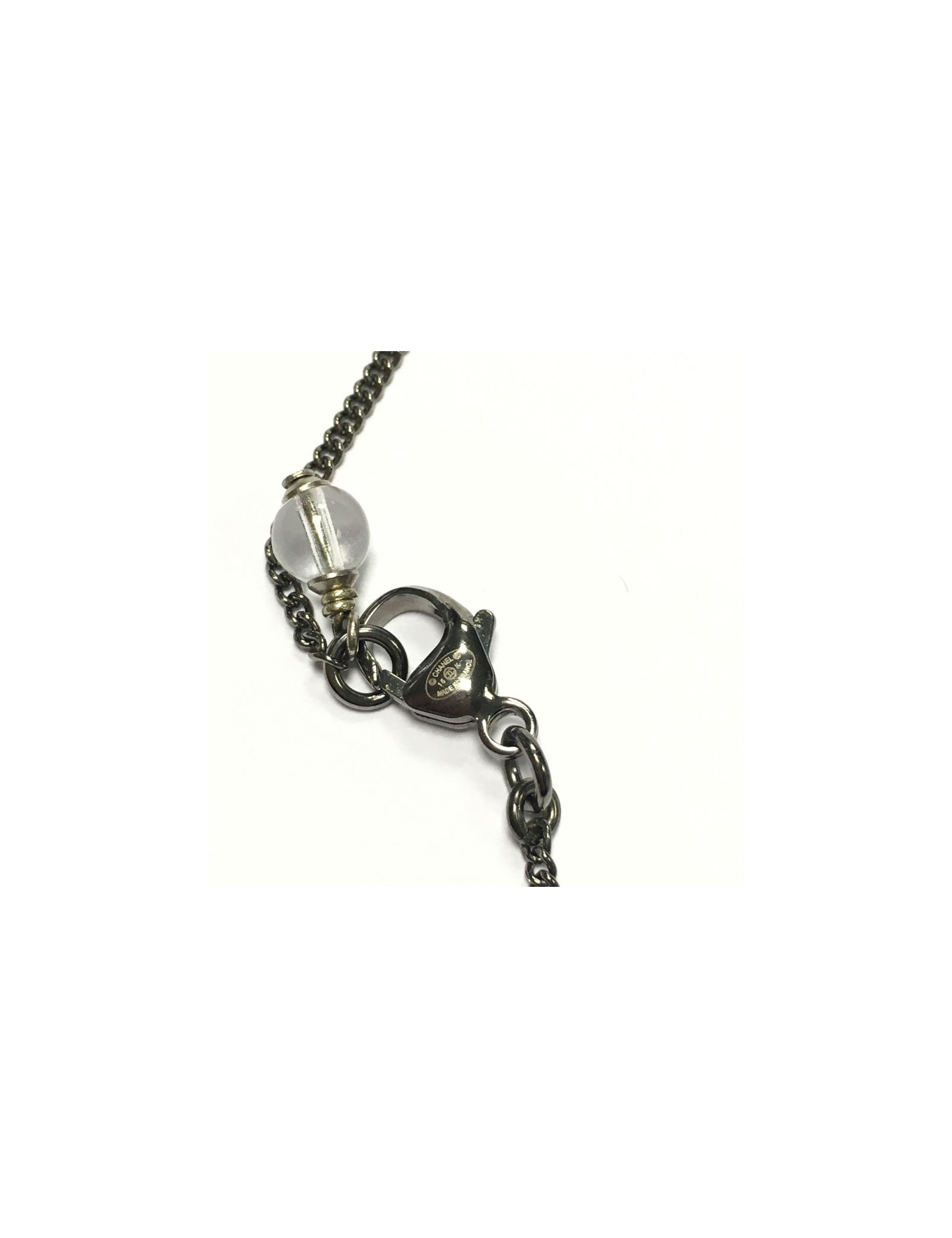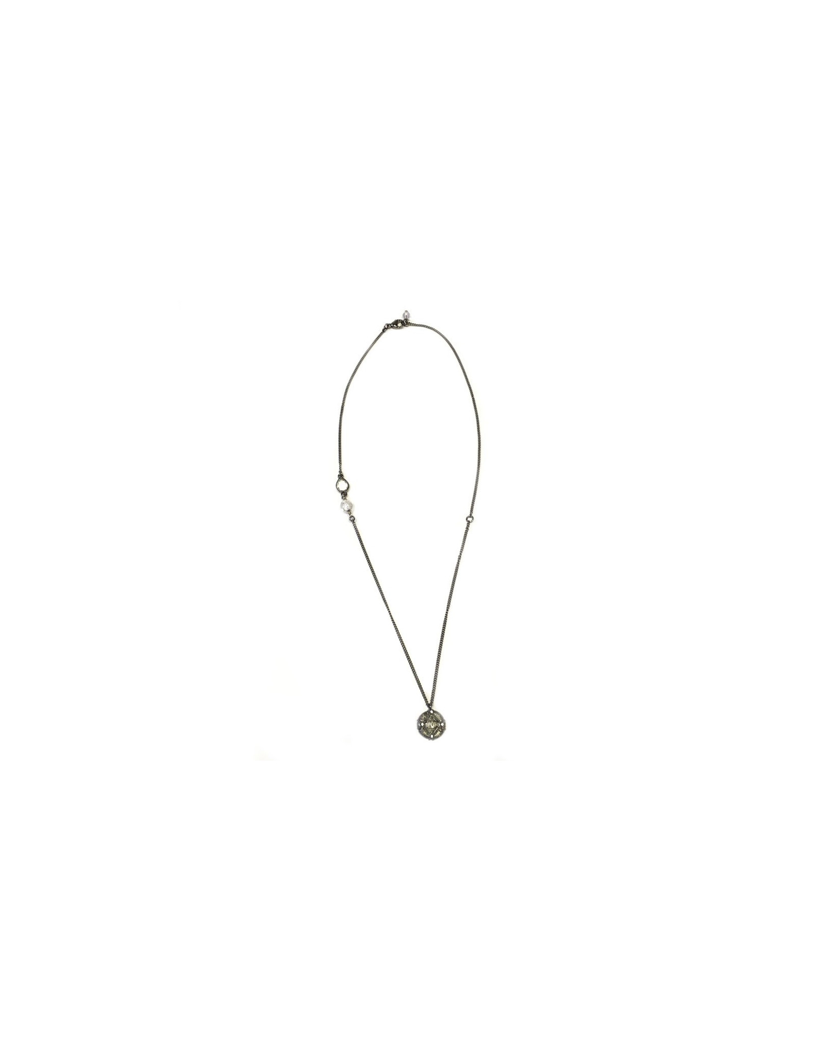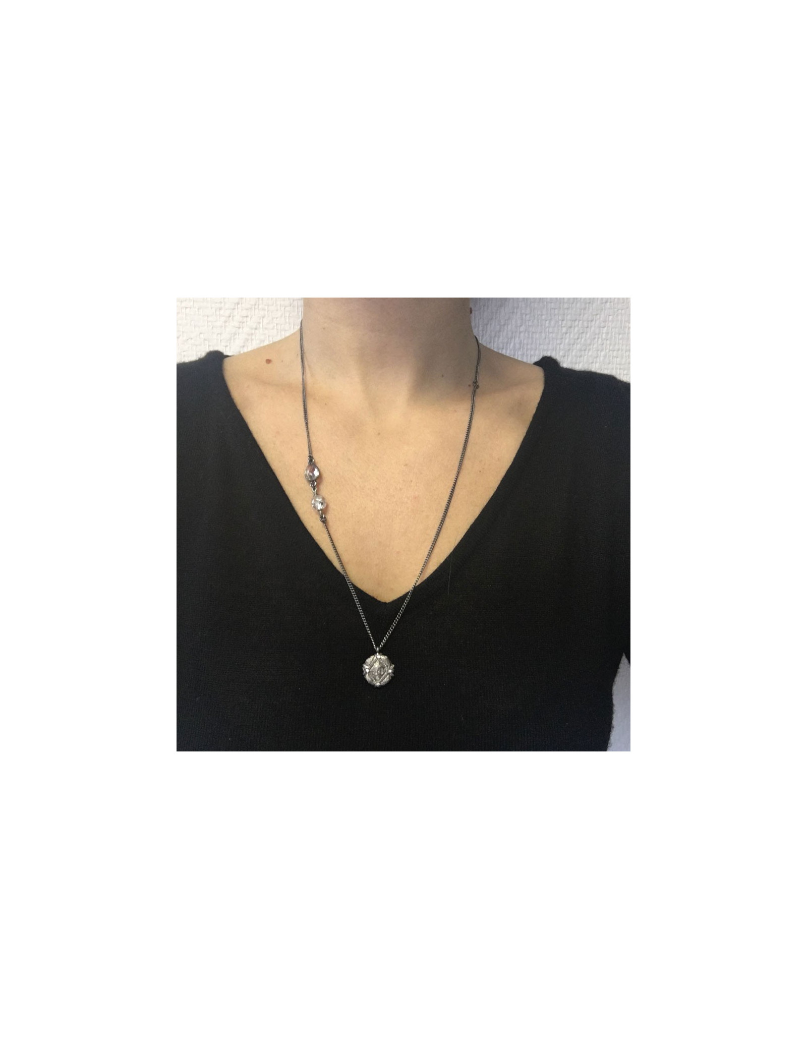 Collier CHANEL en argent noirci (ruthénium), pendentif rond avec un petit CC en son centre et 4 brillants. Perle transparente et strass biseauté sur la chaîne. Jamais porté.