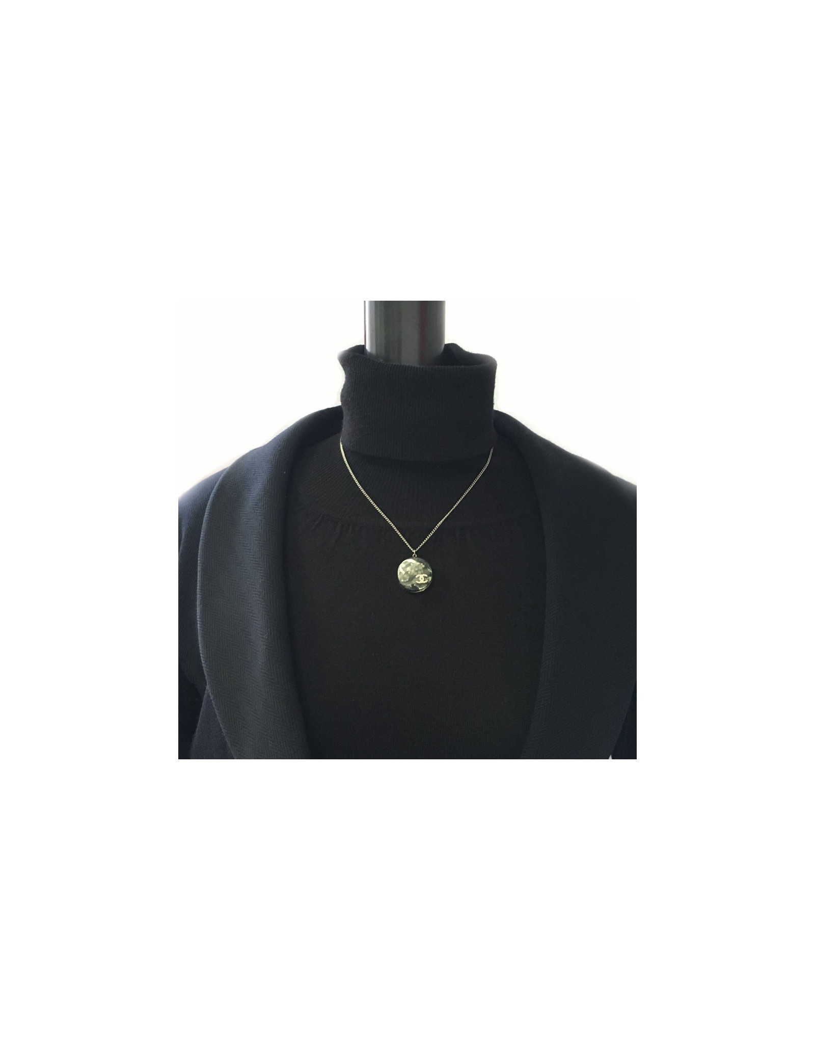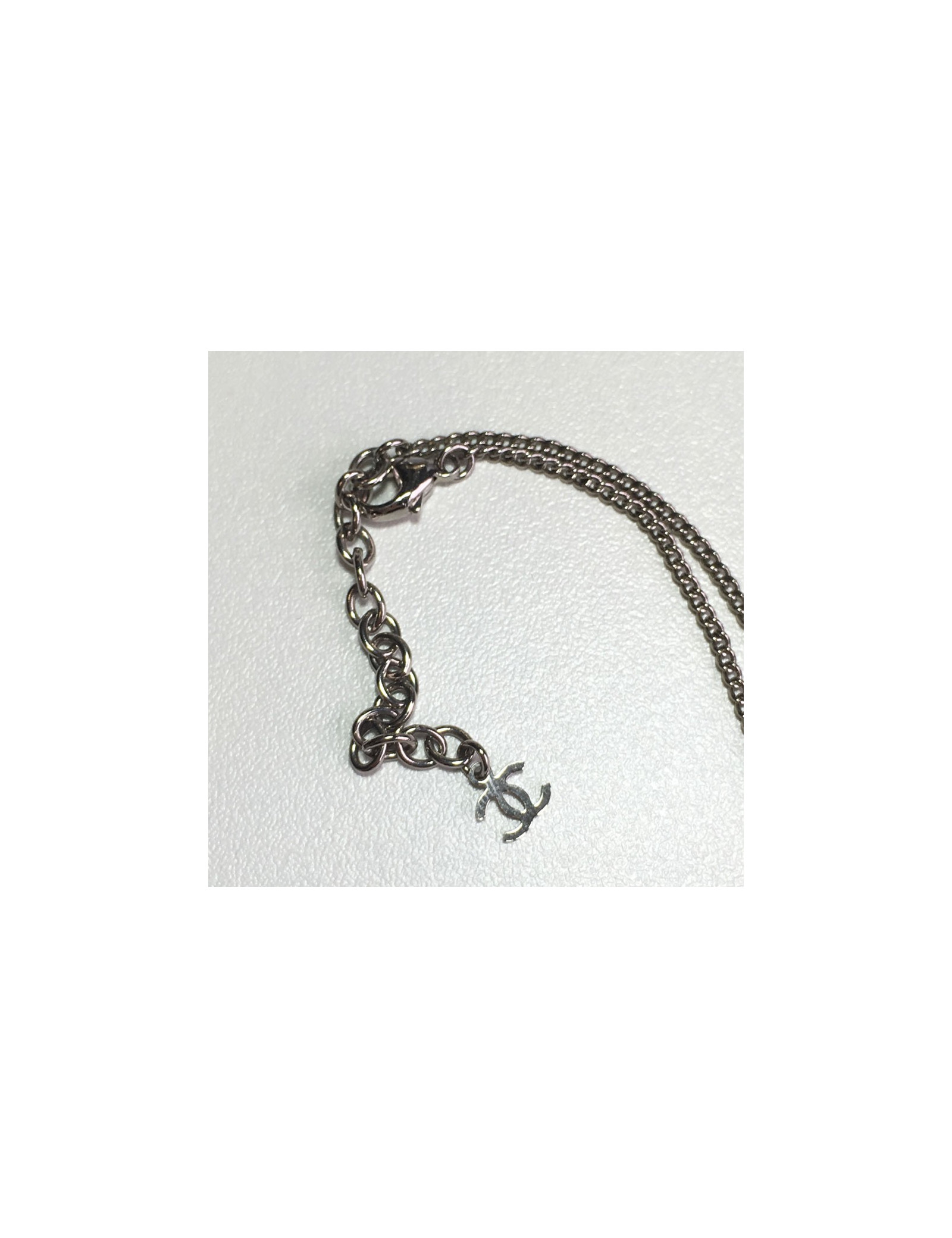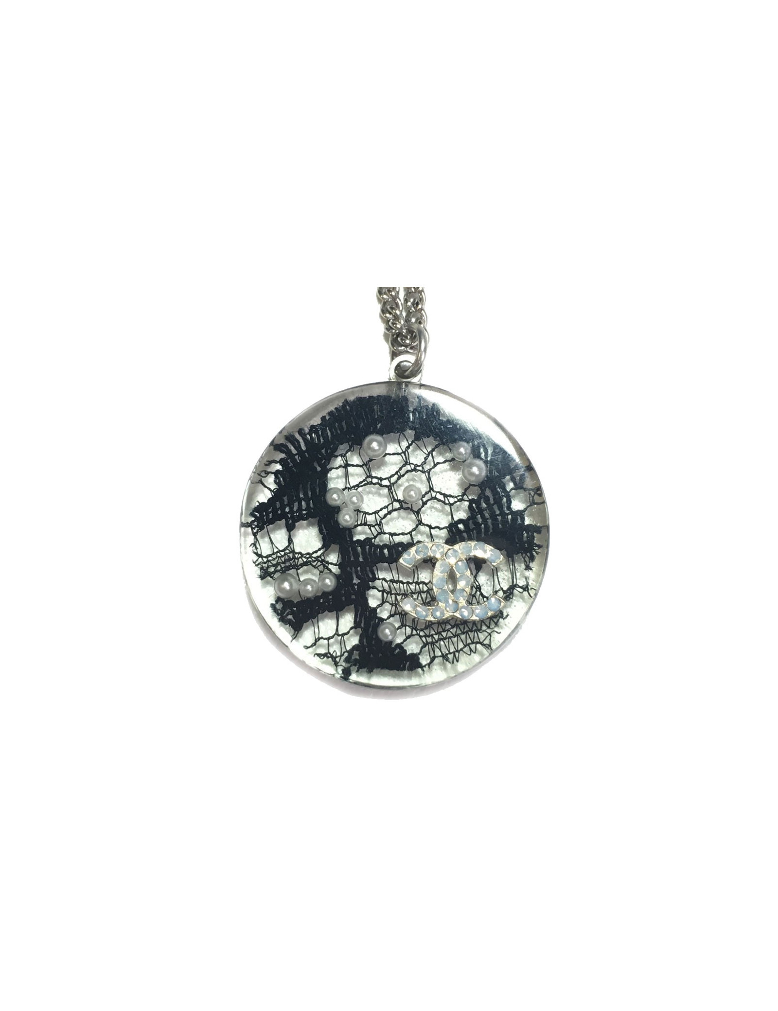 Collier CHANEL en plexi avec inclusion de dentelle et perles. Chaine en métal argenté. le tag n'est plus sur la chaîne.