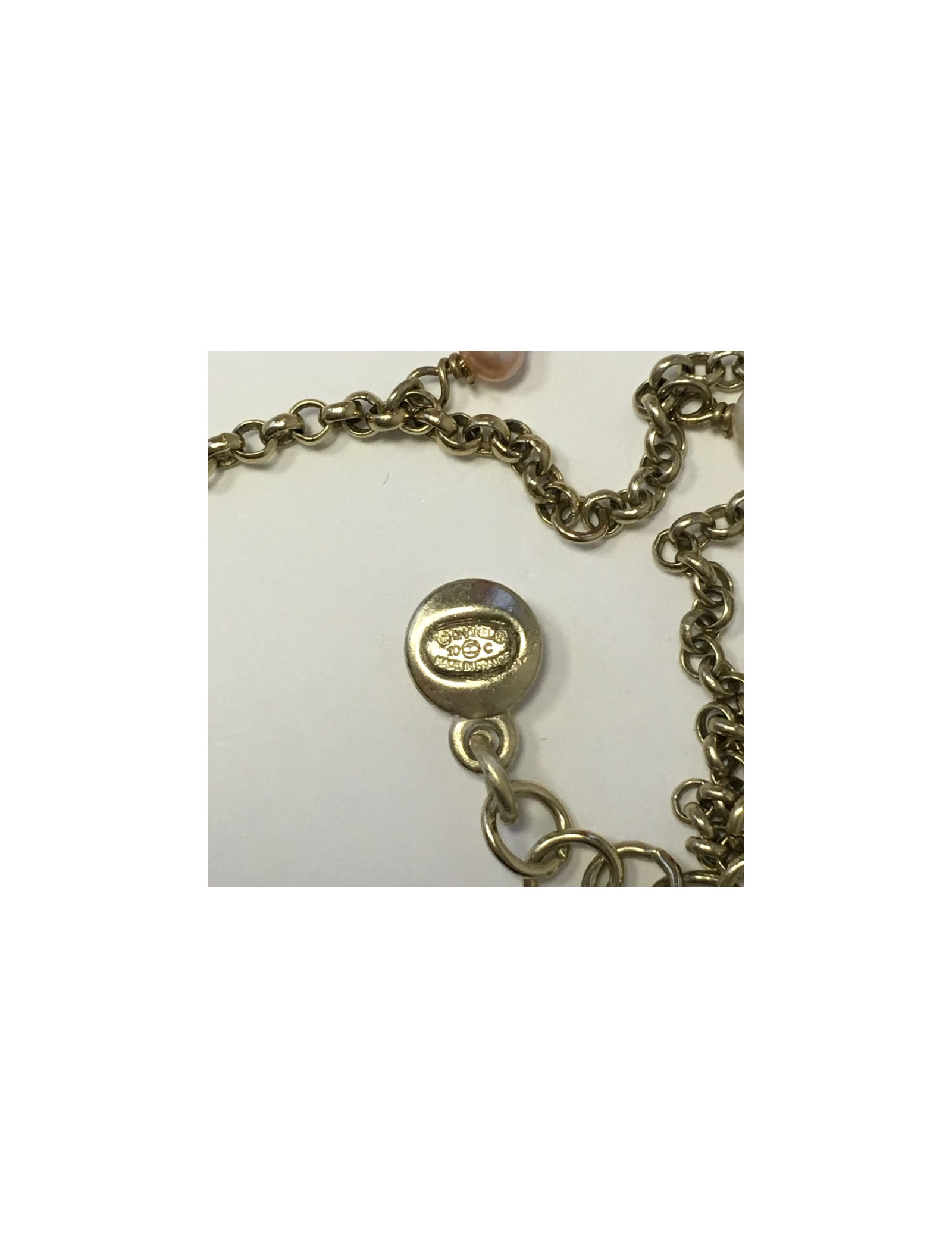 Très beau collier CHANEL en métal doré, pendentif fleur orné de strass et perles dans les tons roses. La chaîne est agrémentée d'un CC doré et de petites perles rosées, blanches et nacrées.