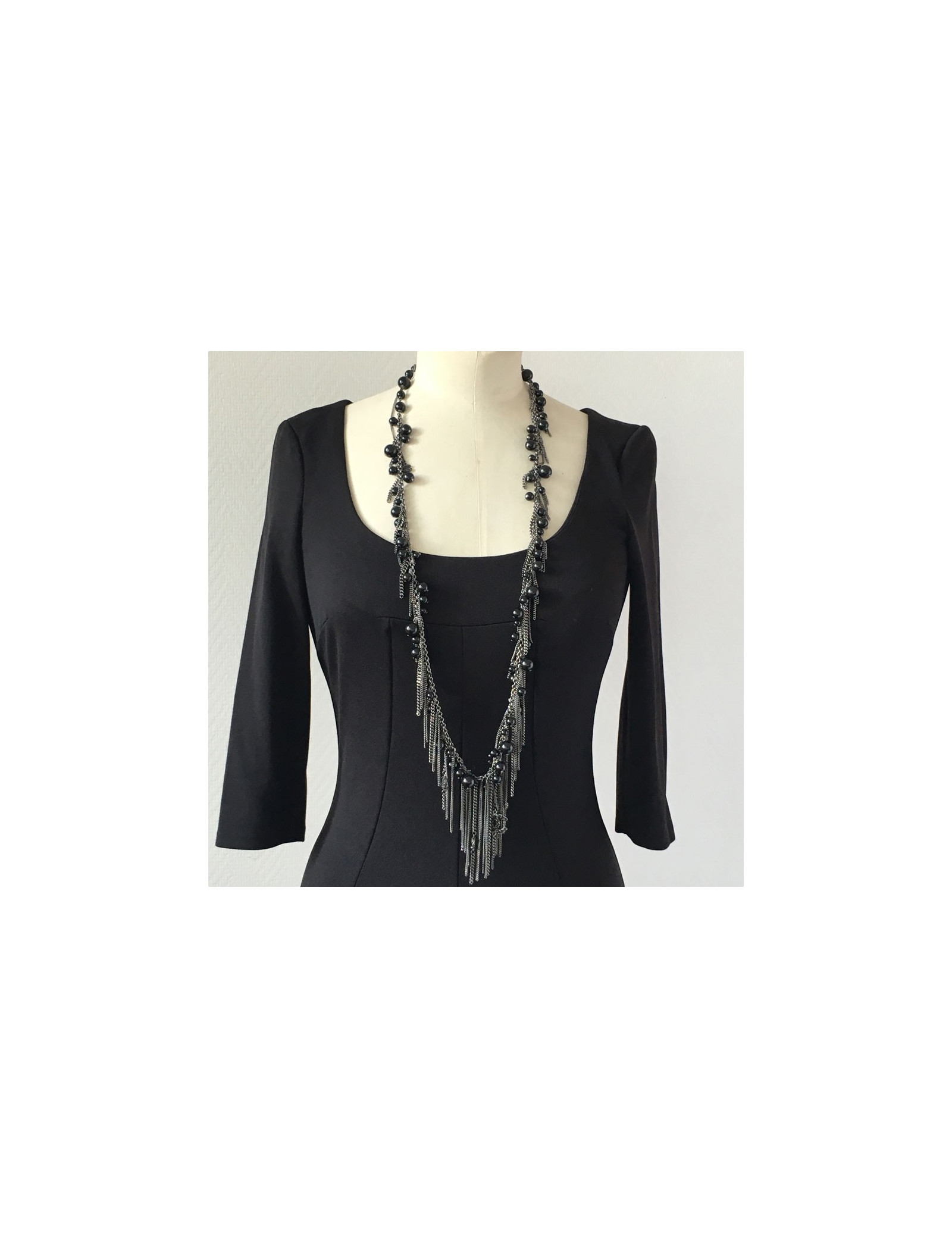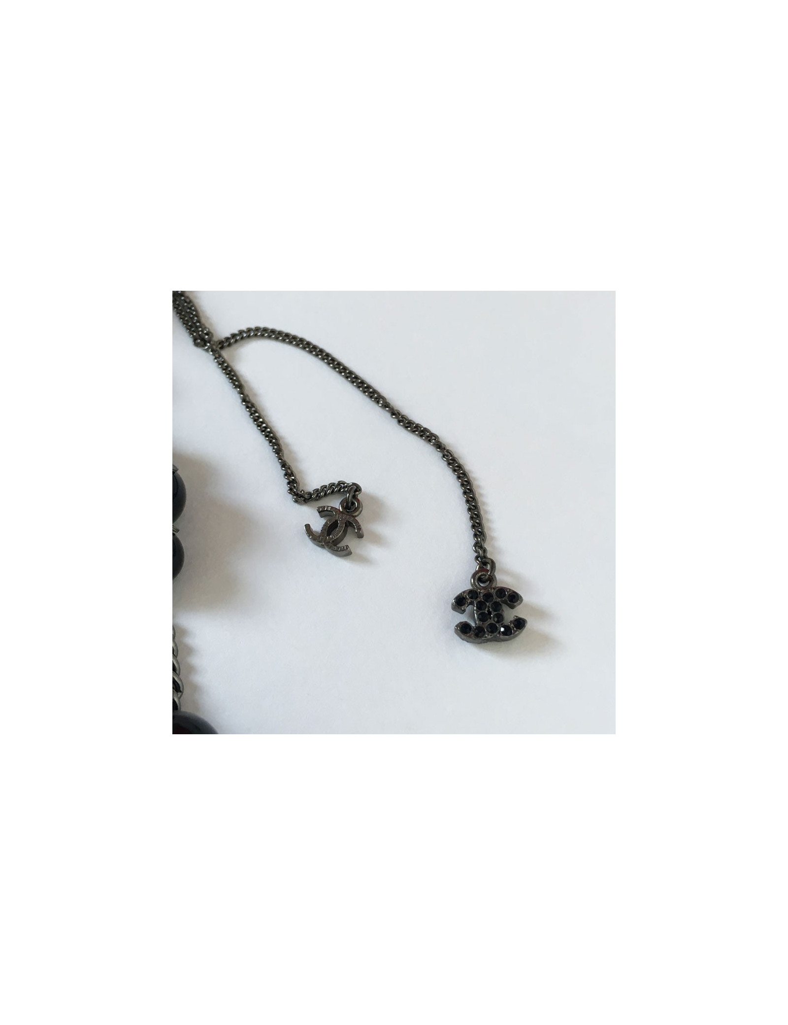 Sautoir CHANEL perles noires et chaînes argentées