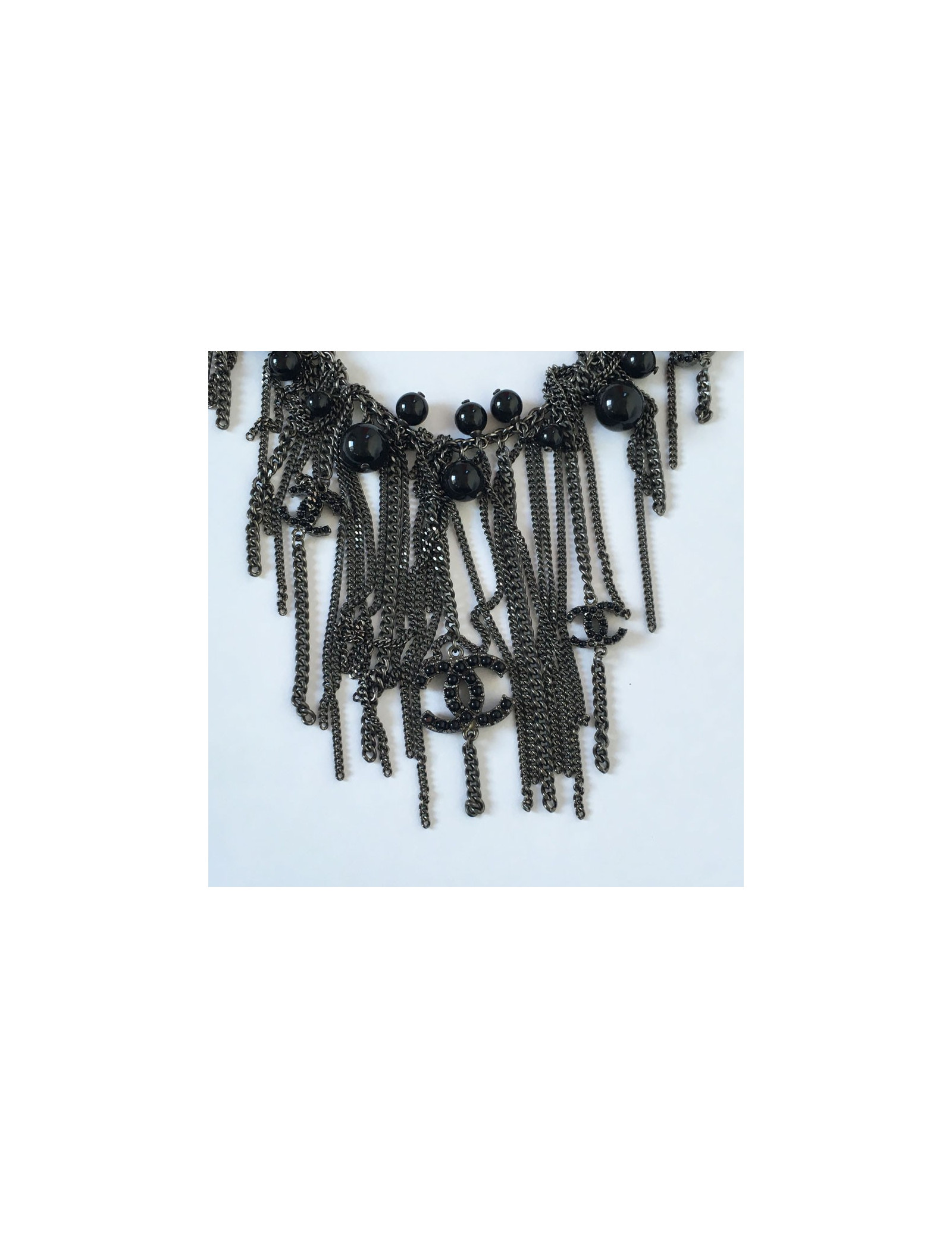 Magnifique sautoir CHANEL en chaîne, perles noires et multiples petites chaînes pendantes argentées. 5 CC ornés de petites perles noires. Jamais porté.