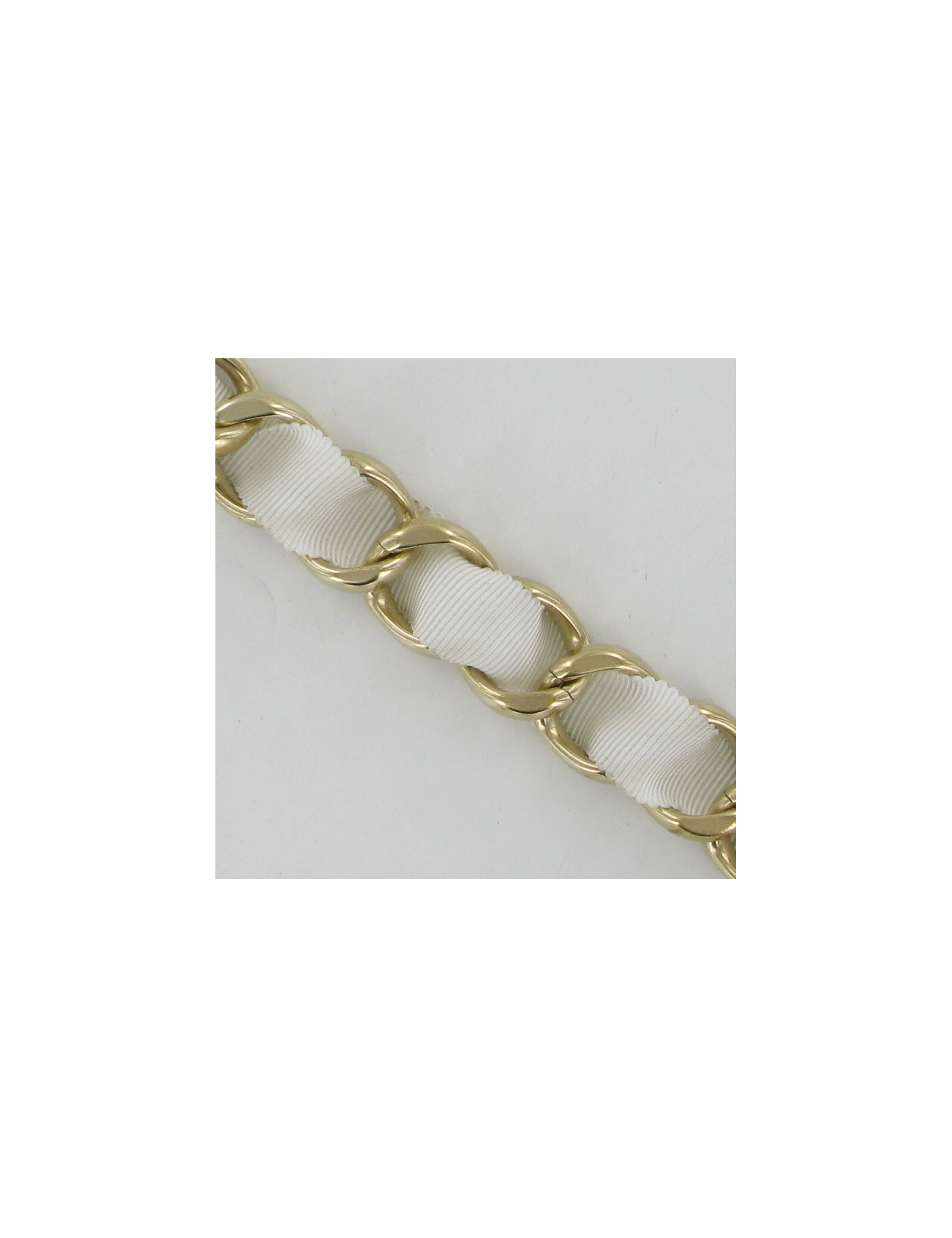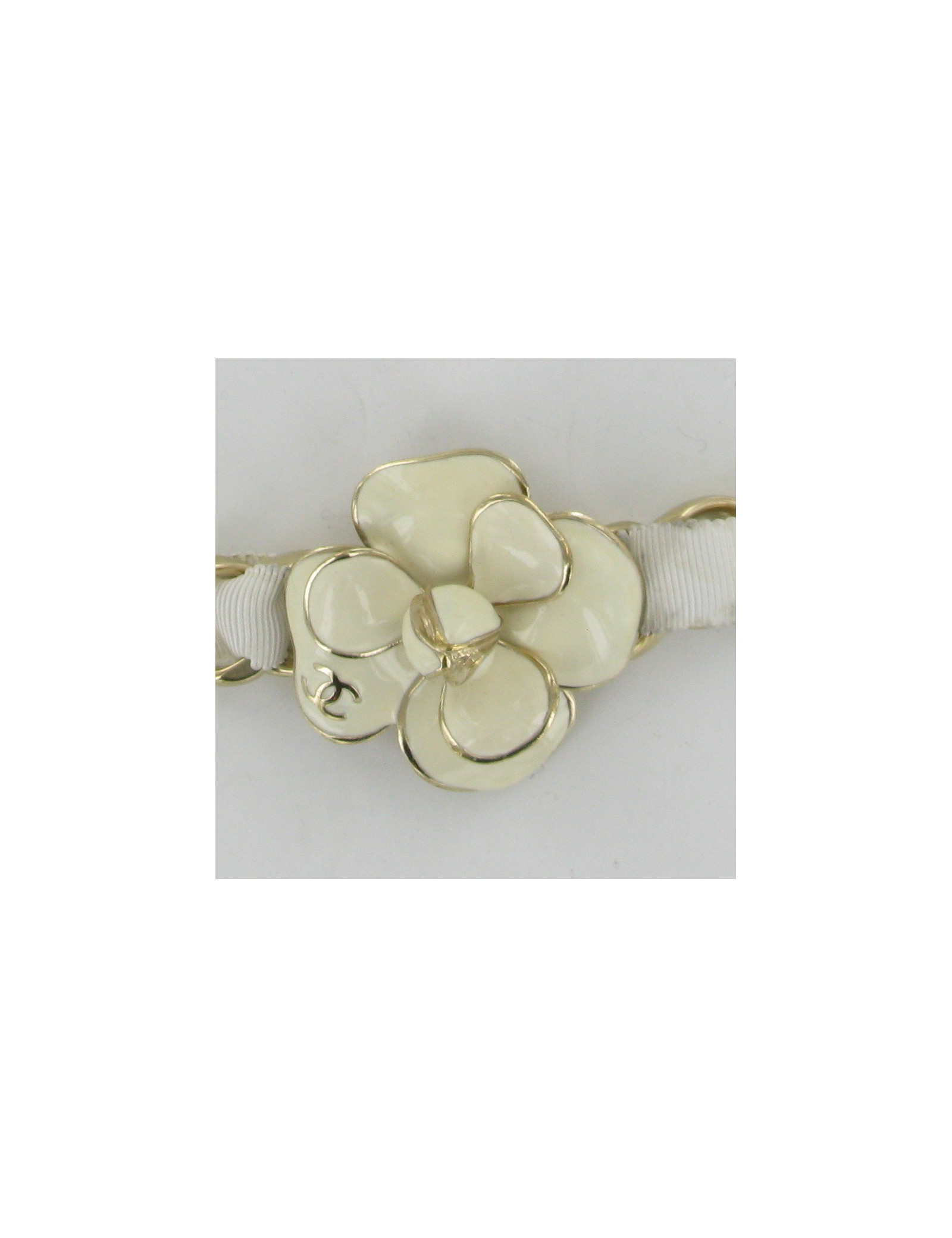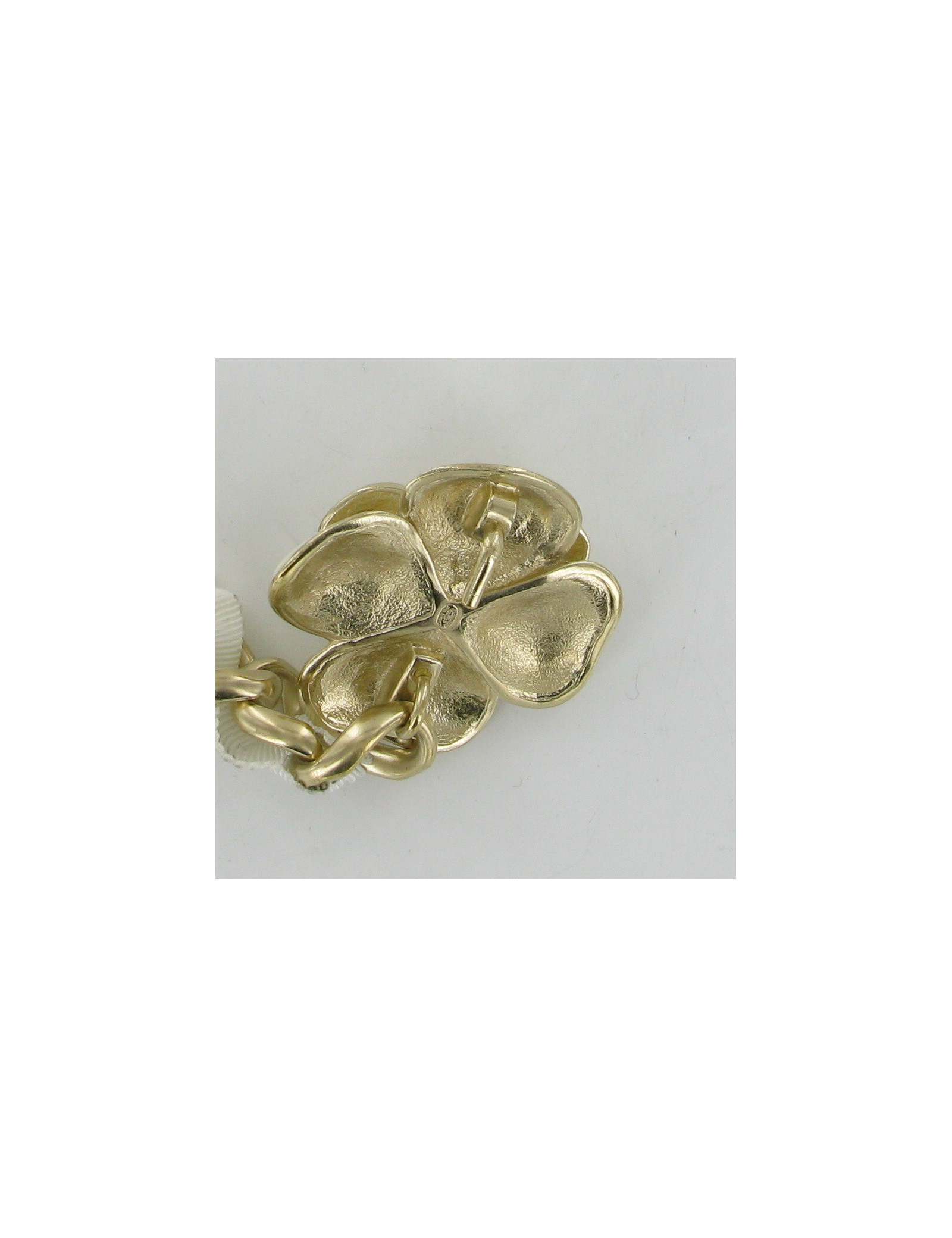 Chaîne en métal dorée et tissu blanc, Camélia en métal doré émaillé de blanc cassé.