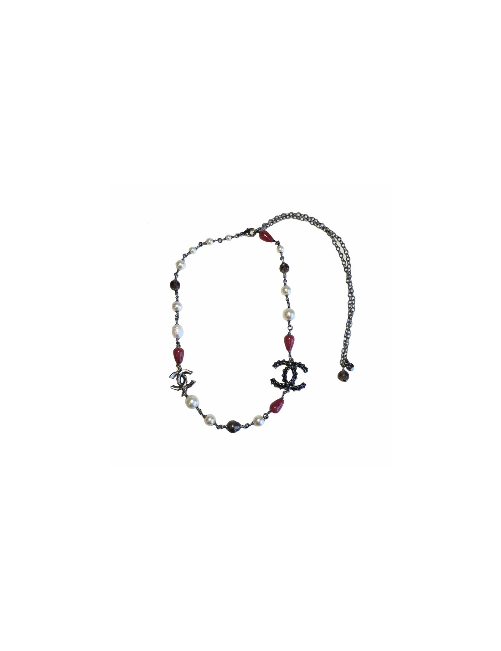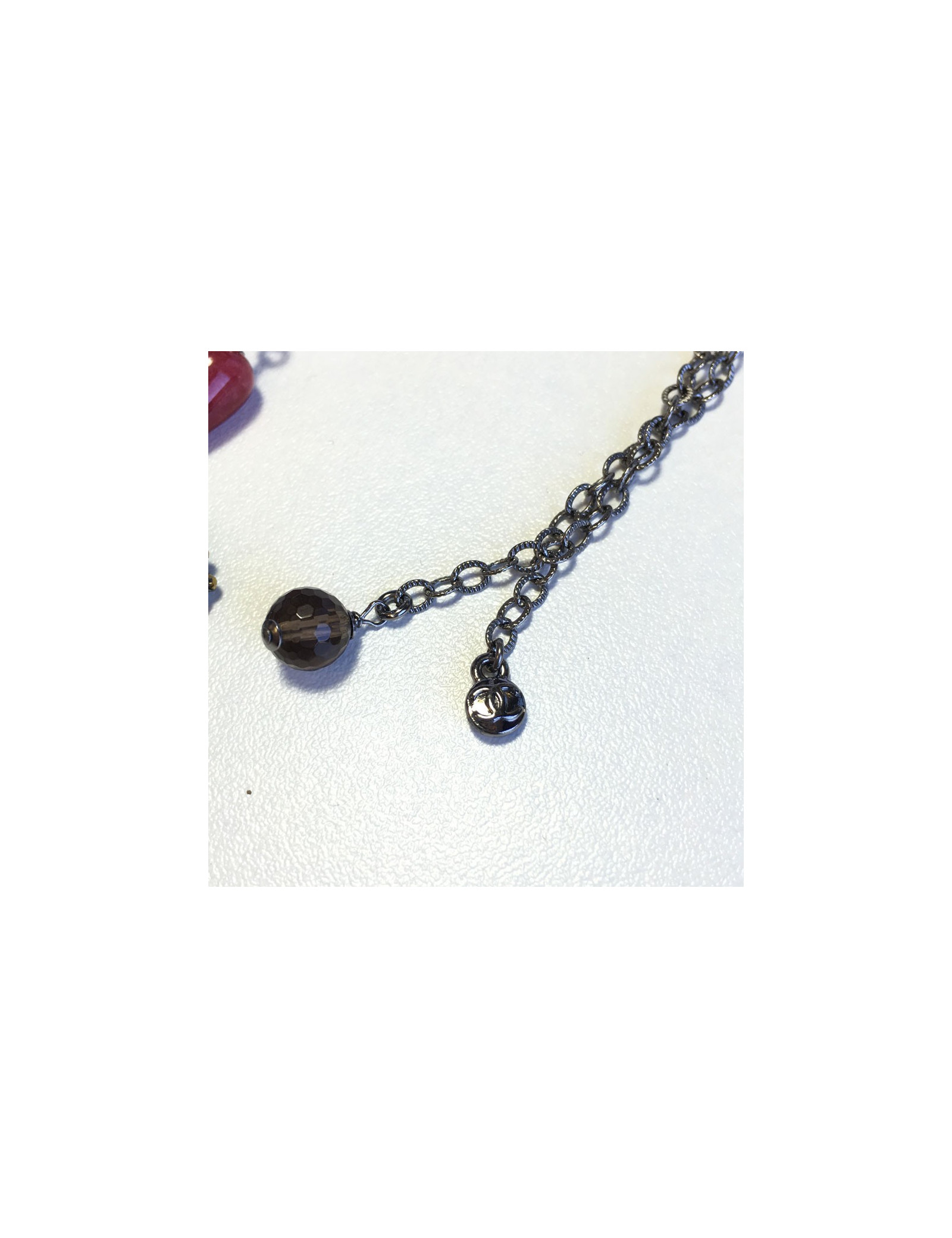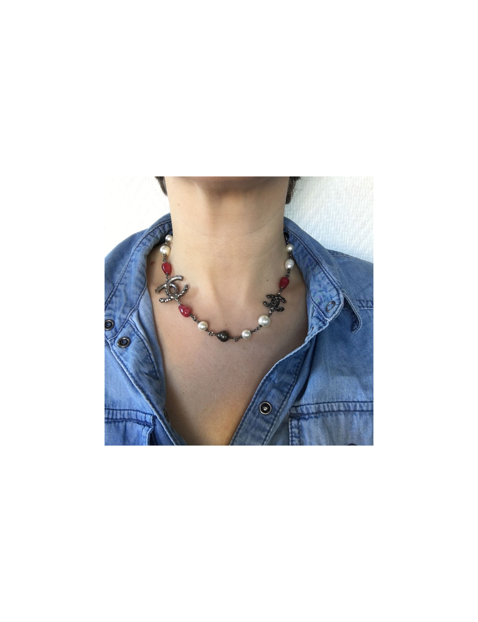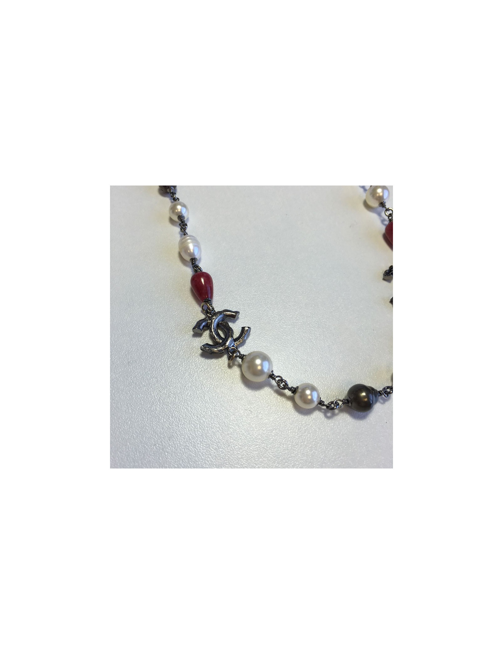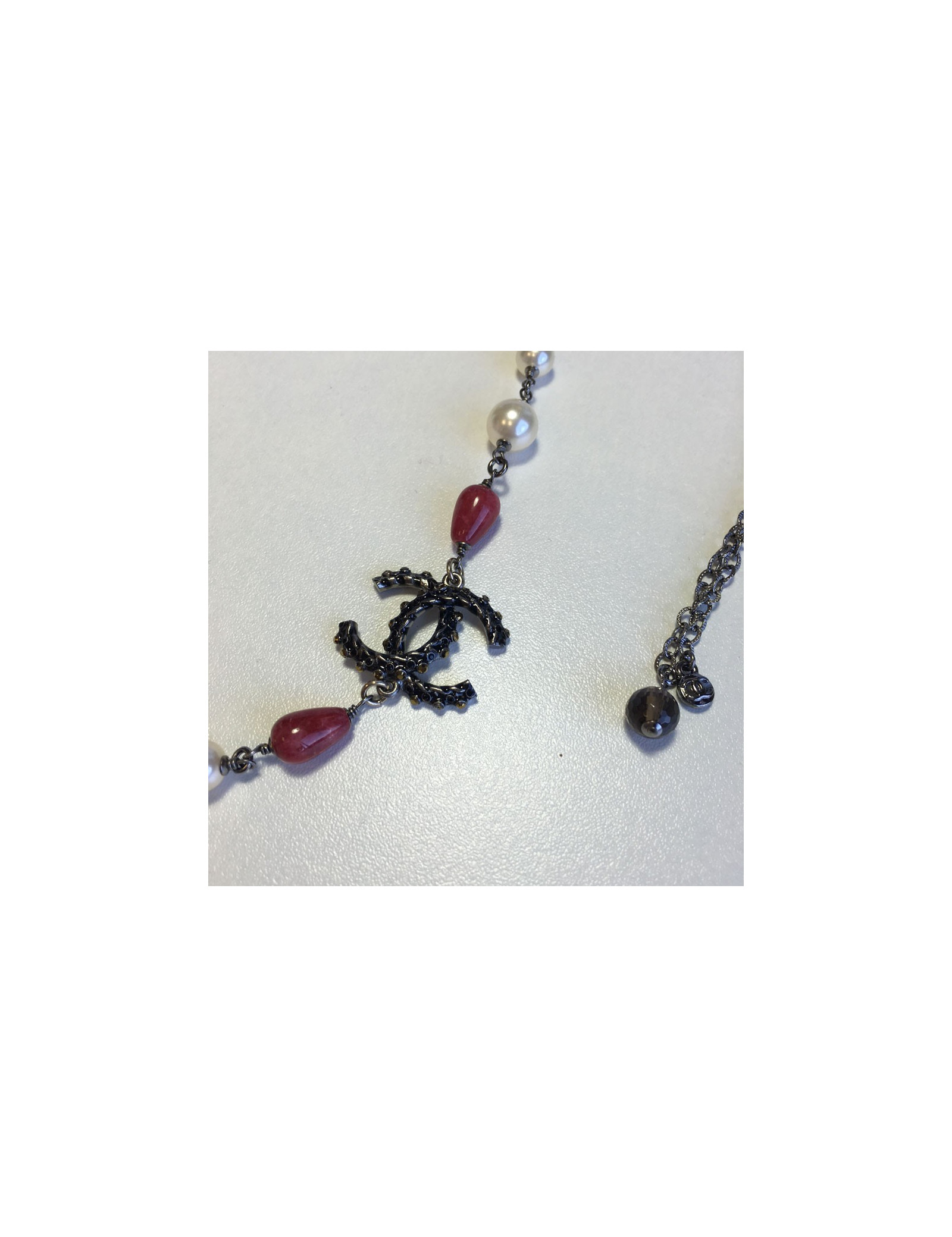 Collier CHANEL chaîne argentée, perles nacrées, perles roses et CC