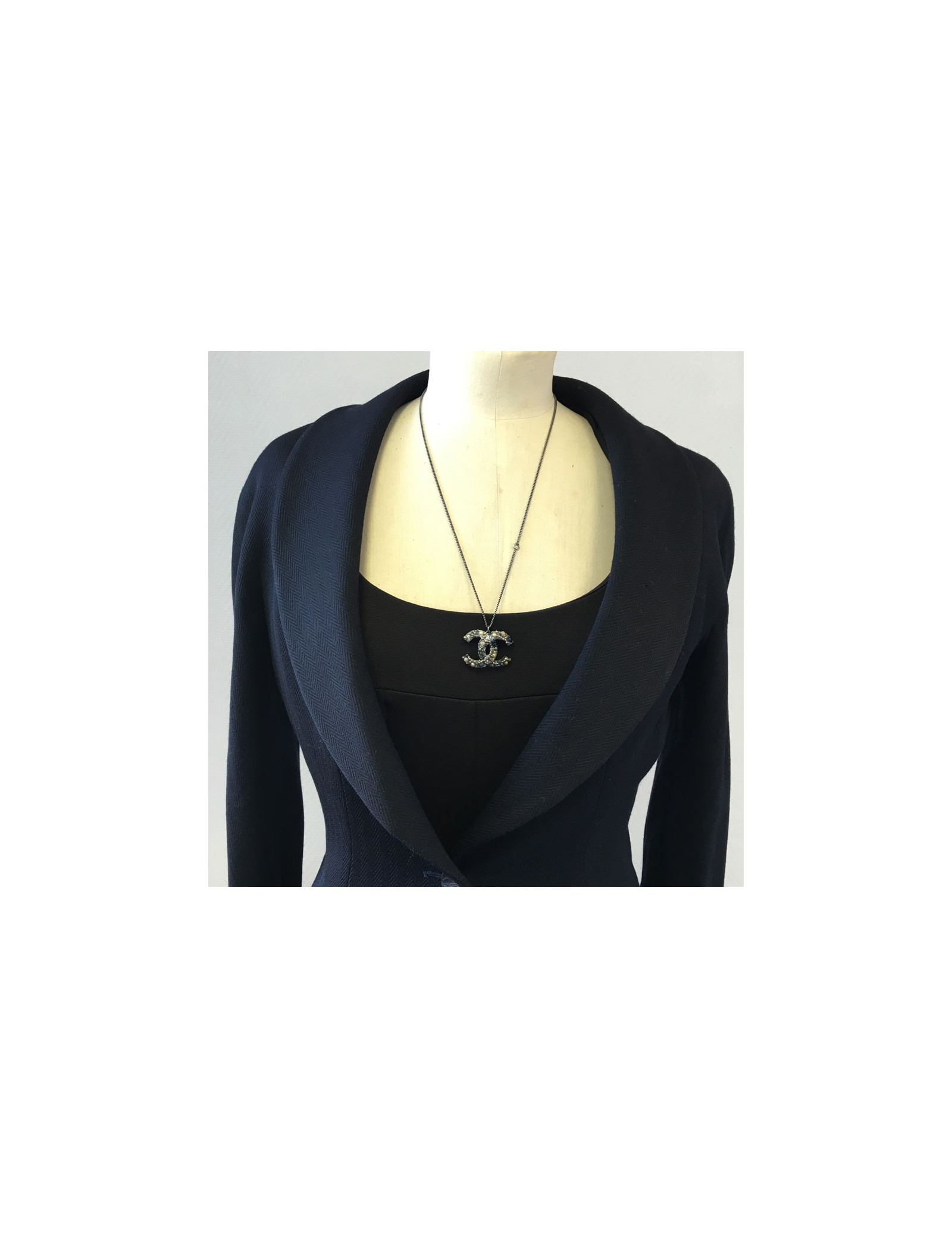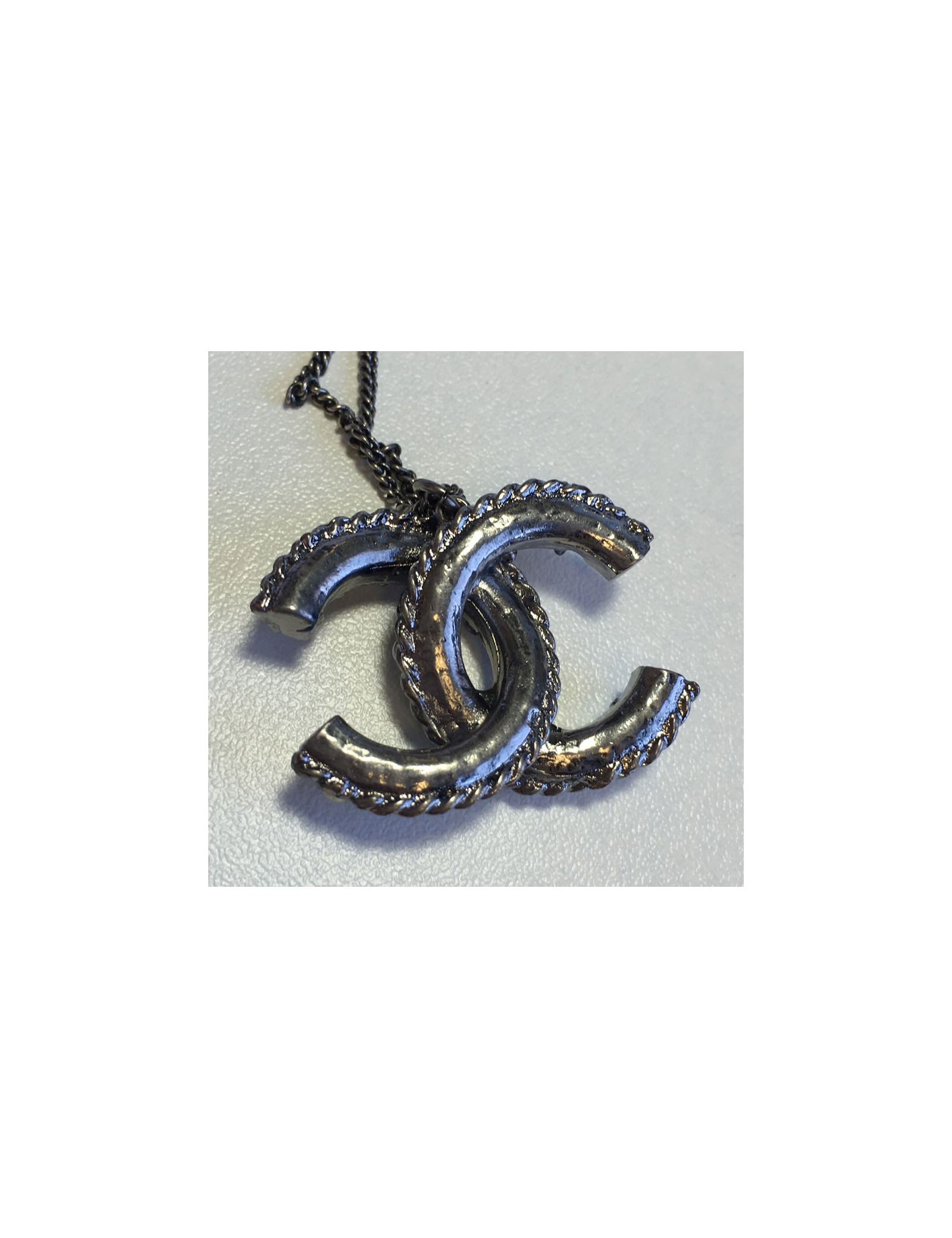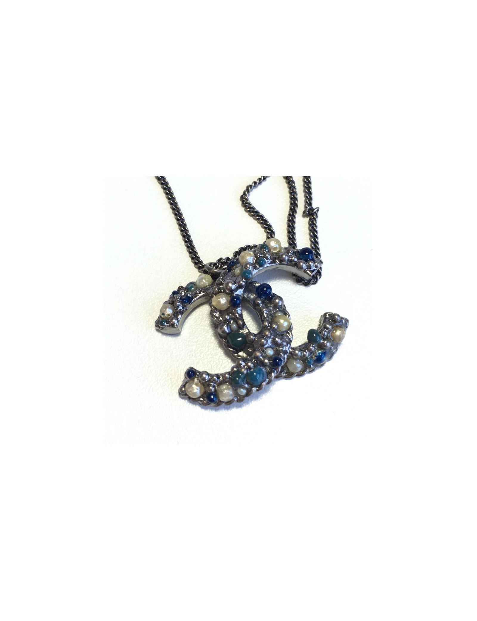 Collier CHANEL chaîne en métal argenté noirci et pendentif CC serti de perles nacrées, perles en résine de couleur. Jamais porté.