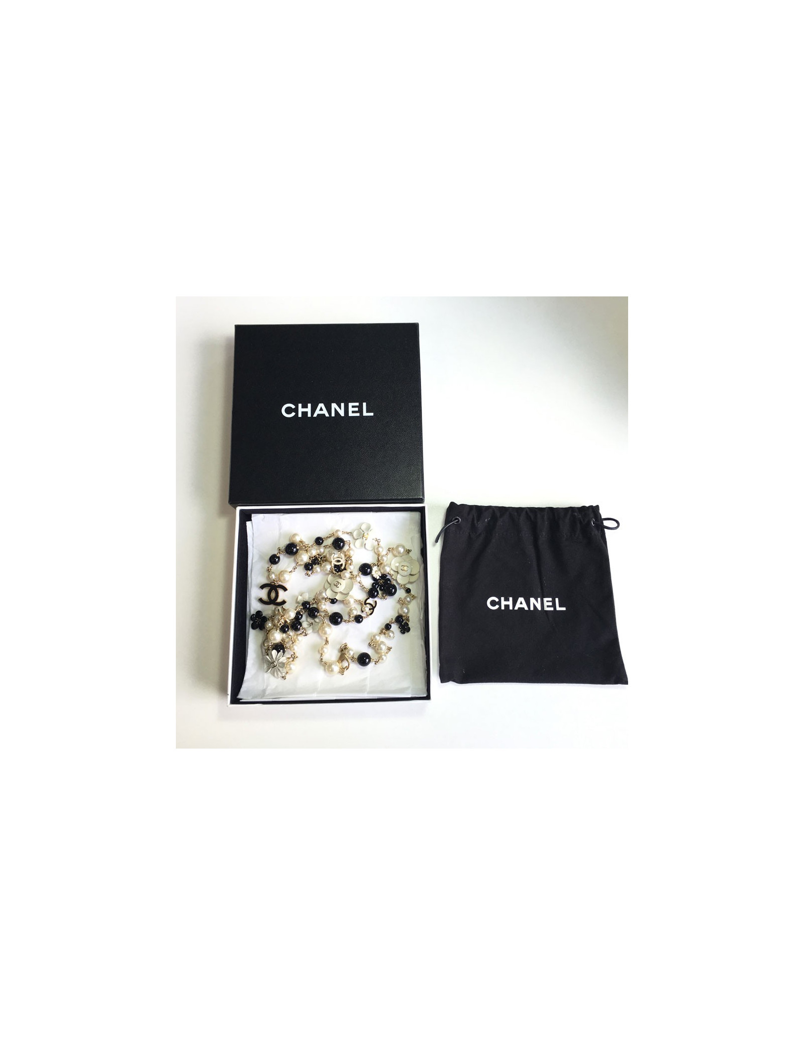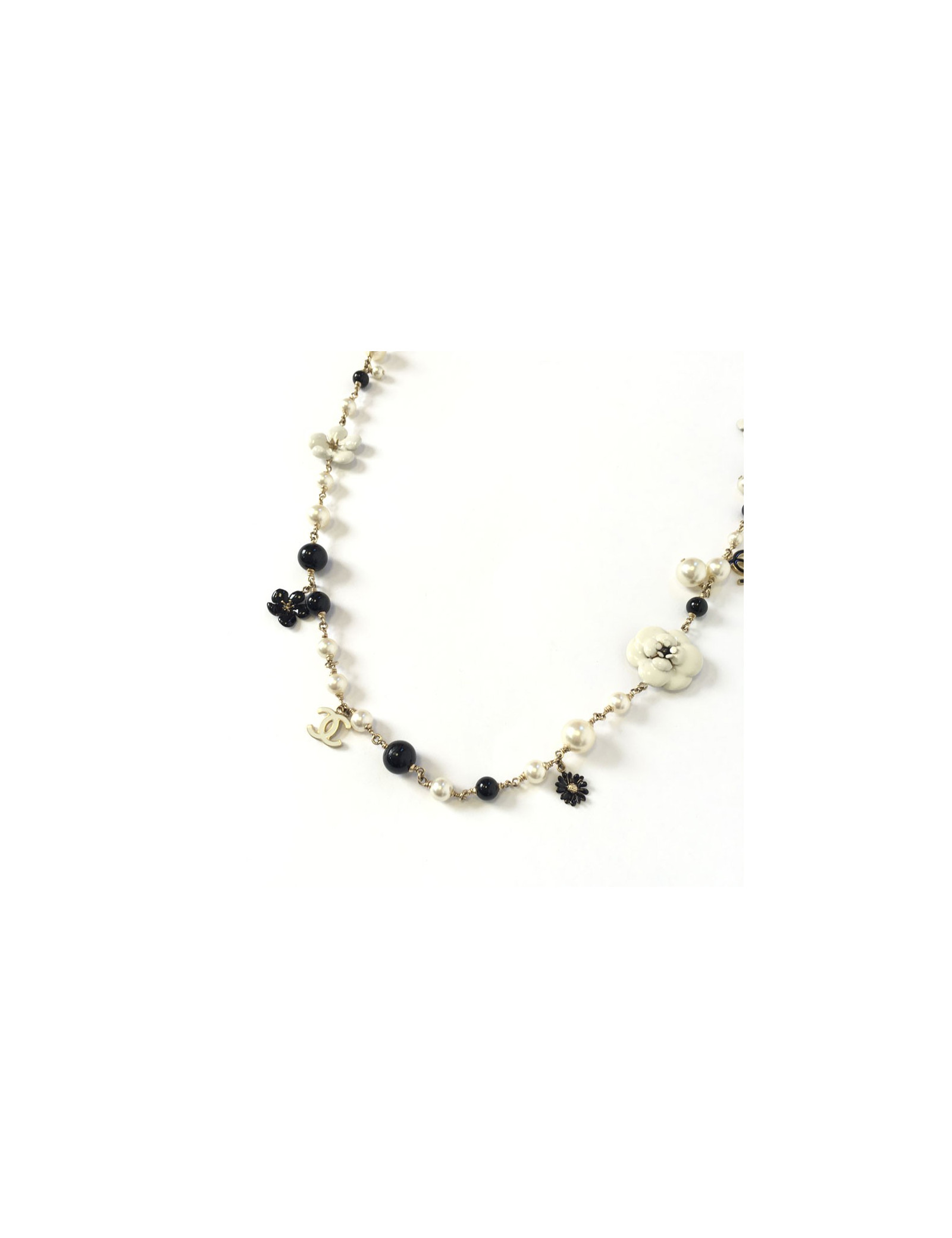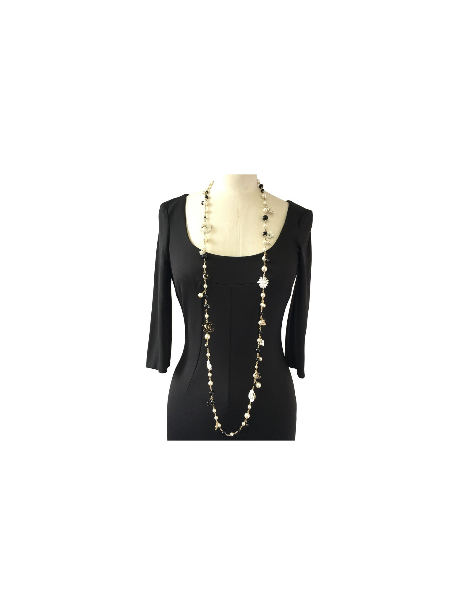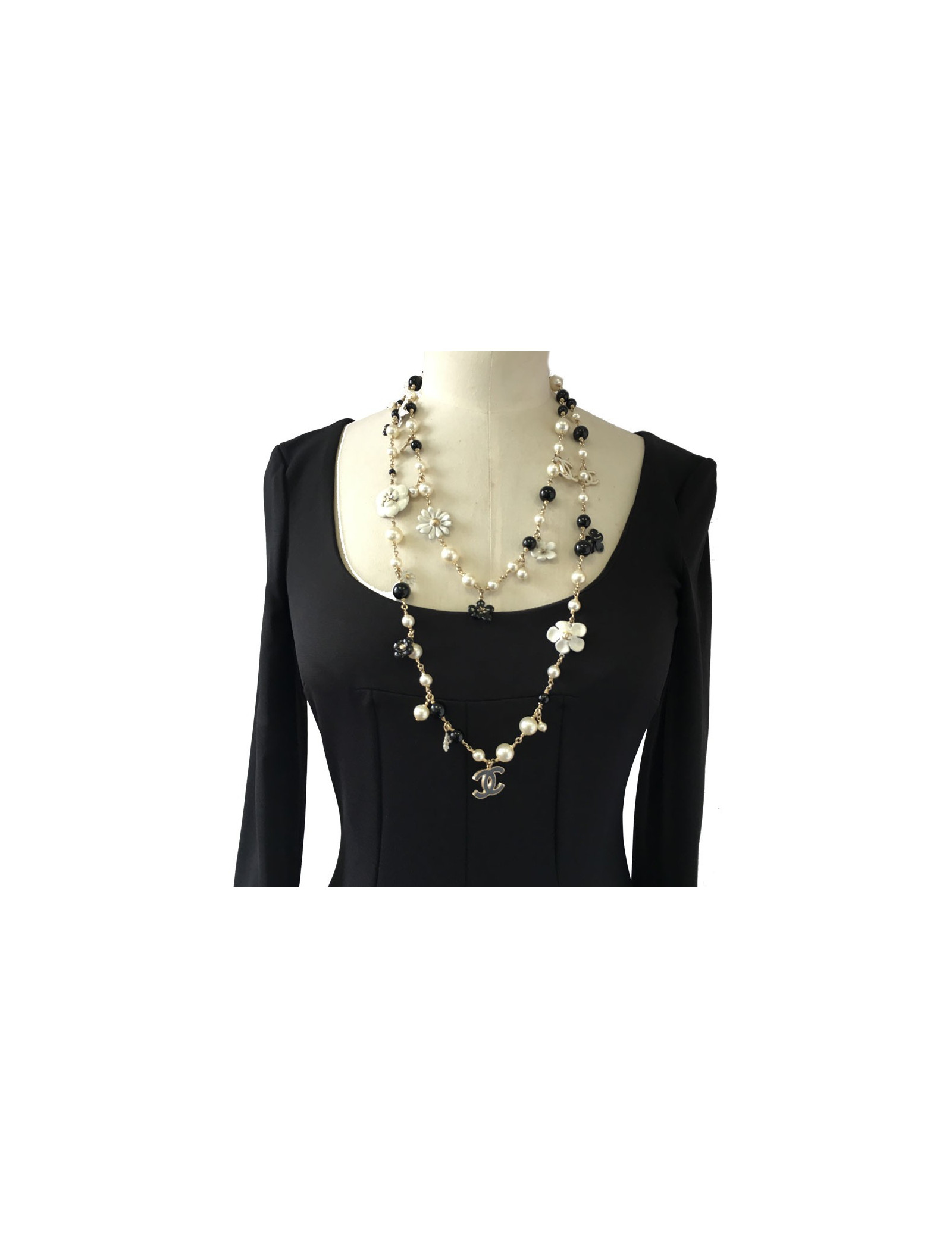 Magnifique sautoir couture CHANEL. Chaîne en métal doré, perles nacrées, noires, CC en émail noir et ivoire, camélia en émail ivoire.