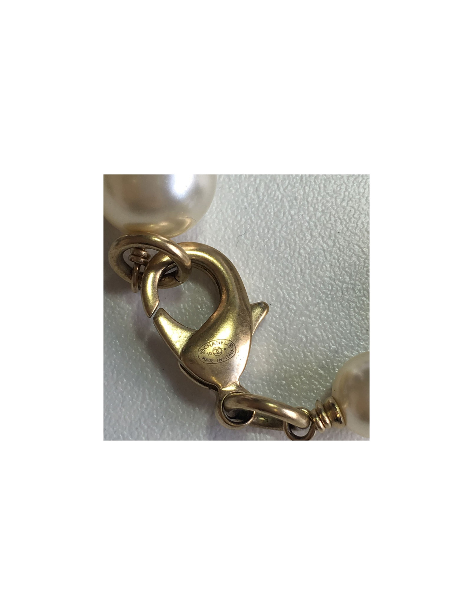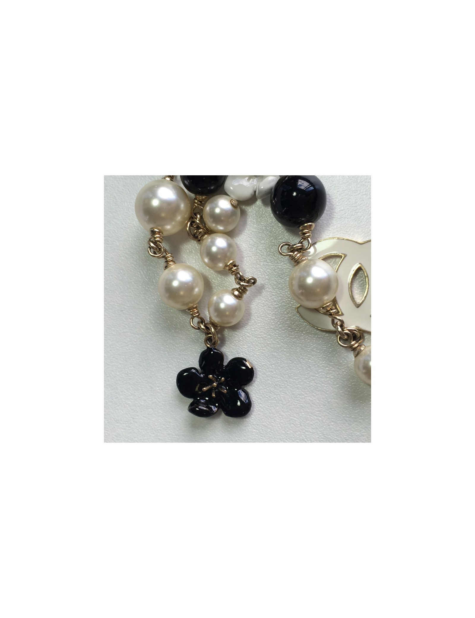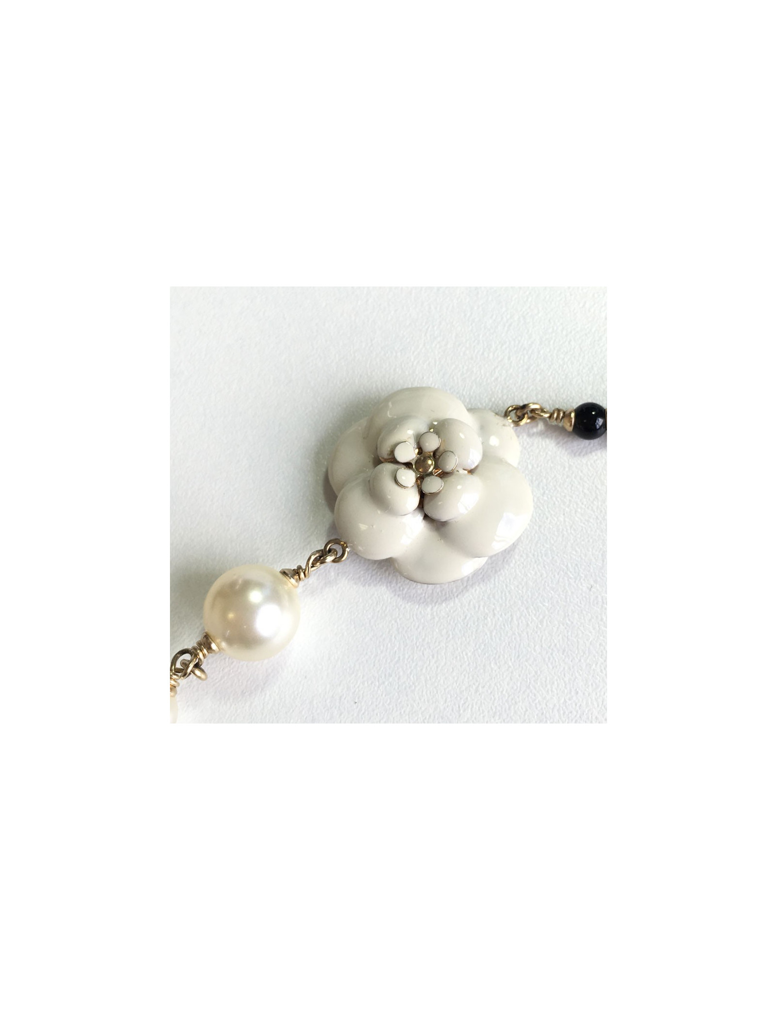 Sautoir CHANEL chaine dorée, perles nacrées et noires, camélia en émail