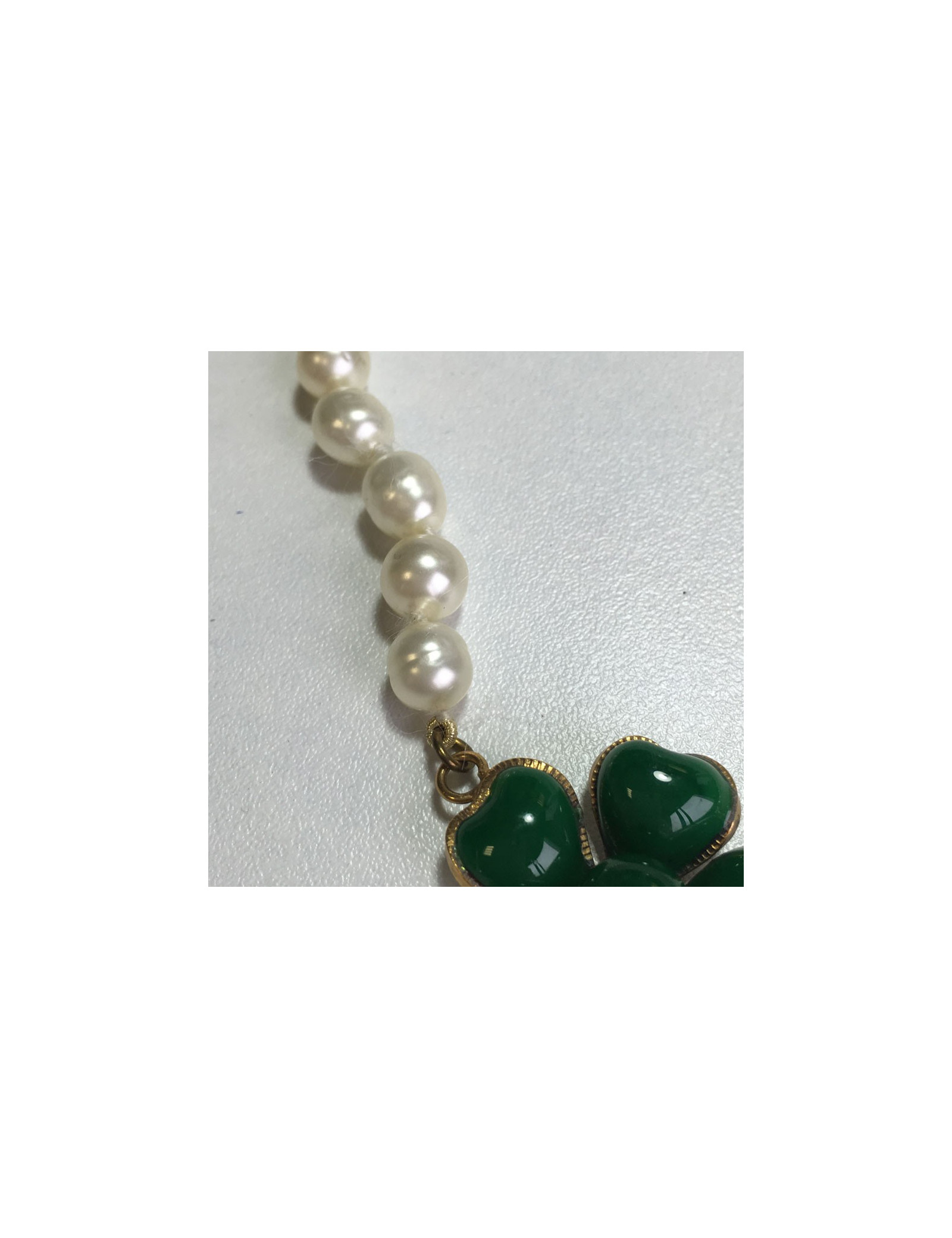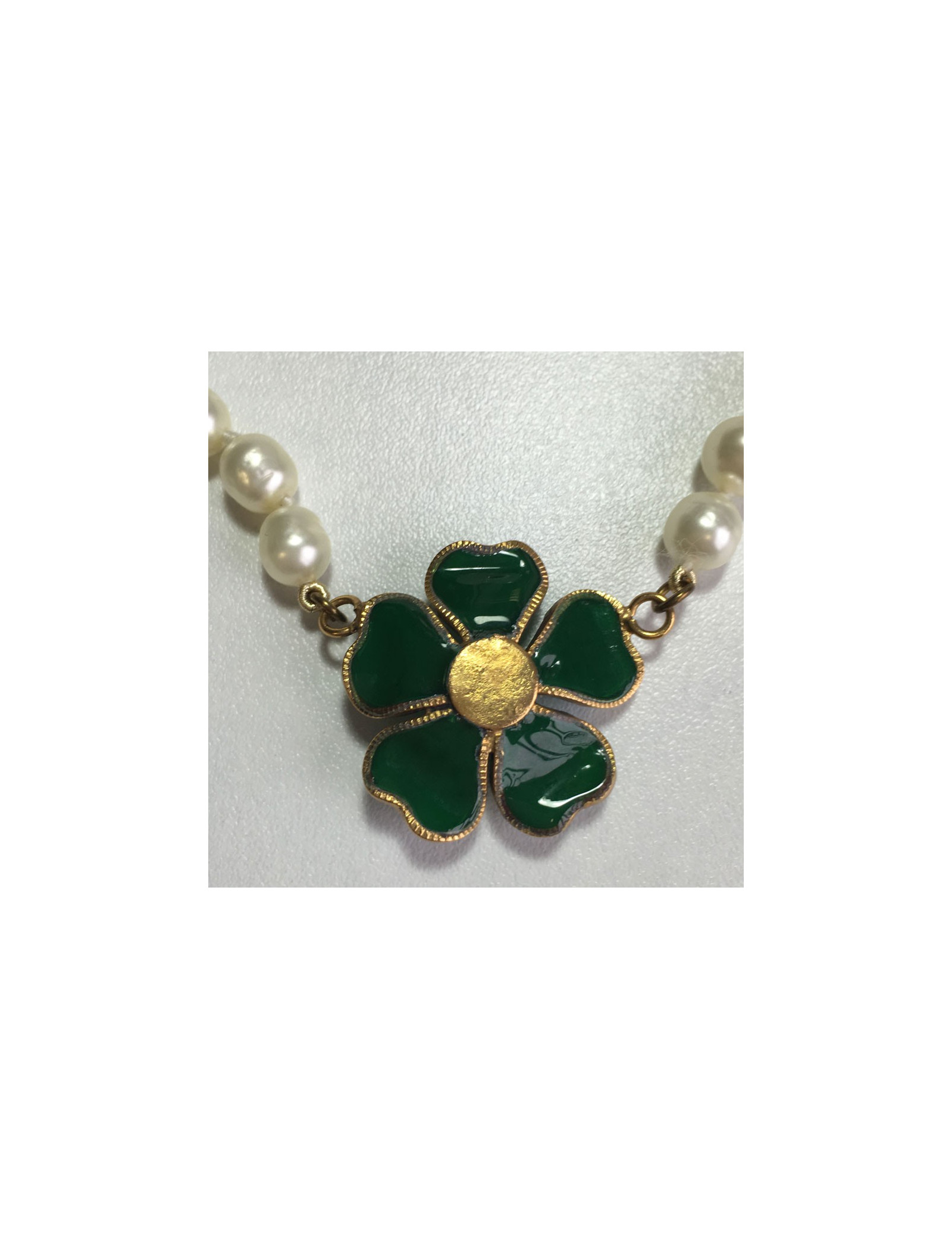 Collier Couture Marguerite de Valois, perles baroques nacrées et pendentif fleurette verte, le tout en pâte de verre. Réalisé à la main dans les ateliers Marguerite de Valois.