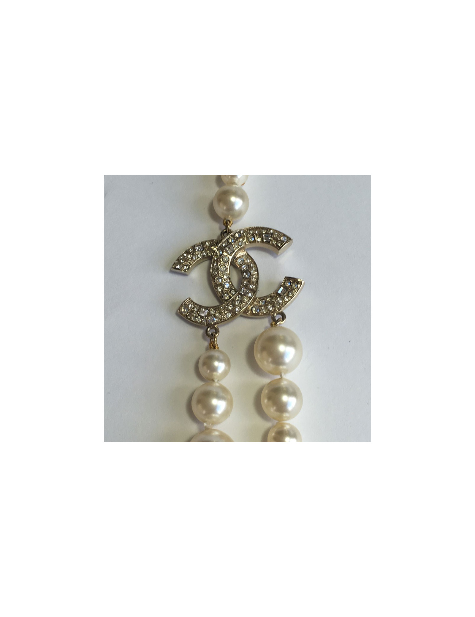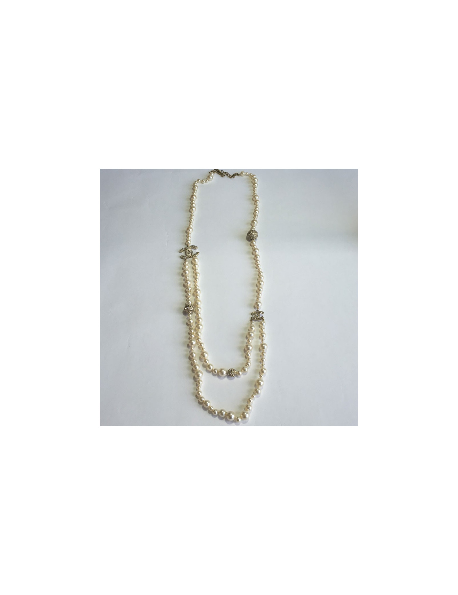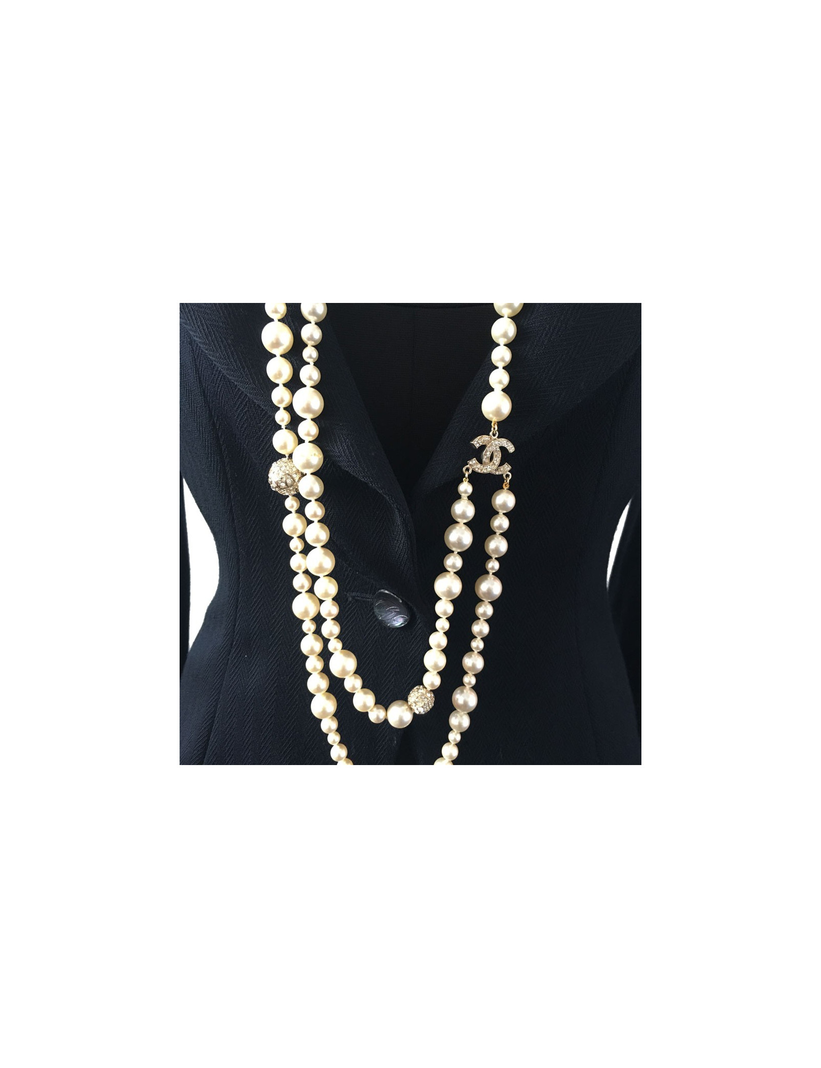 Couture! Sautoir CHANEL double rang de perles nacrées sur le devant, CC et sphères en strass.