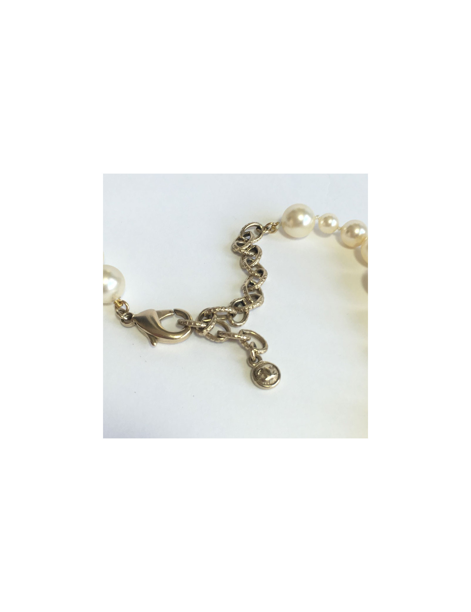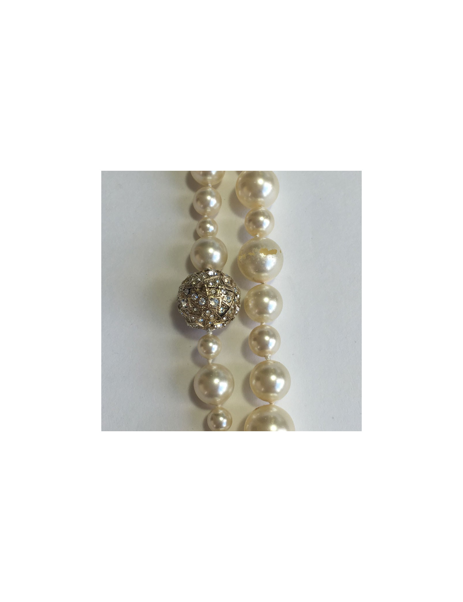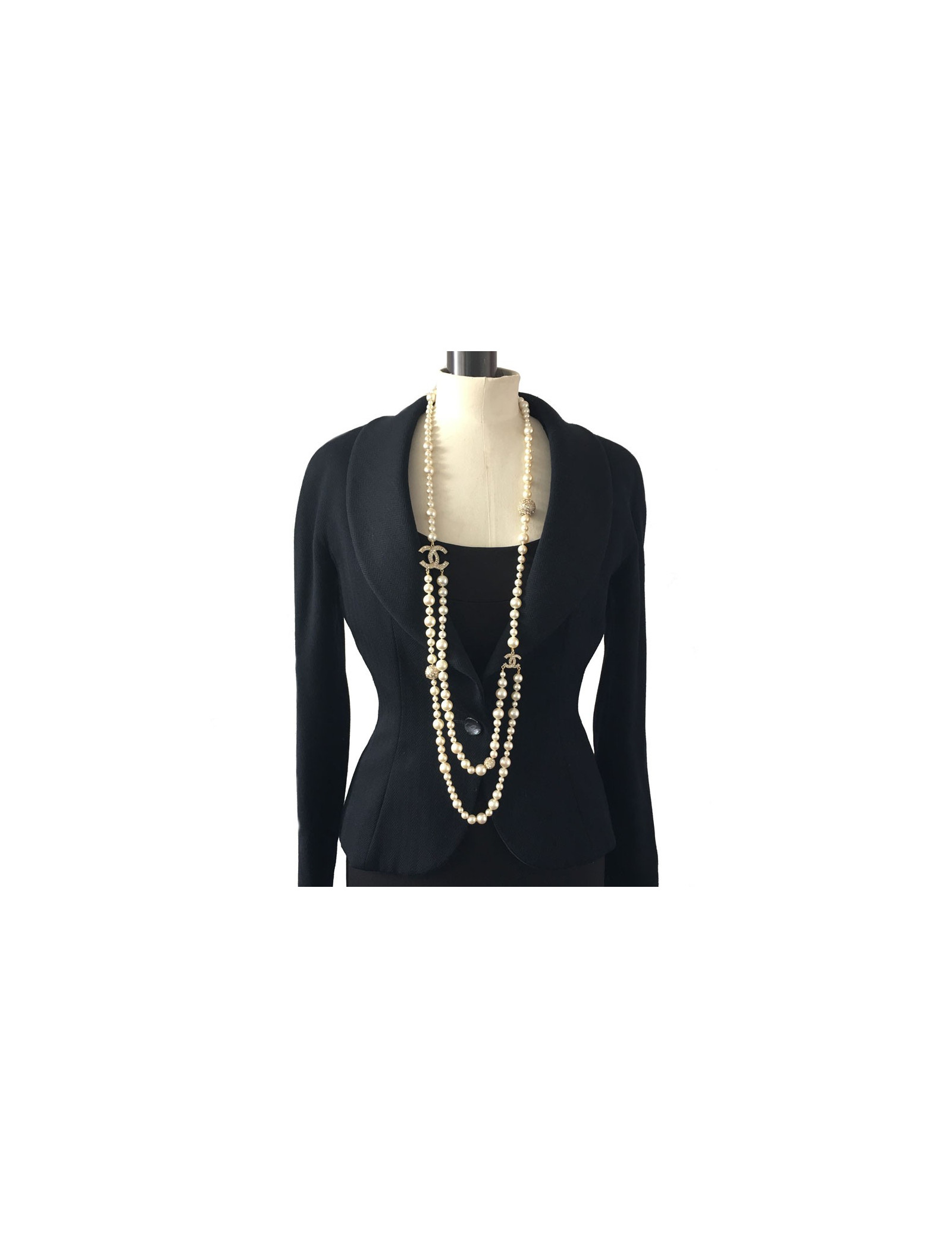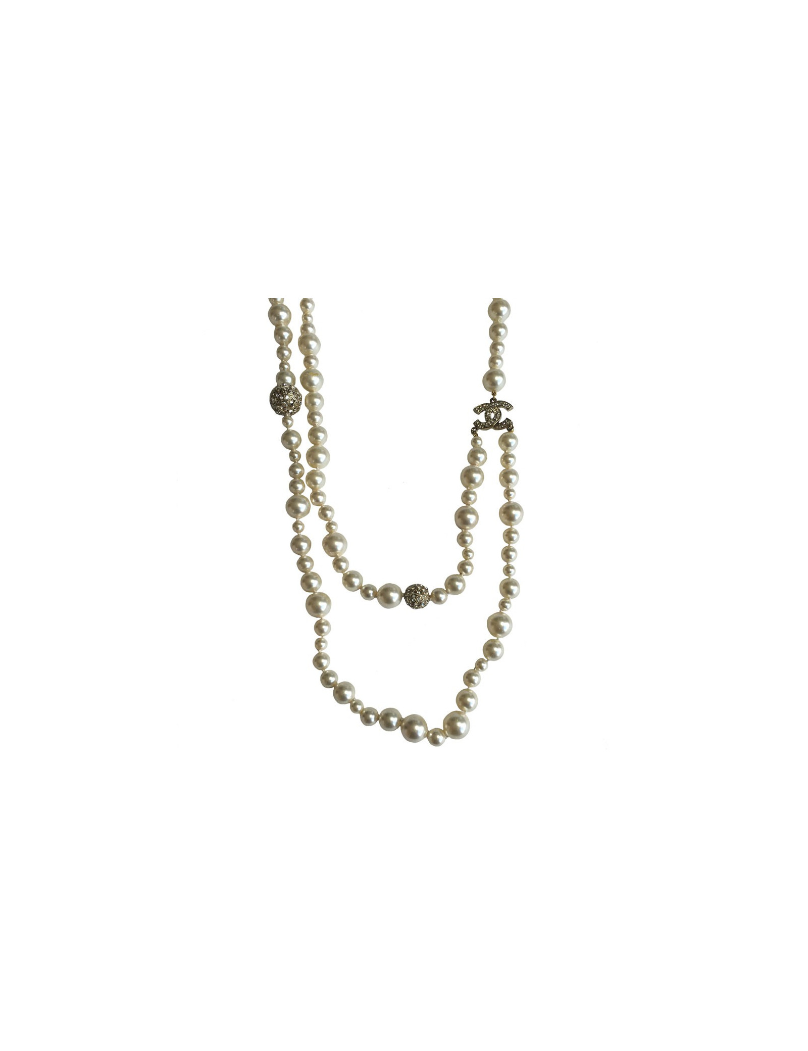 Couture! Sautoir CHANEL double rang de perles nacrées sur le devant, CC et sphères en strass.