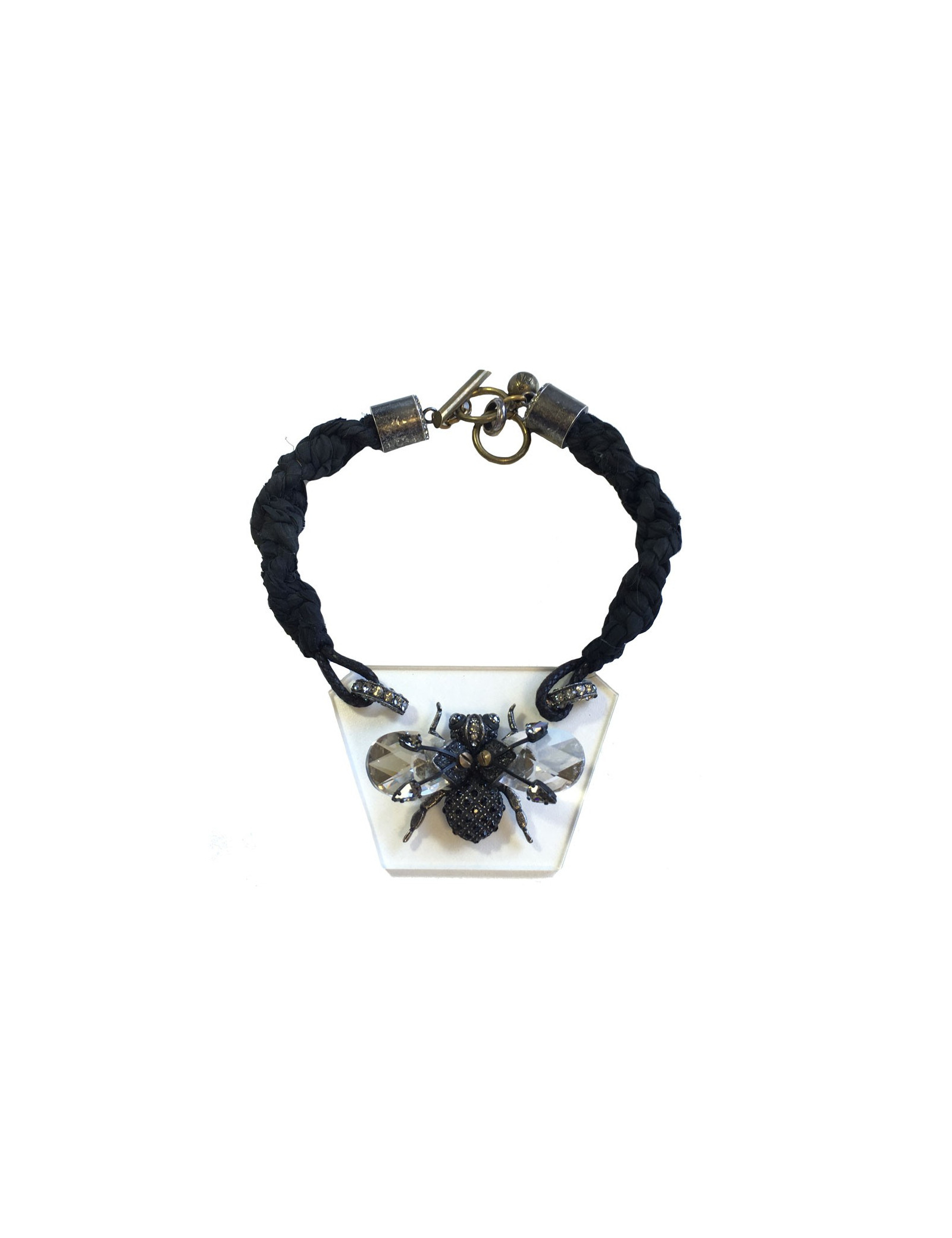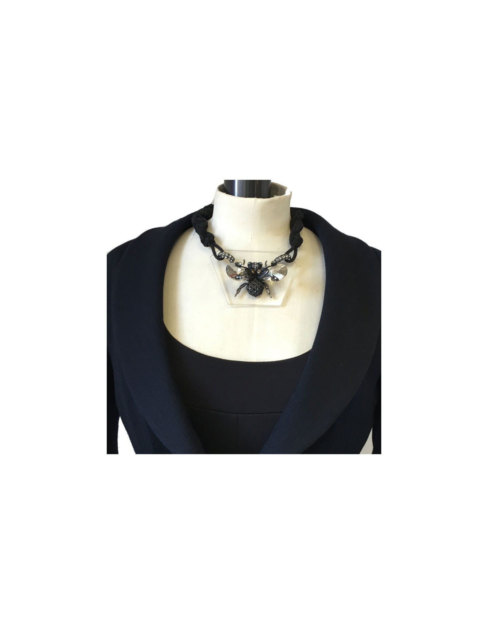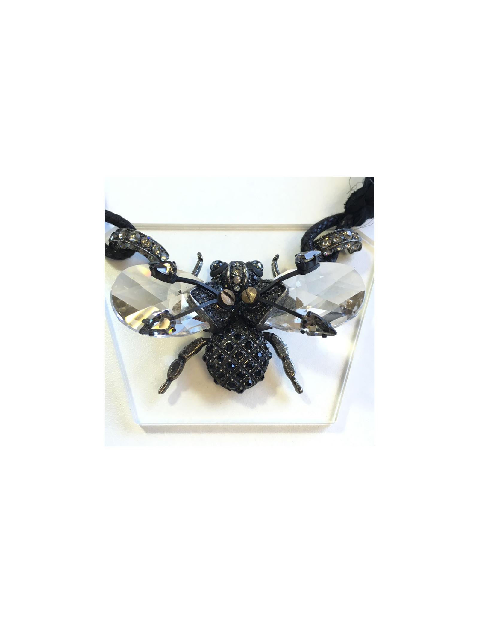 Beau collier LANVIN "insecte" en cristaux de swarovski et strass. Chaîne en tissu noir, fermoir en T. Insecte vissé sur une plaque en plexi transparent. Il manque un strass sur un des anneaux (voir photo)