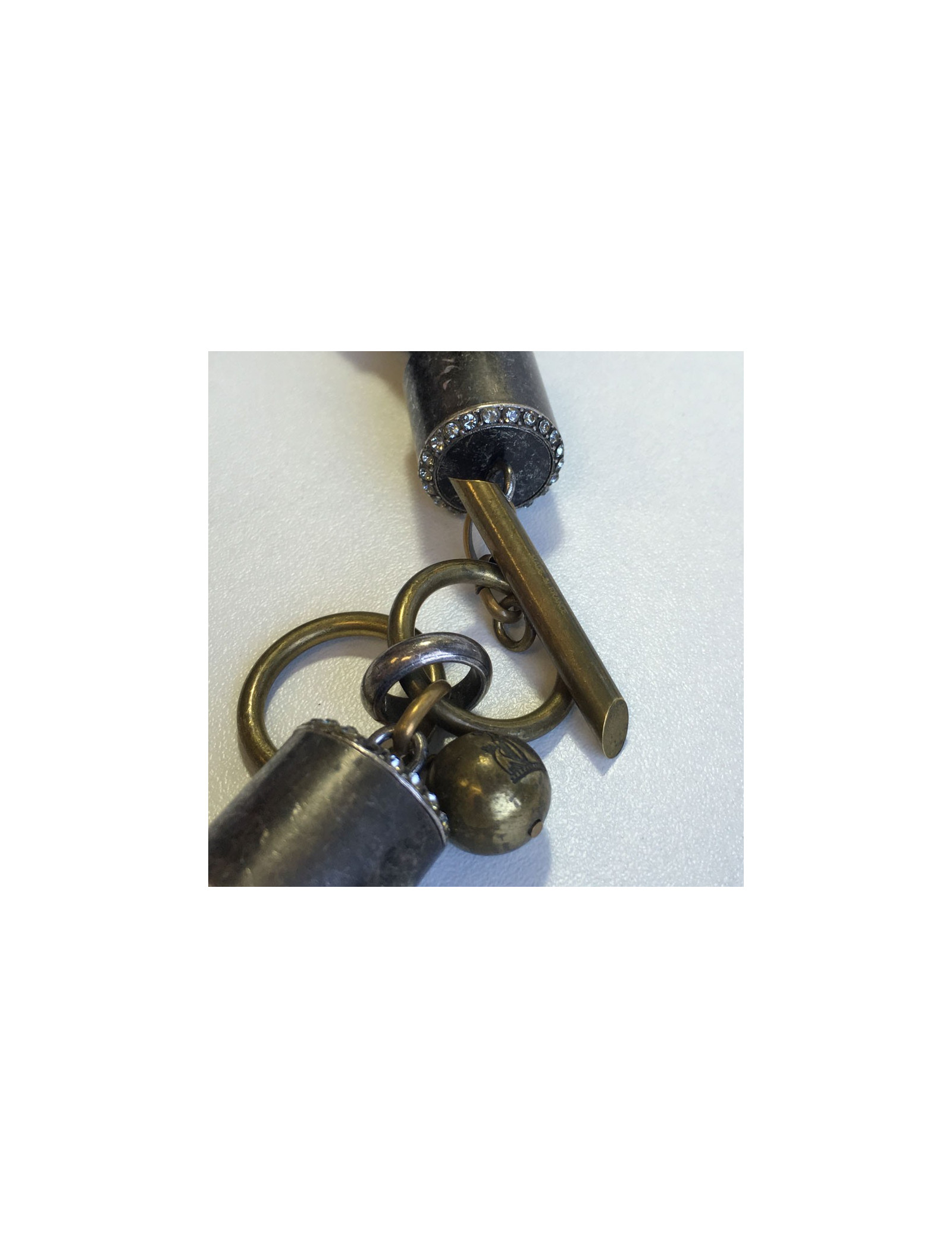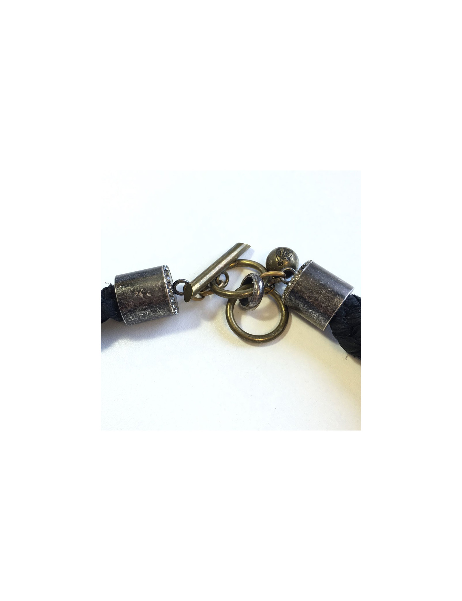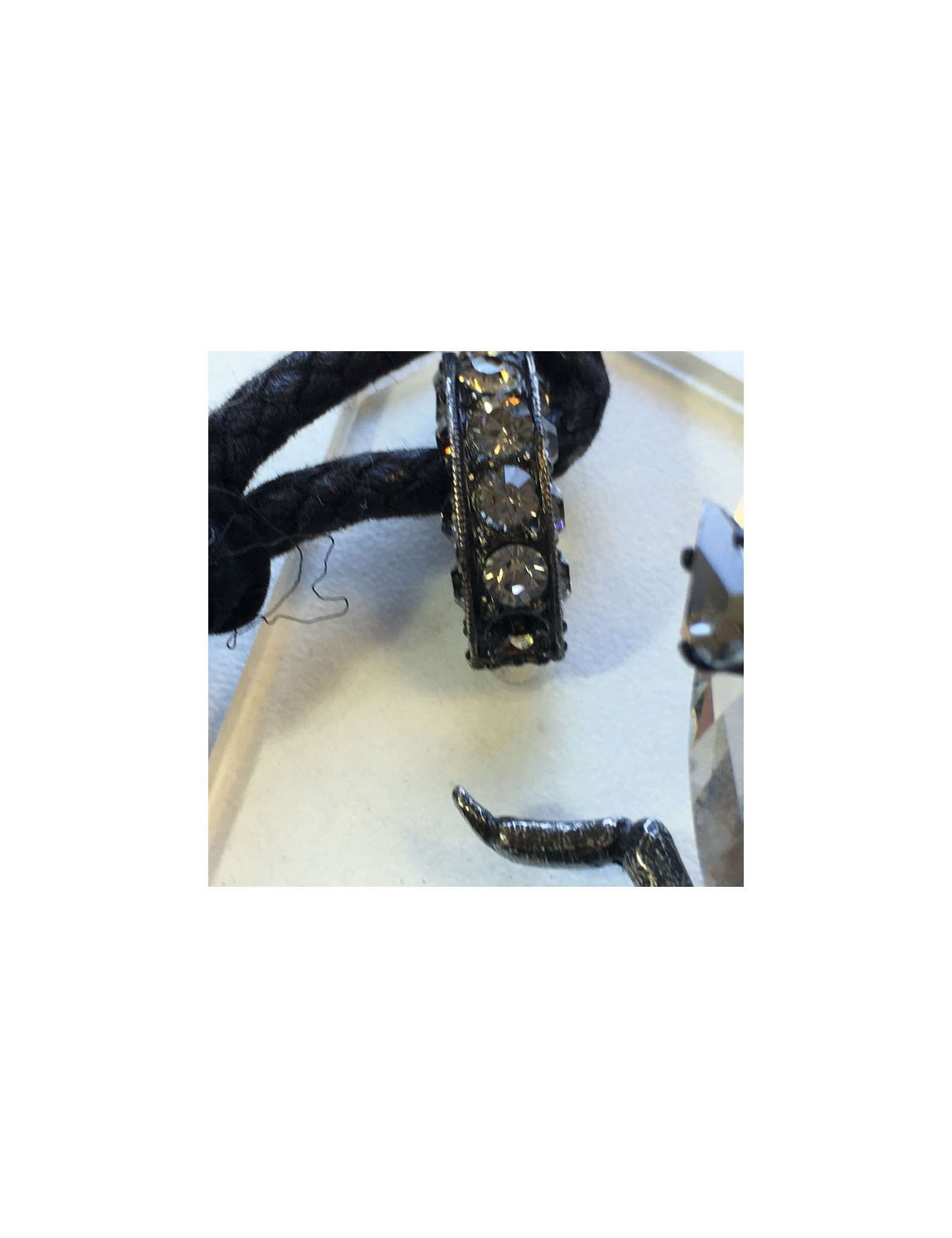 Beau collier LANVIN "insecte" en cristaux de swarovski et strass. Chaîne en tissu noir, fermoir en T. Insecte vissé sur une plaque en plexi transparent. Il manque un strass sur un des anneaux (voir photo)