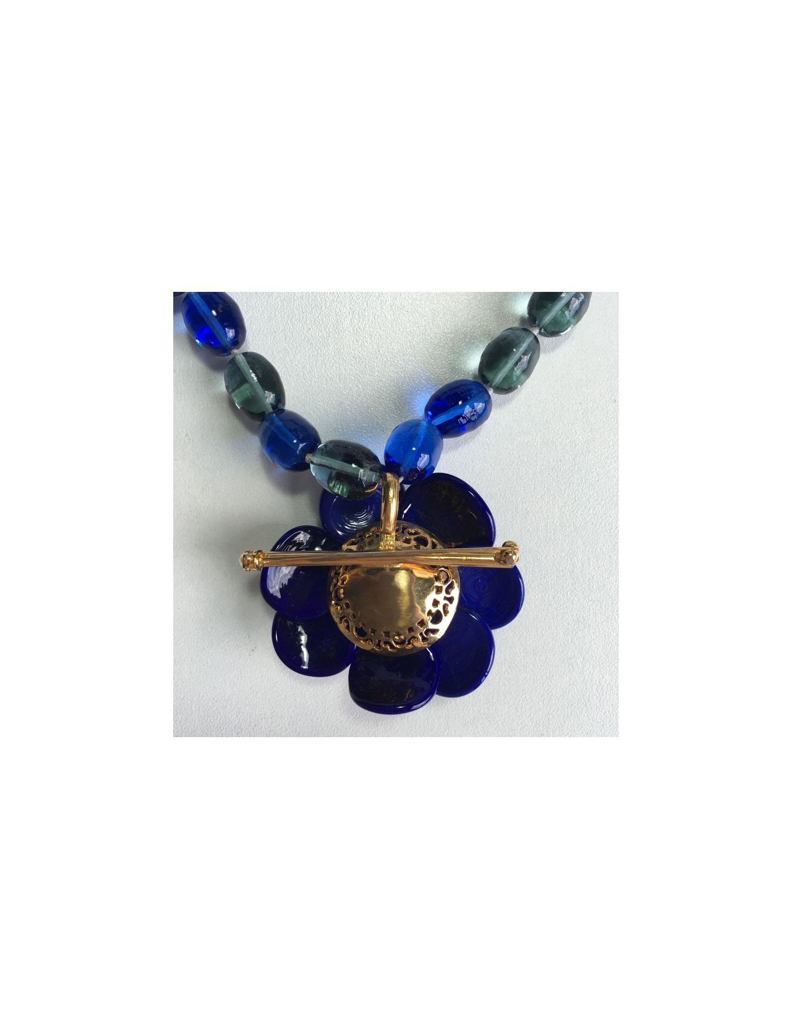 Superbe collier MARGUERITE DE VALOIS avec pendentif camélia en pâte de verre bleu saphir et vert gris. Le pendentif peut également être utilisé en broche.