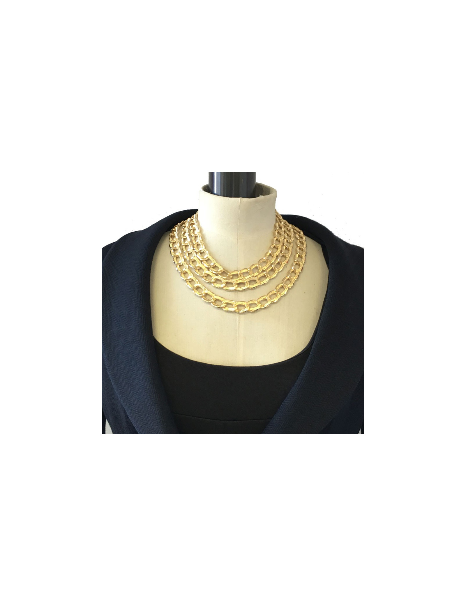 Collier YSL YVES SAINT LAURENT triple rangs en métal doré. Le collier a été retrempé dans l'or. Bijou vintage. En très bon état. Pastille de la marque présente.