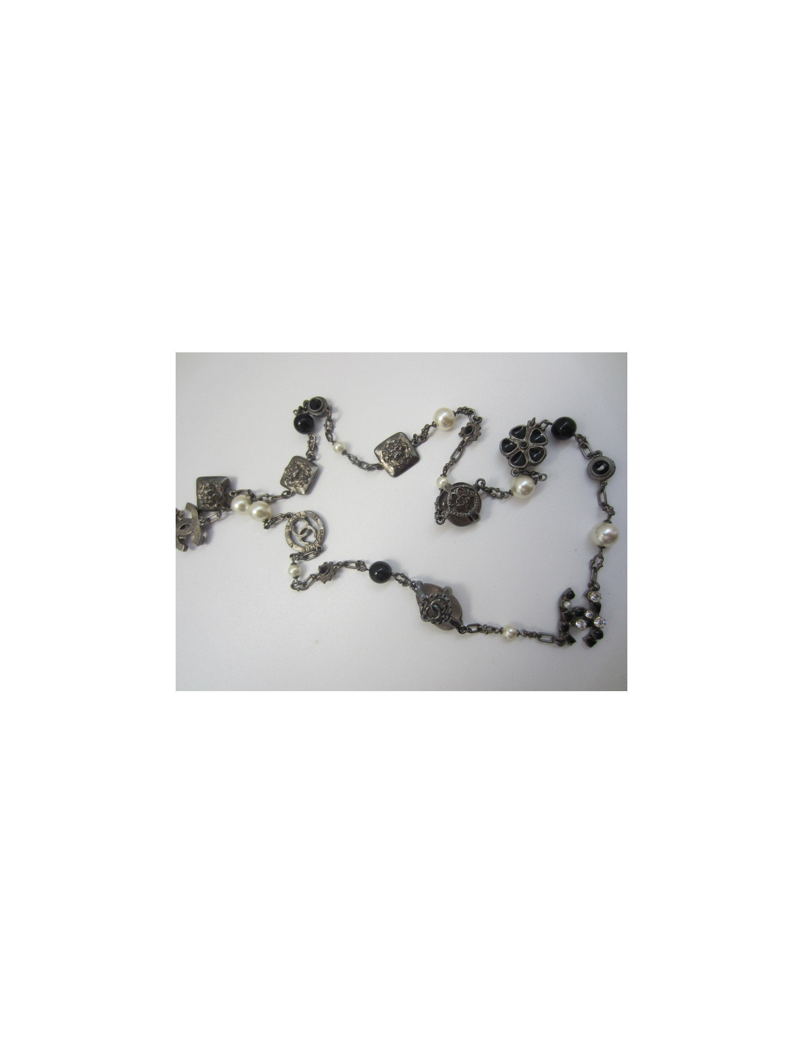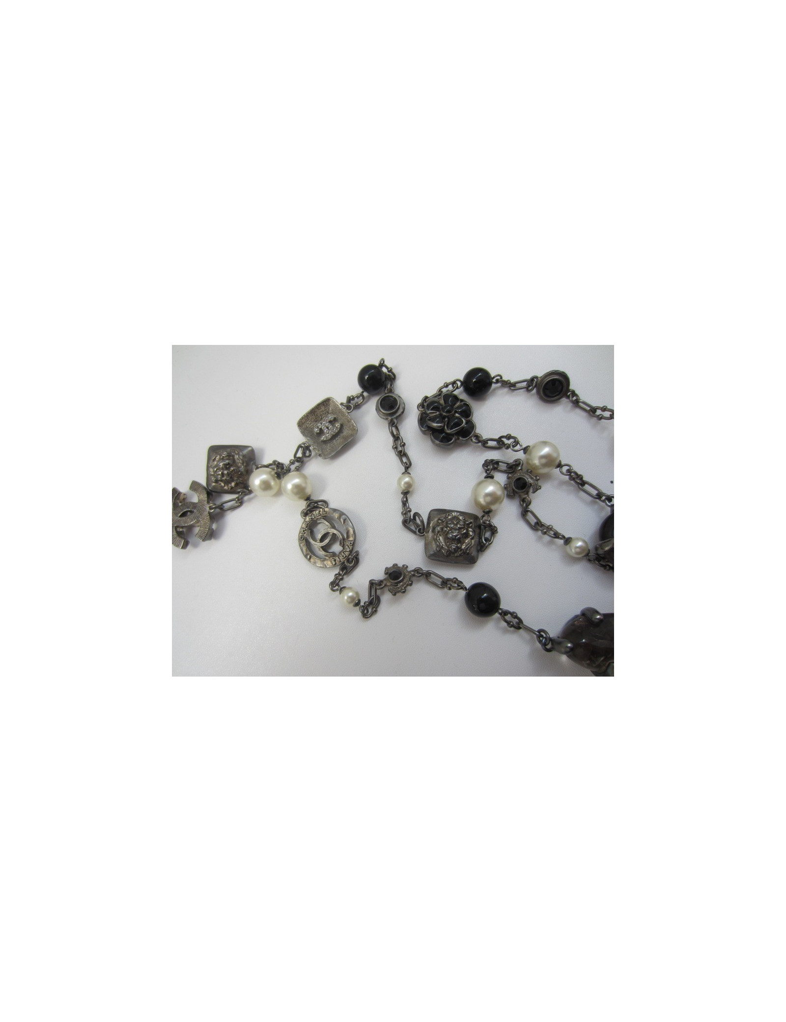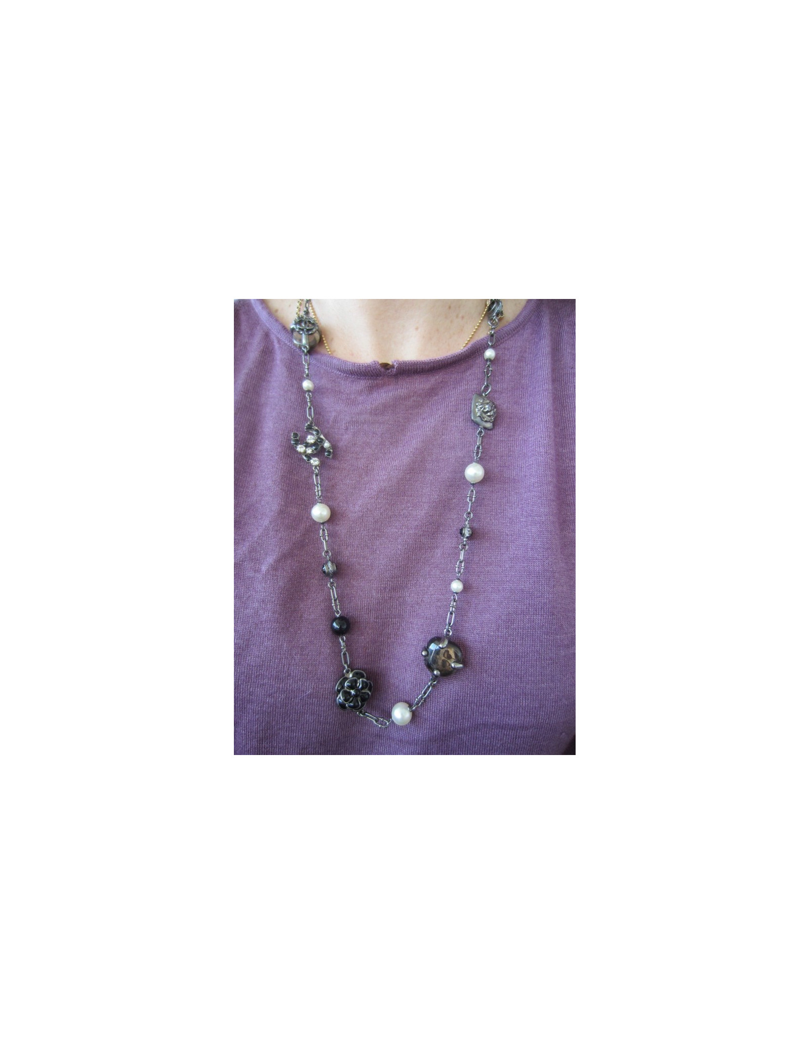 Sautoir changeant car chaque breloque a une double face : le lion devient CC en strass, la fleur marguerite de vient camélia, le CC ésine noire et strass devient CC en ruthénium...