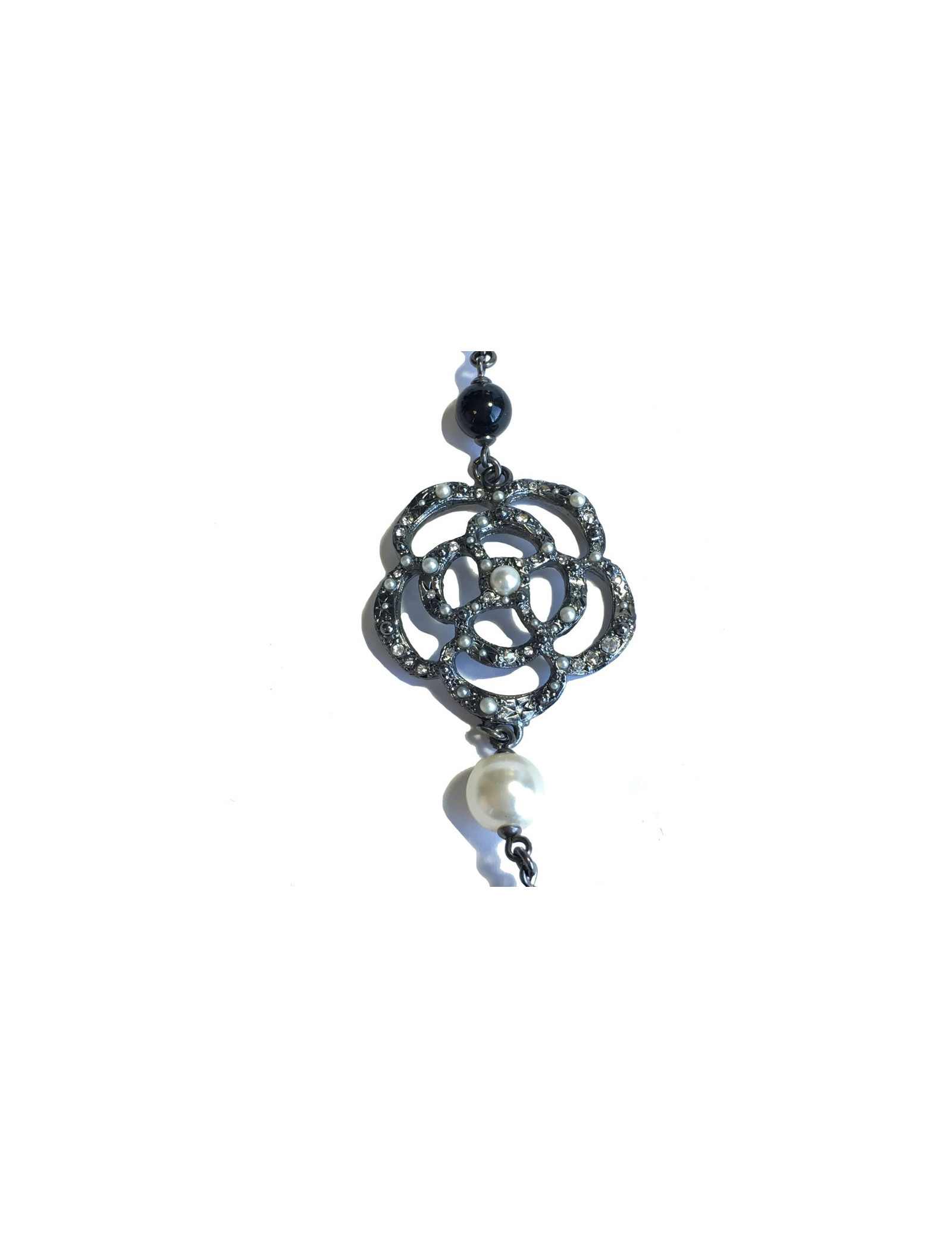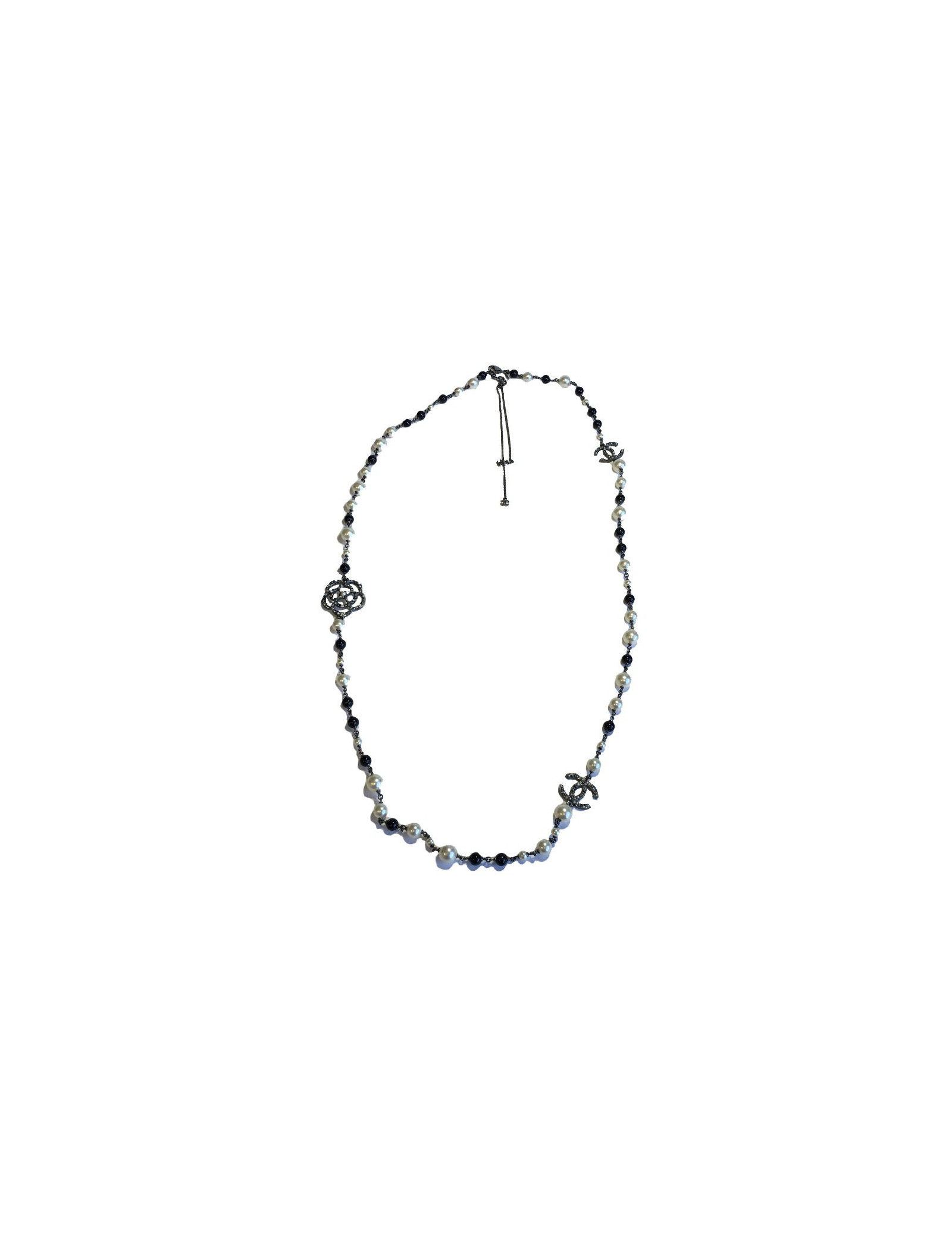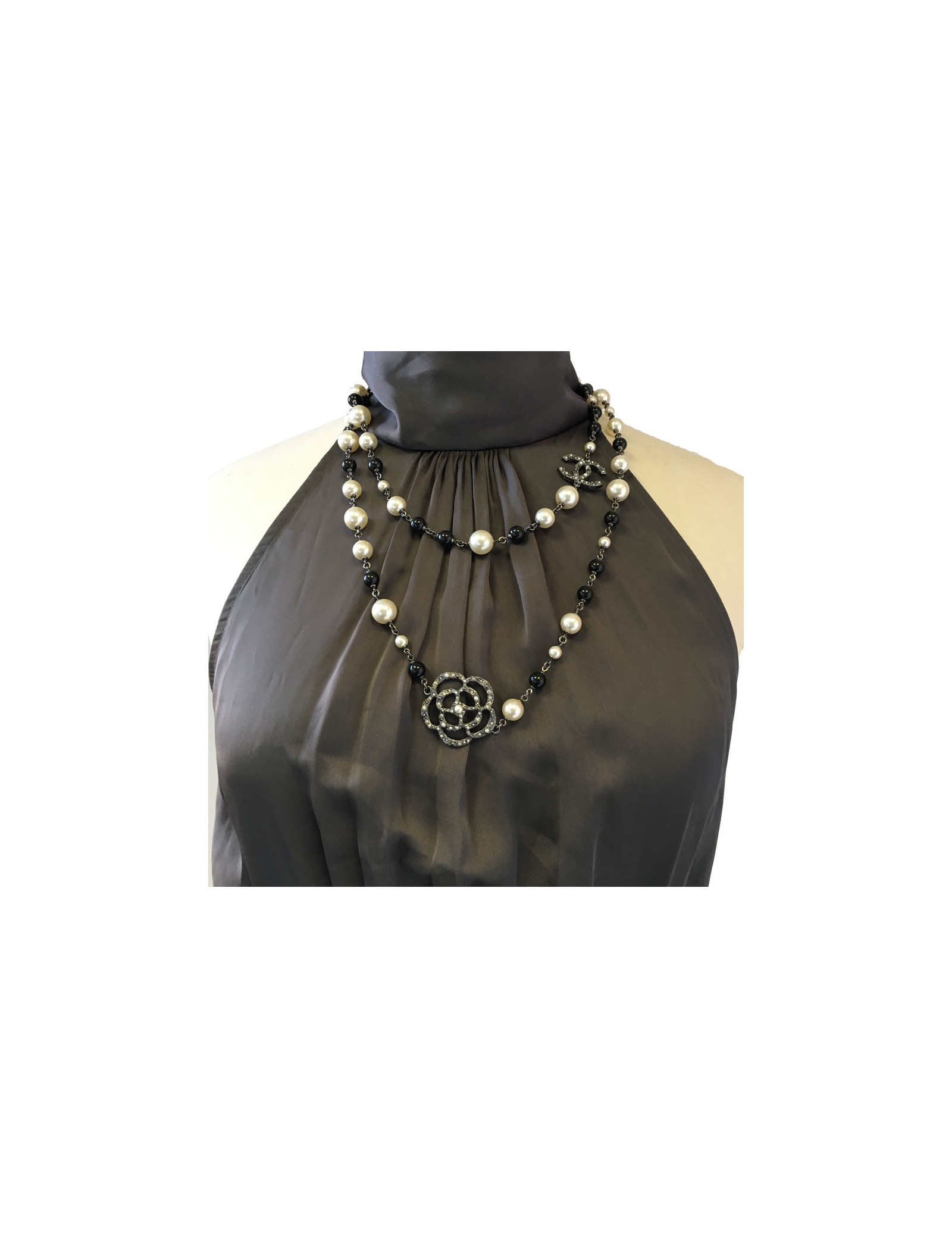 Superbe sautoir CHANEL camélias, CC sertis de strass et petites perles nacrées, perles nacrées et noires.