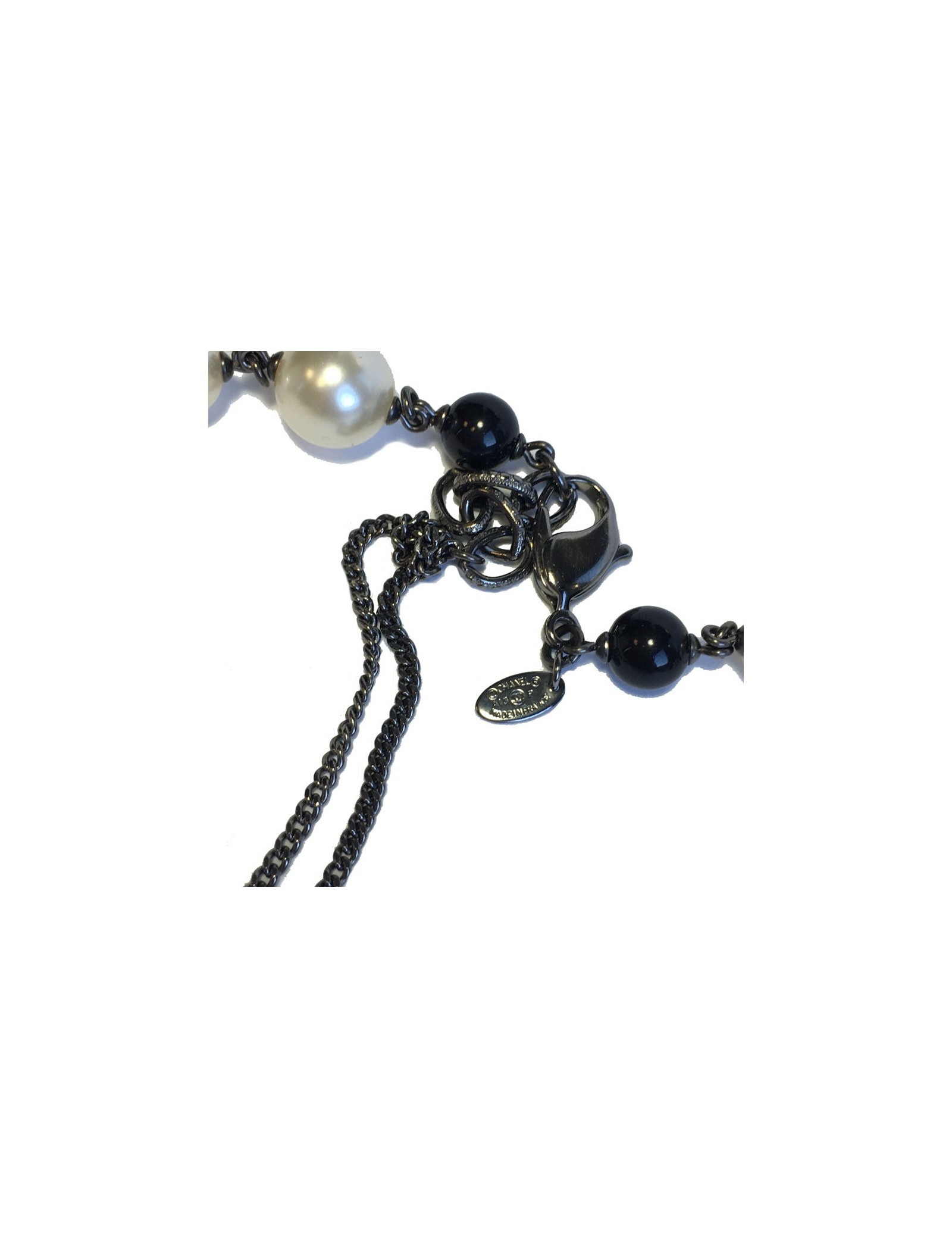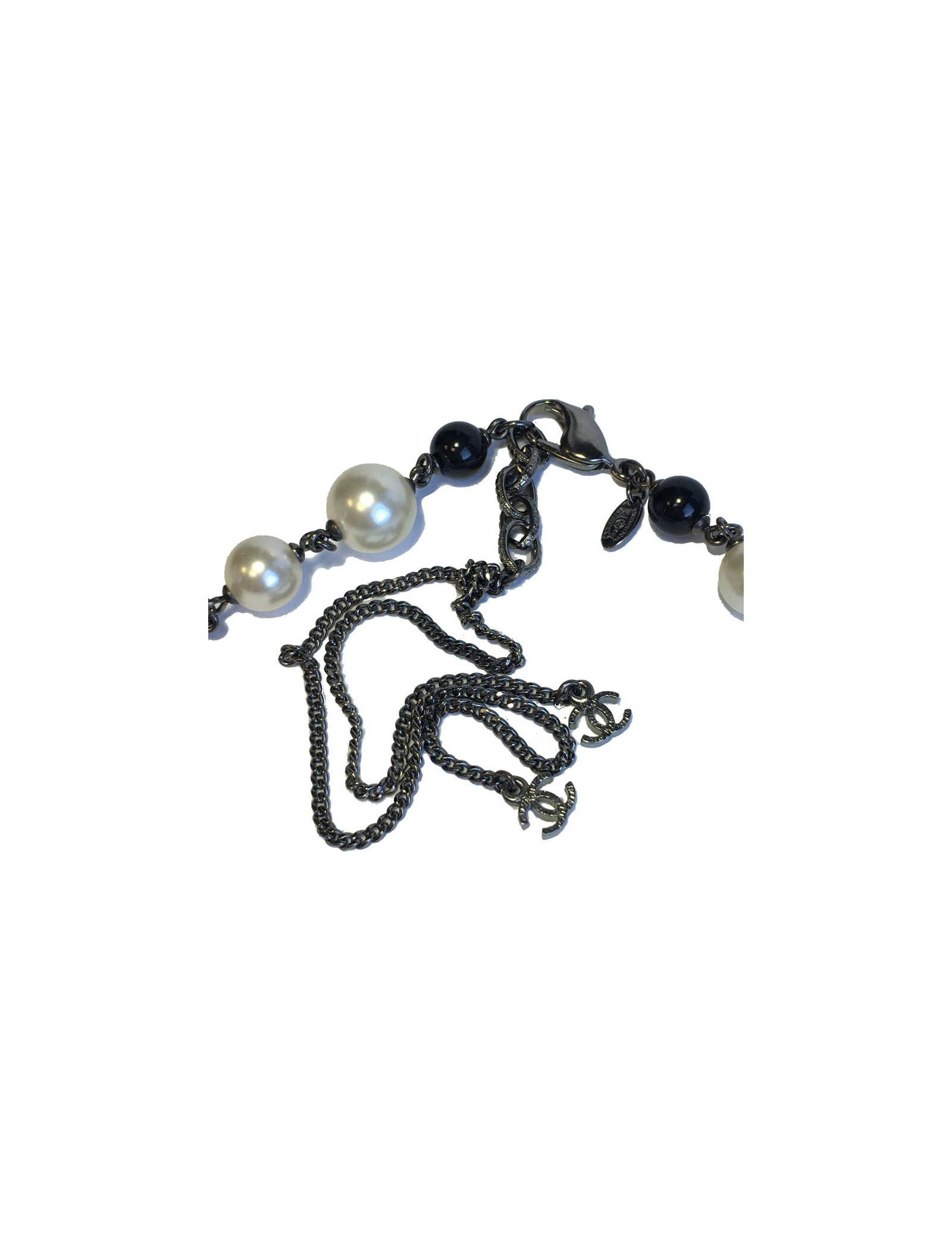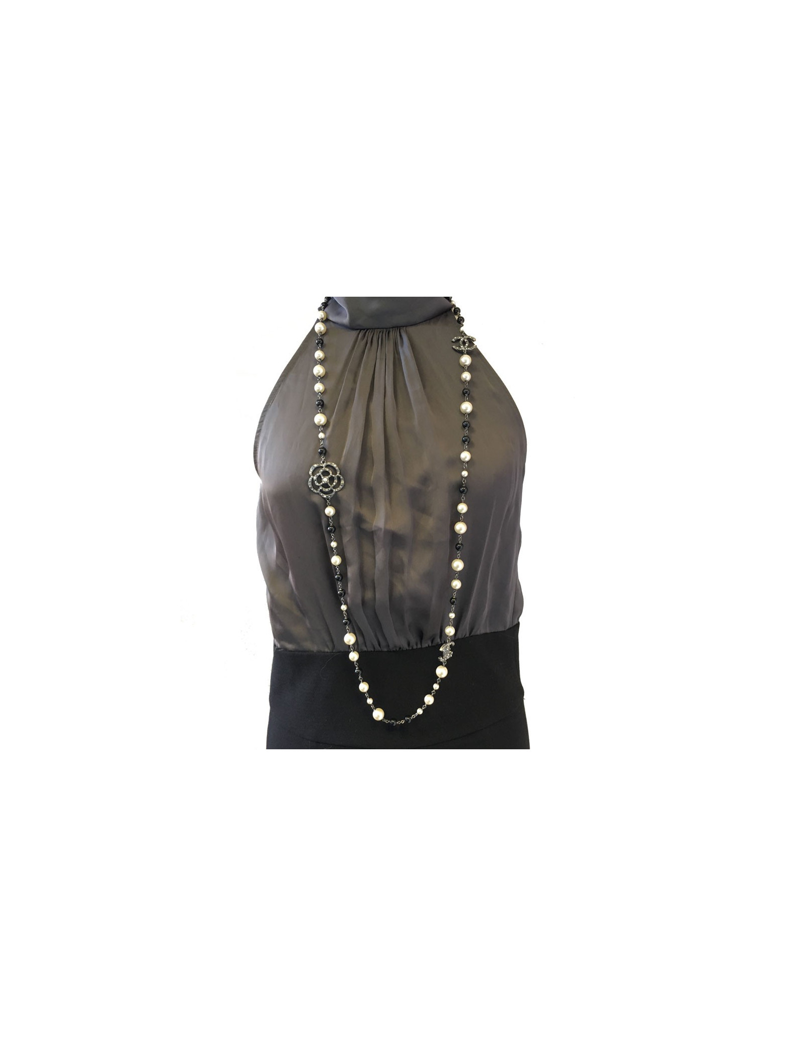 Superbe sautoir CHANEL camélias, CC sertis de strass et petites perles nacrées, perles nacrées et noires.