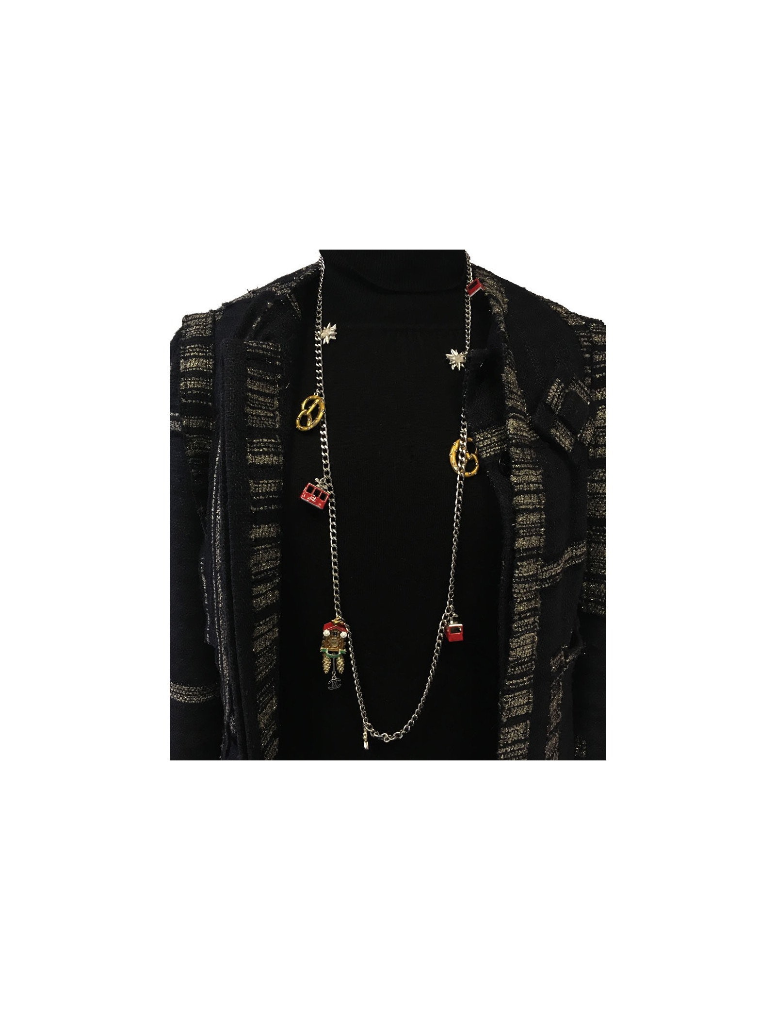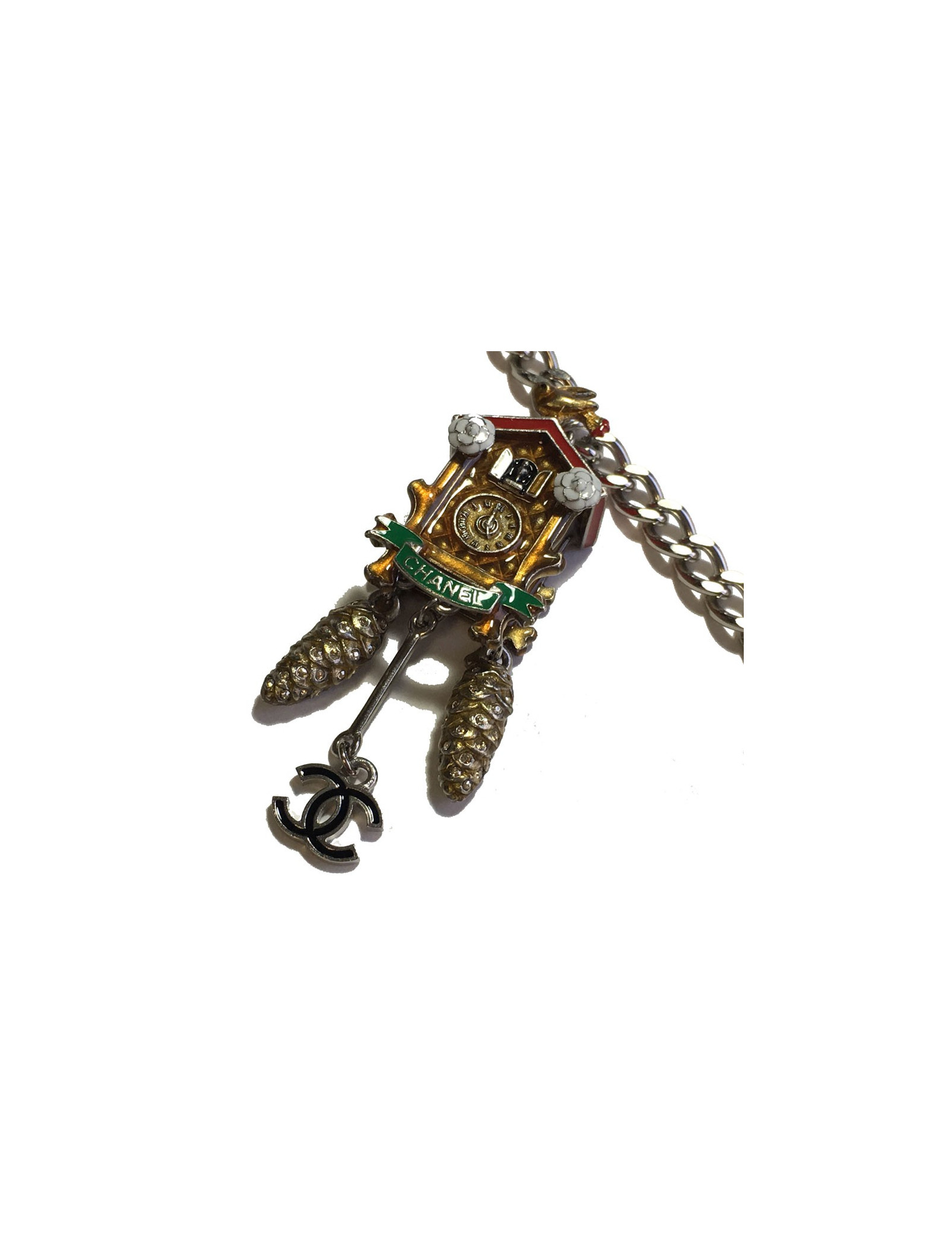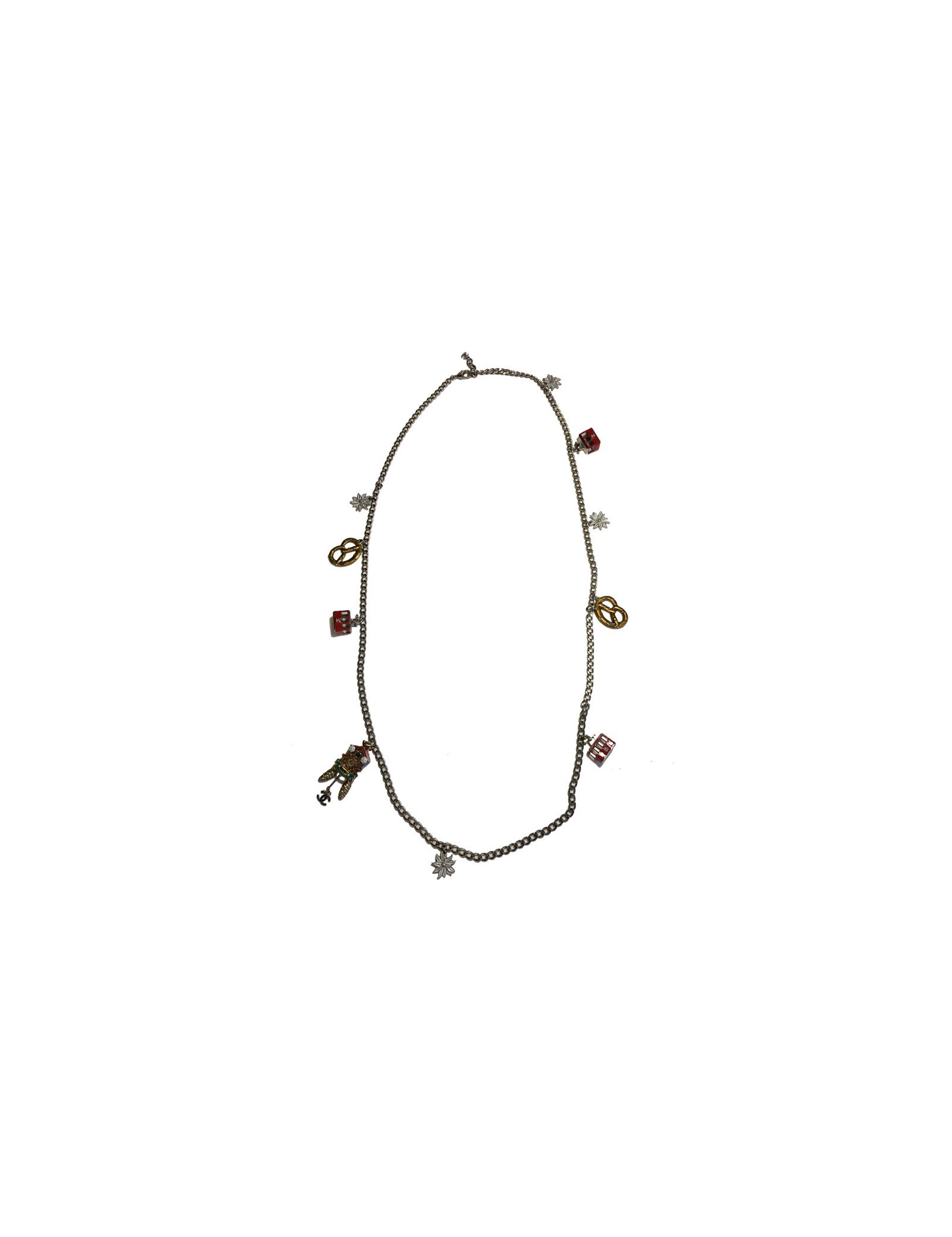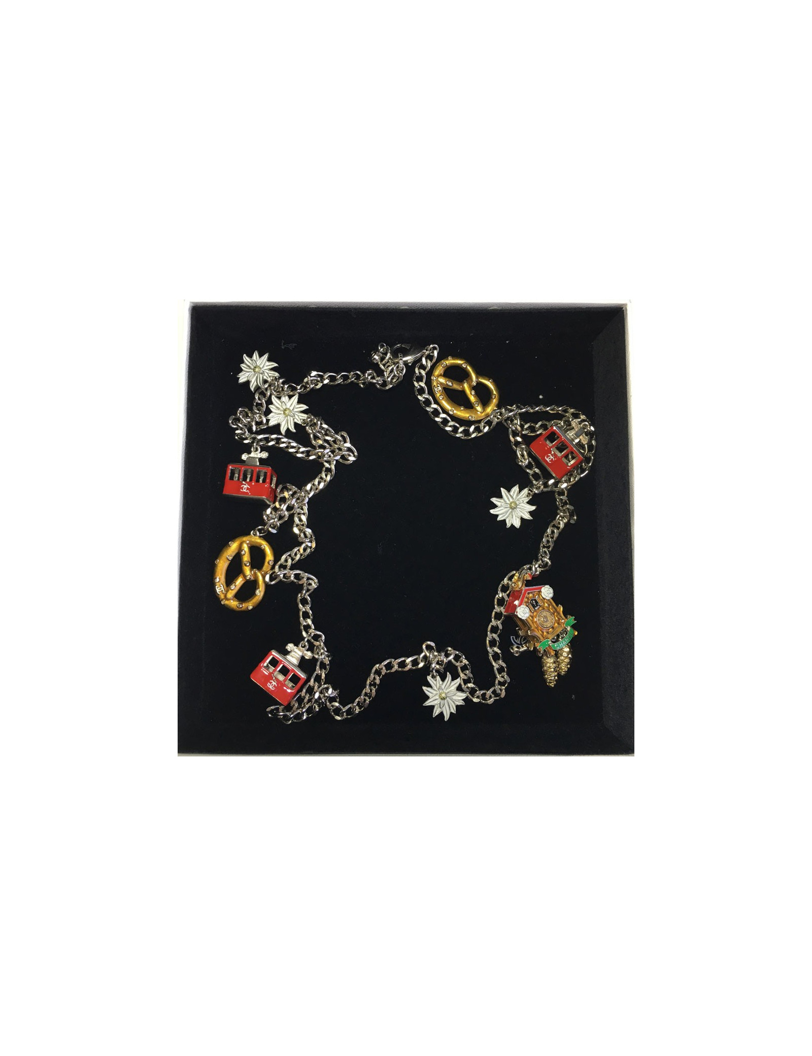 Sautoir en chaîne argentée agrémenté de breloques inspirés de la vie autrichienne: bretzel doré serti de petits strass, un édelweiss en résine blanche, un funiculaire rouge et un très beau coucou doré avec camélias blancs, un CC, 2 pommes de pins sertis de petits brillants jaunes.