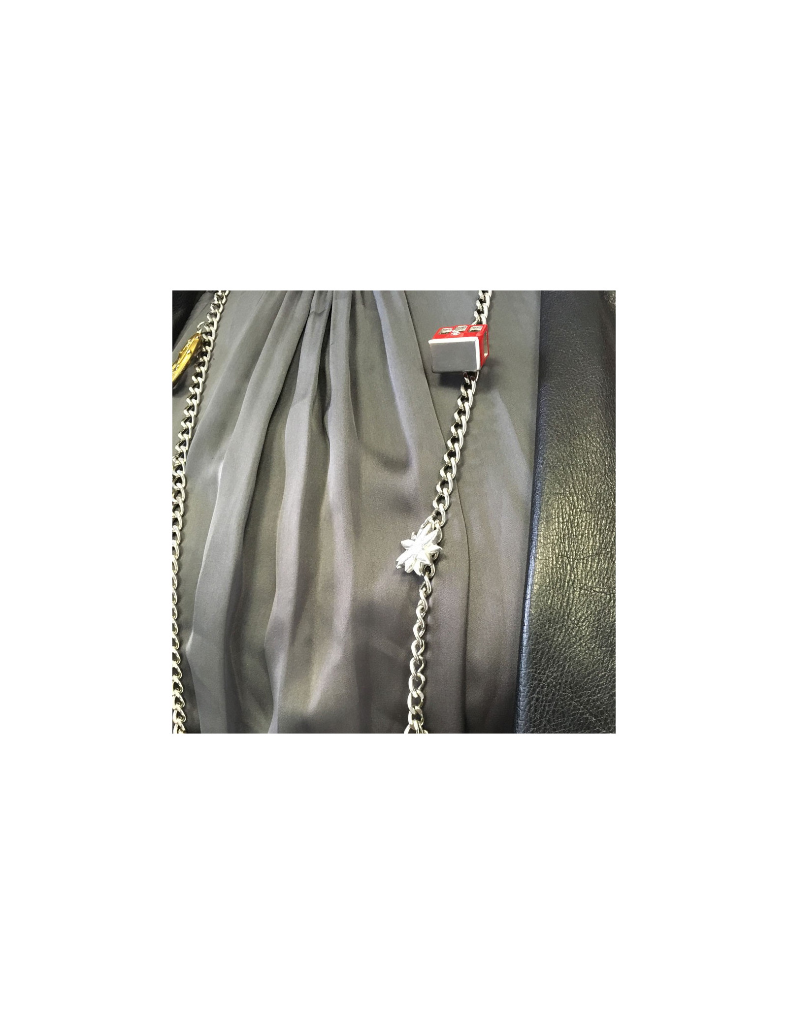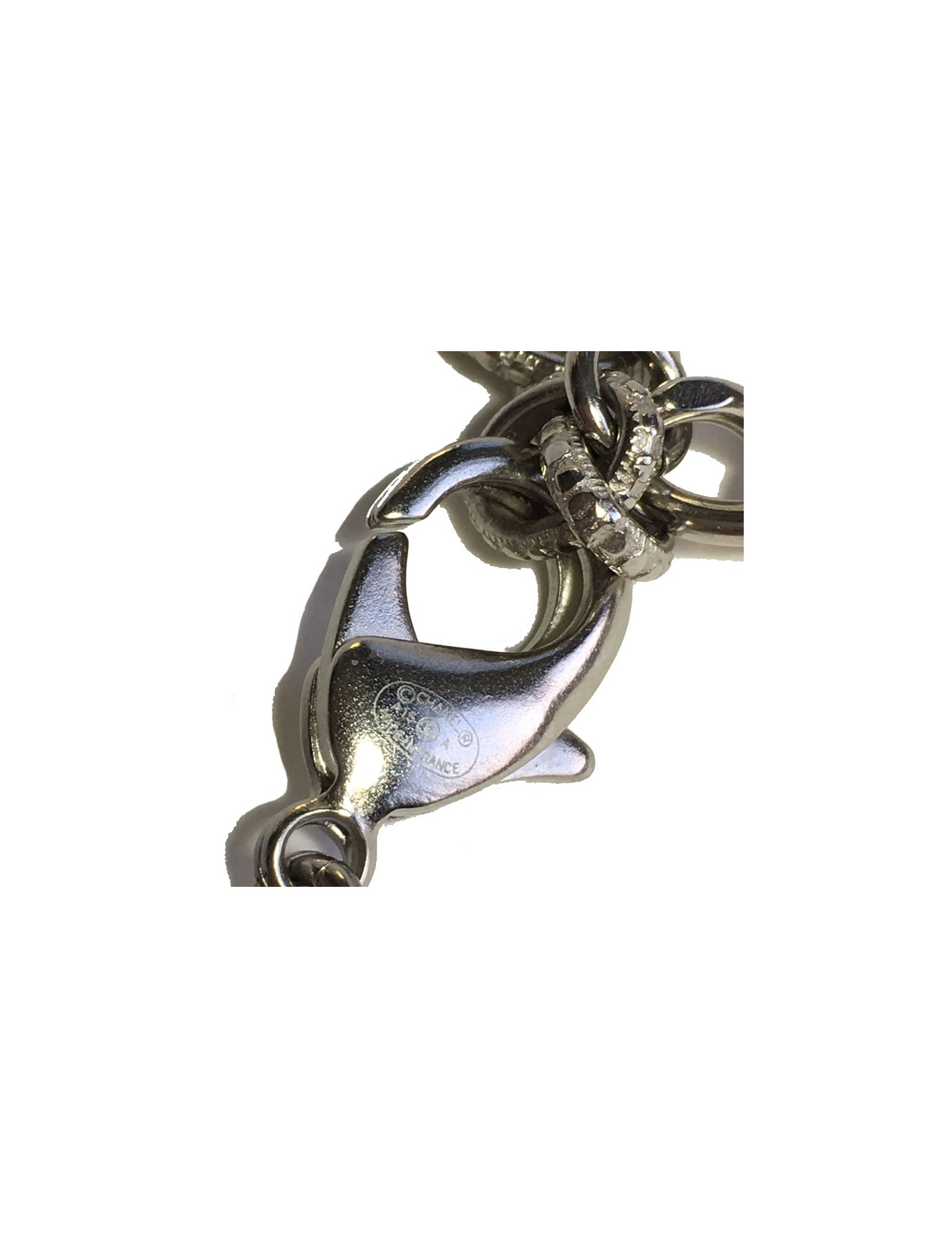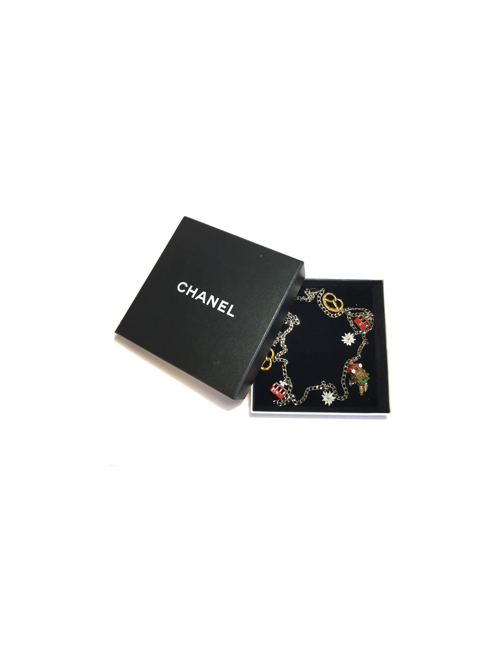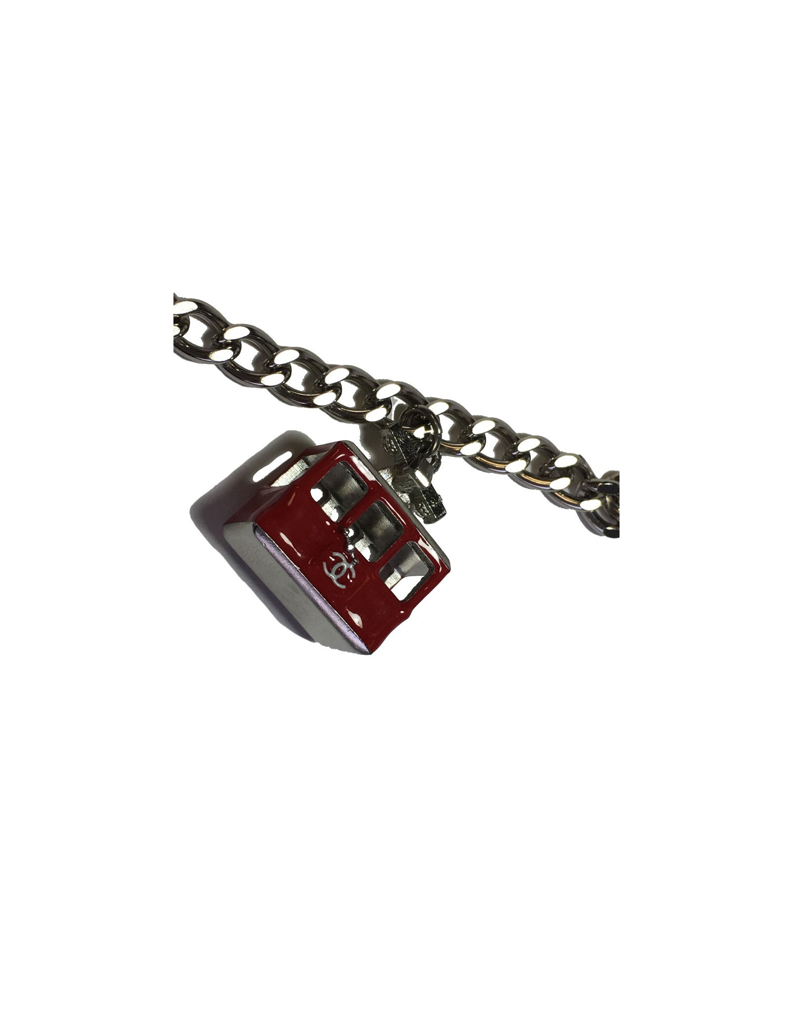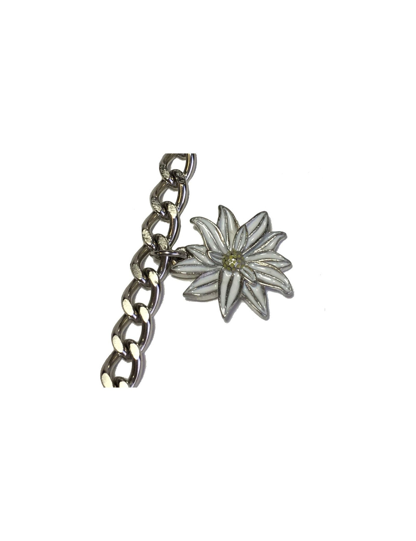 Sautoir en chaîne argentée agrémenté de breloques inspirés de la vie autrichienne: bretzel doré serti de petits strass, un édelweiss en résine blanche, un funiculaire rouge et un très beau coucou doré avec camélias blancs, un CC, 2 pommes de pins sertis de petits brillants jaunes.