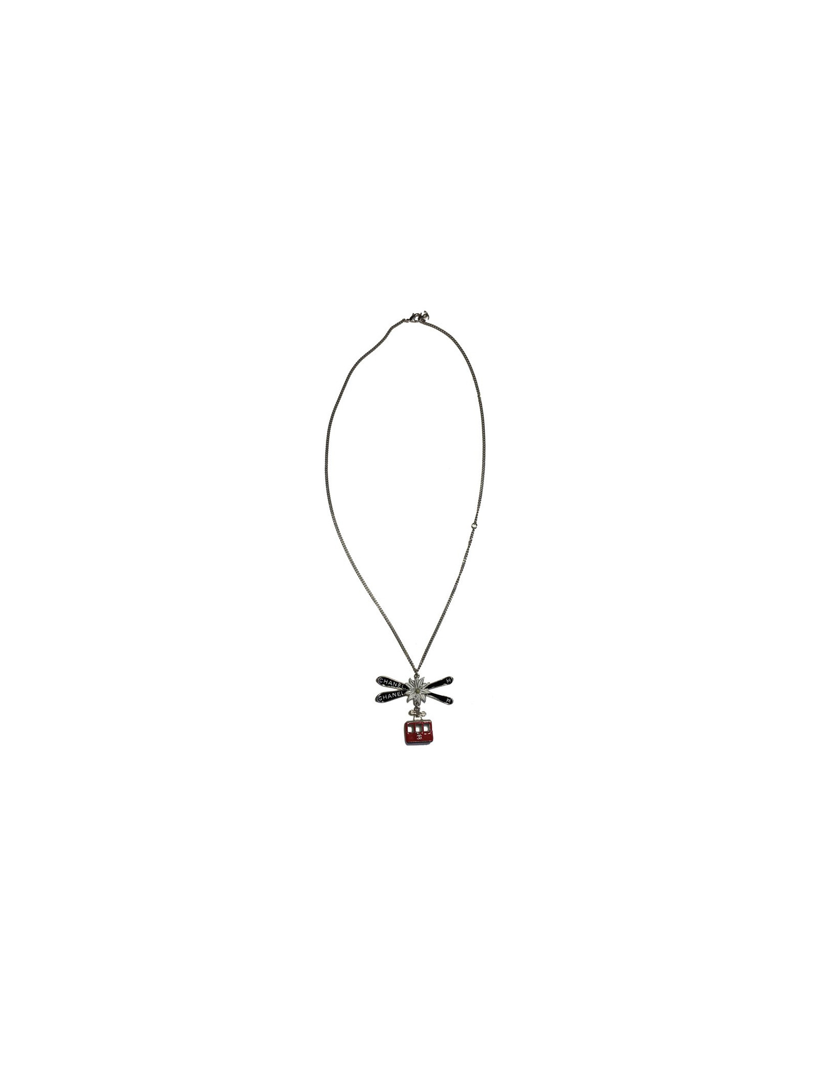 Chaîne en métal argenté, pendentif représentant un funiculaire rouge, des skis signés CC et un bel édelweiss au milieu. Ce bel ensemble représente les symboles des motifs alpins autrichien.