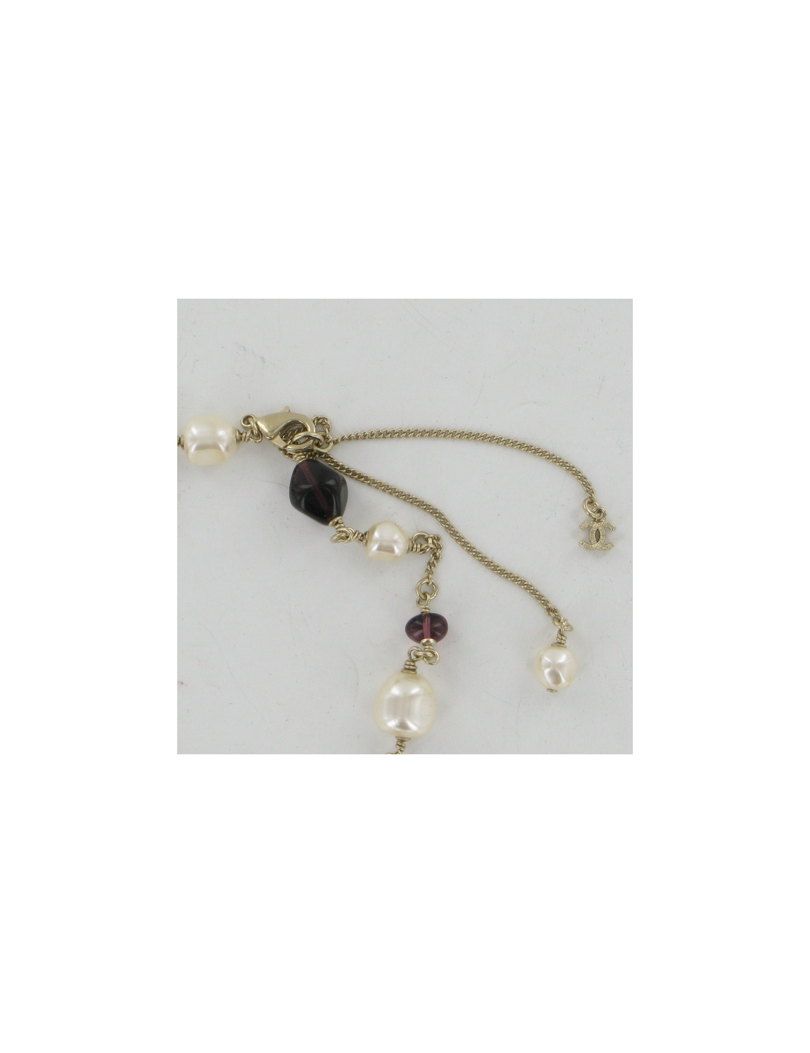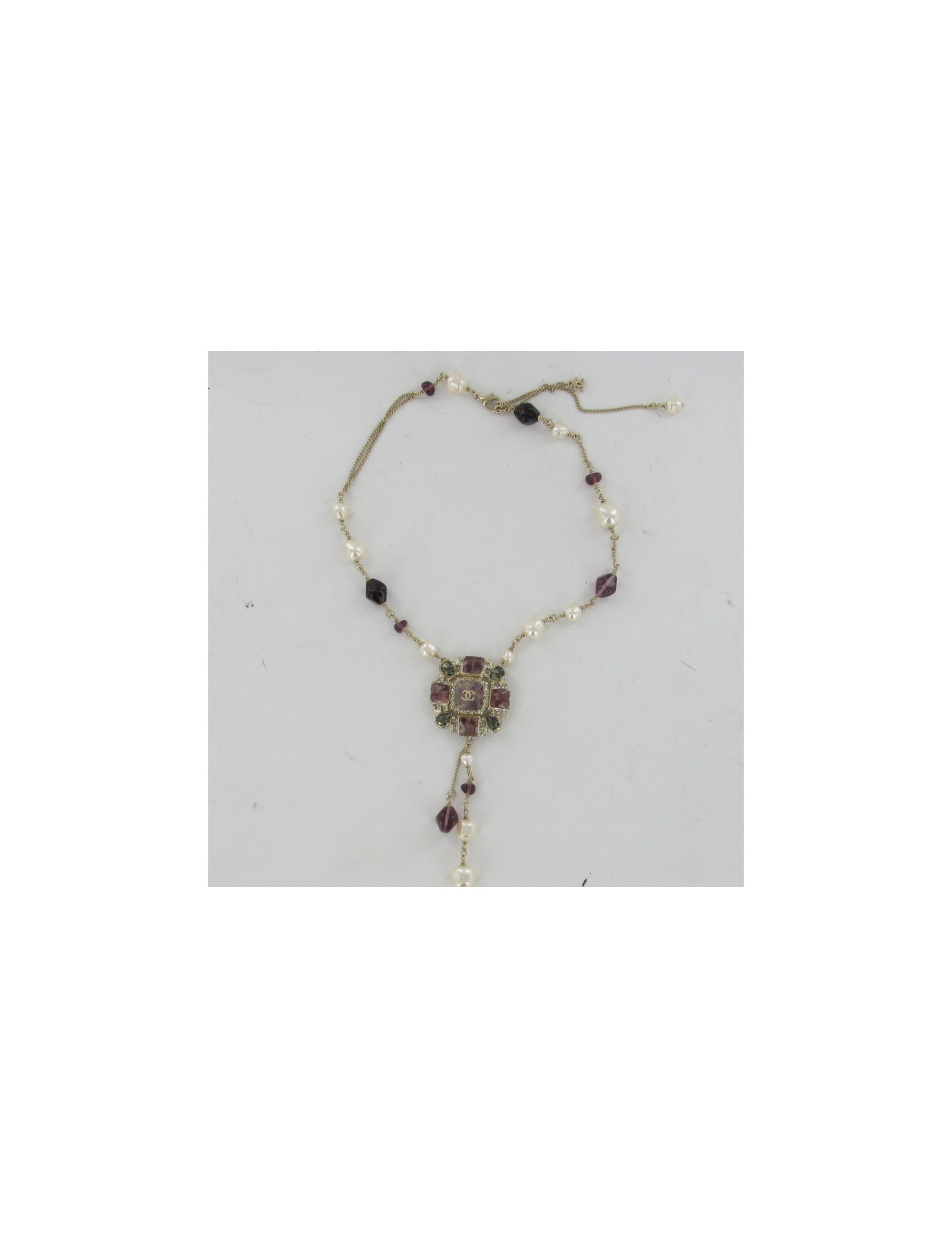 Sublime collier améthyste CHANEL, Chaîne métal or pâle, perles nacrées et améthystes