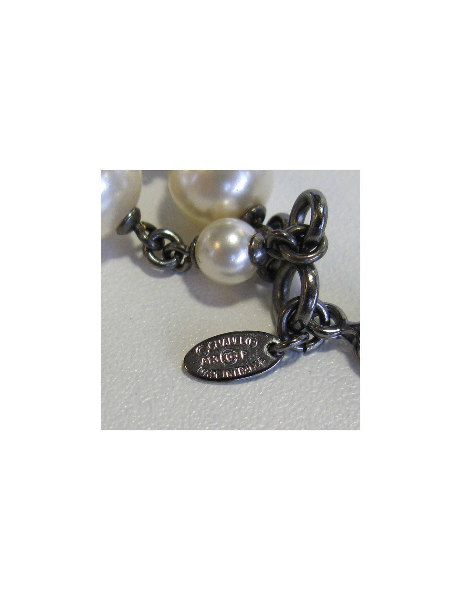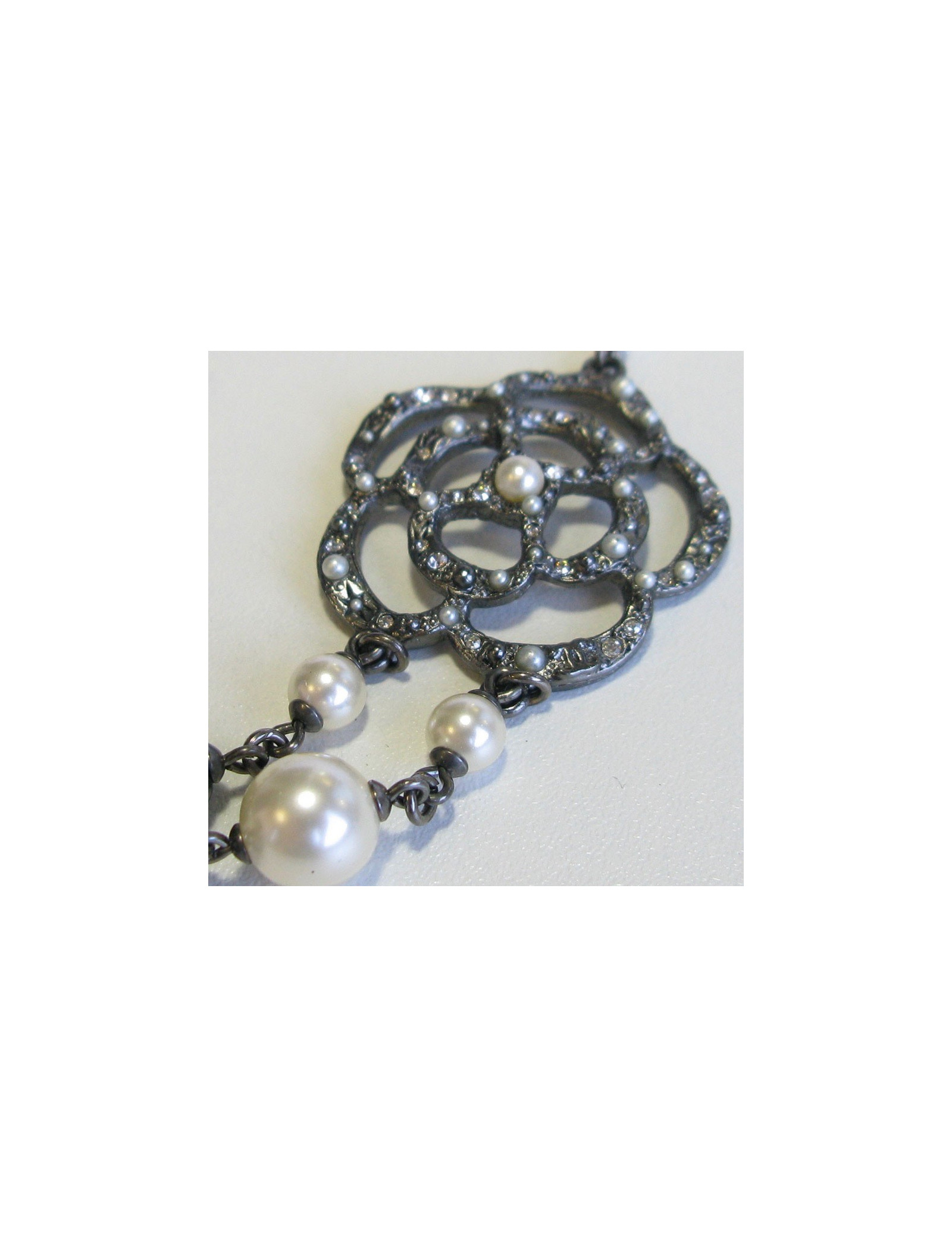 Collier Chanel en métal ruthénium, double rang de perles noires et nacrées; Un beau camélia est serti de petits strass et de perles