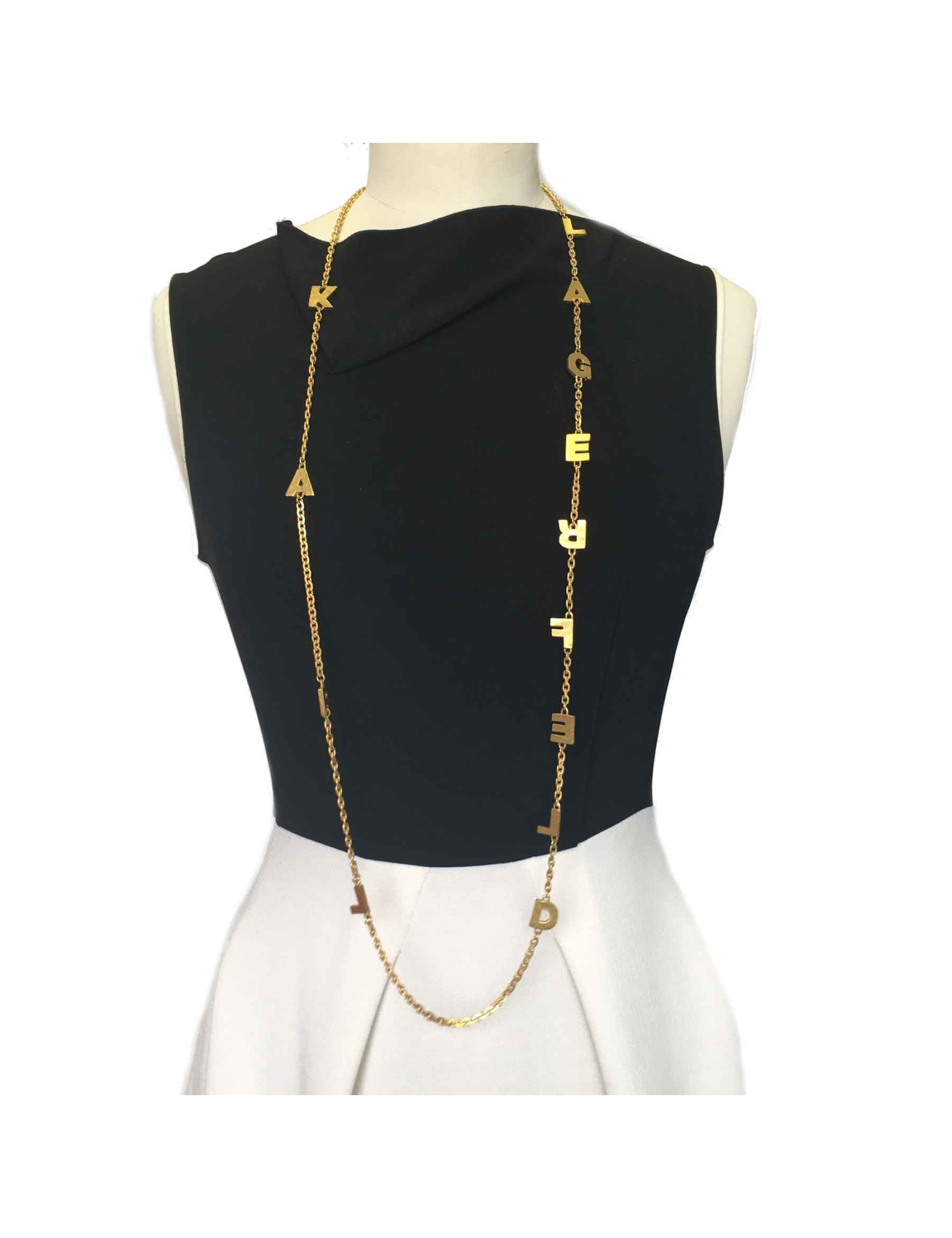 Sautoir Karl Lagerfeld chaîne et lettres en métal doré. Particularité : la lettre R de LAGERFELD est montée à l'envers