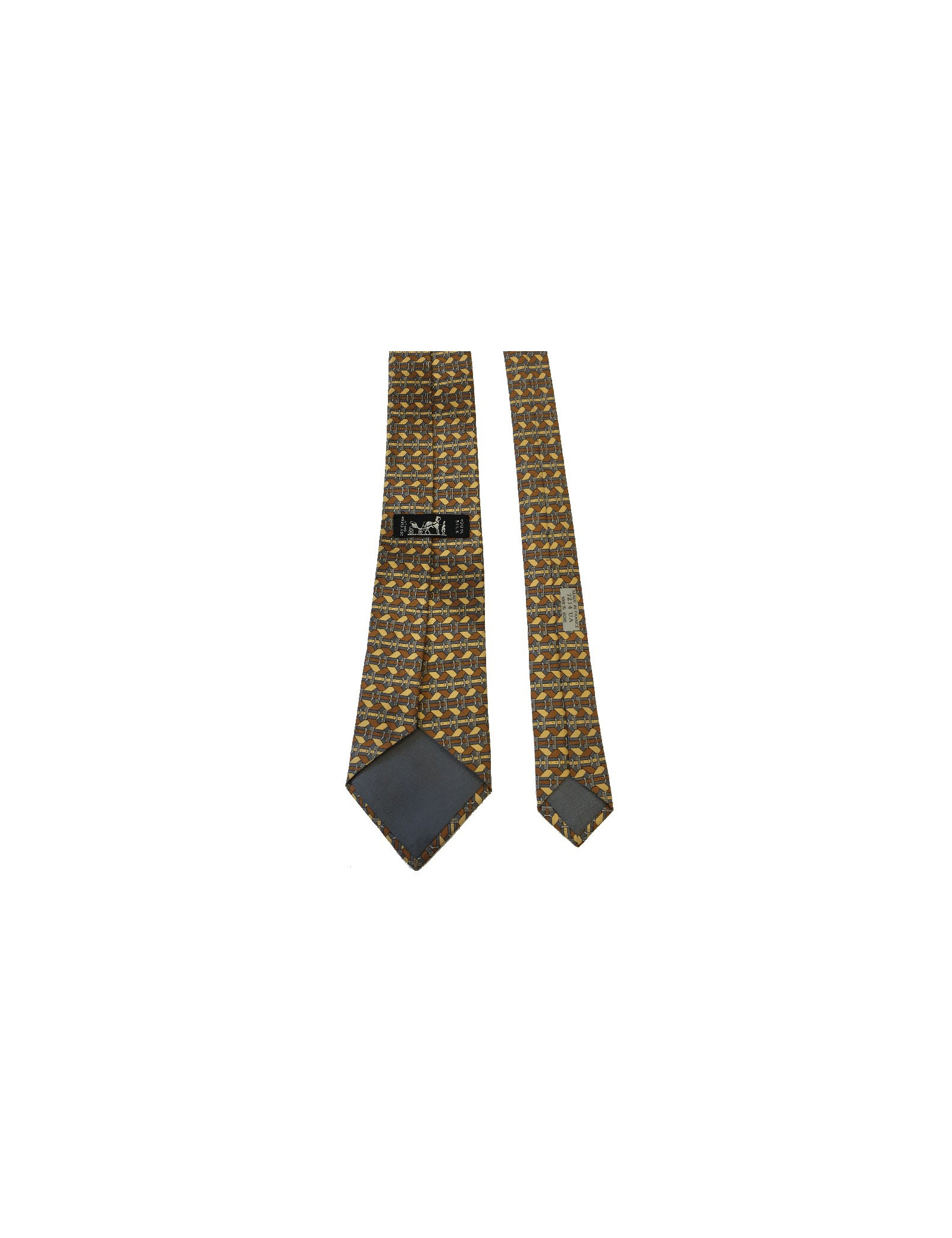 Cravate HERMÈS vintage en soie imprimée gris, marron et jaune clair