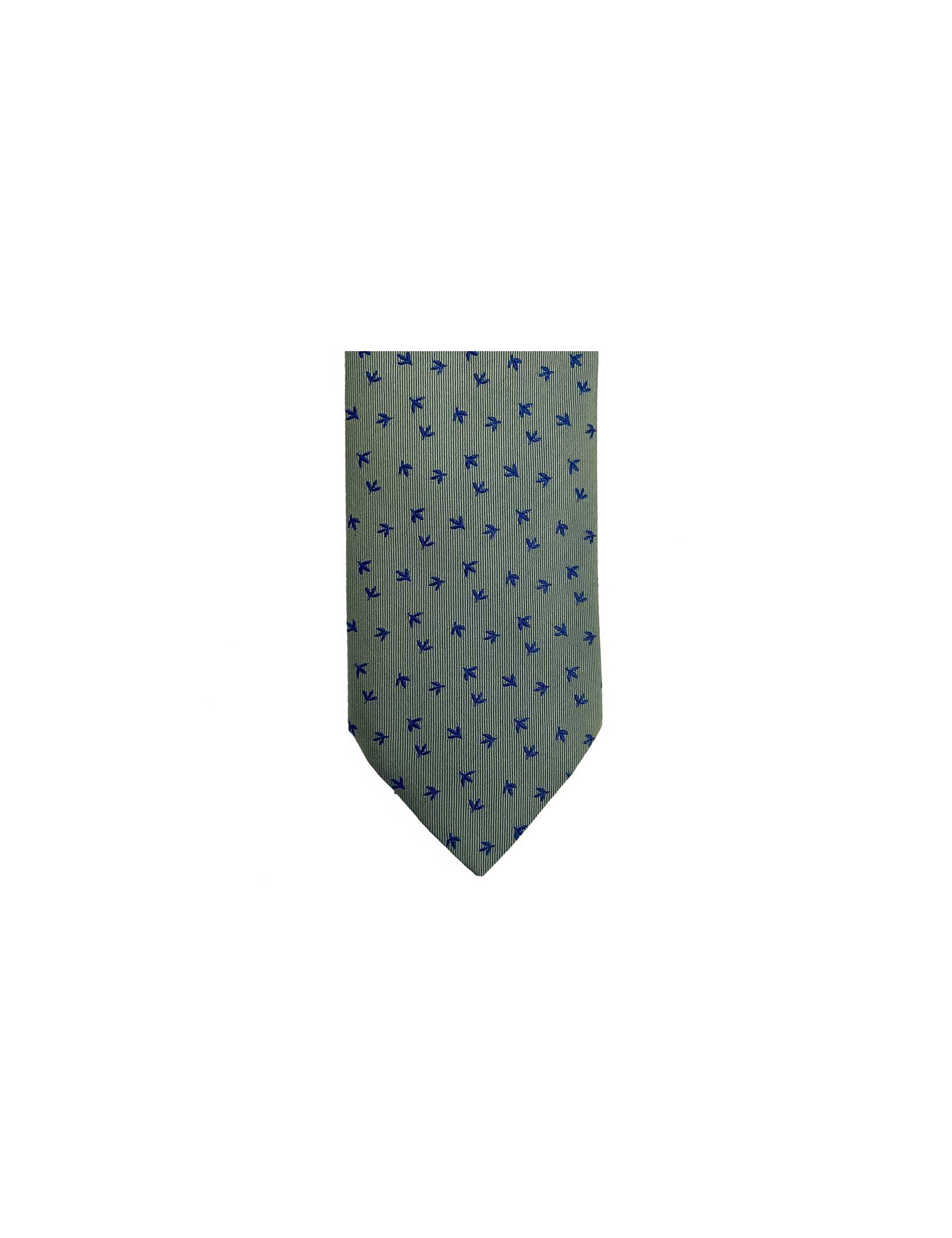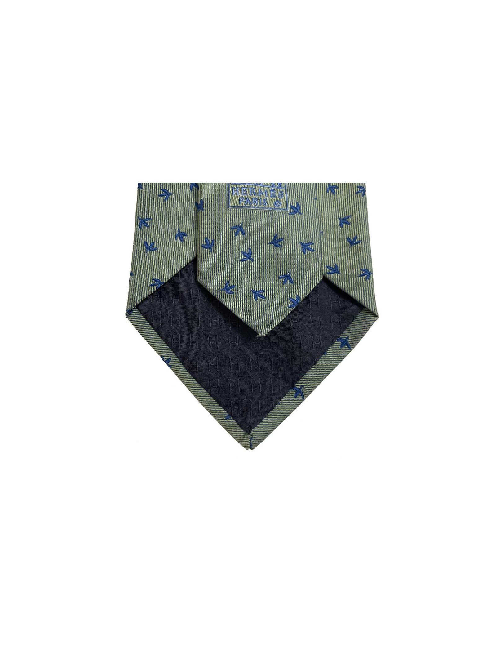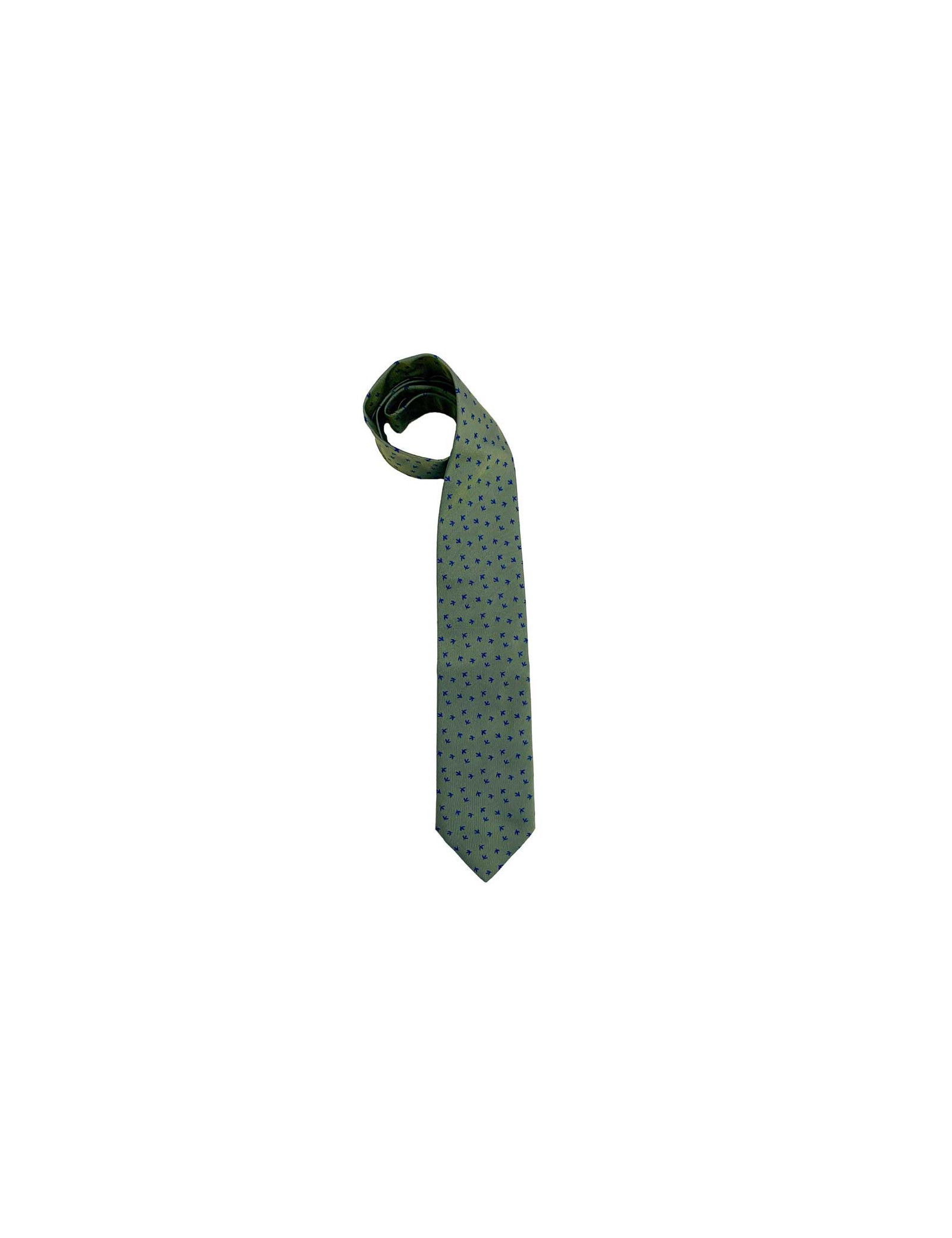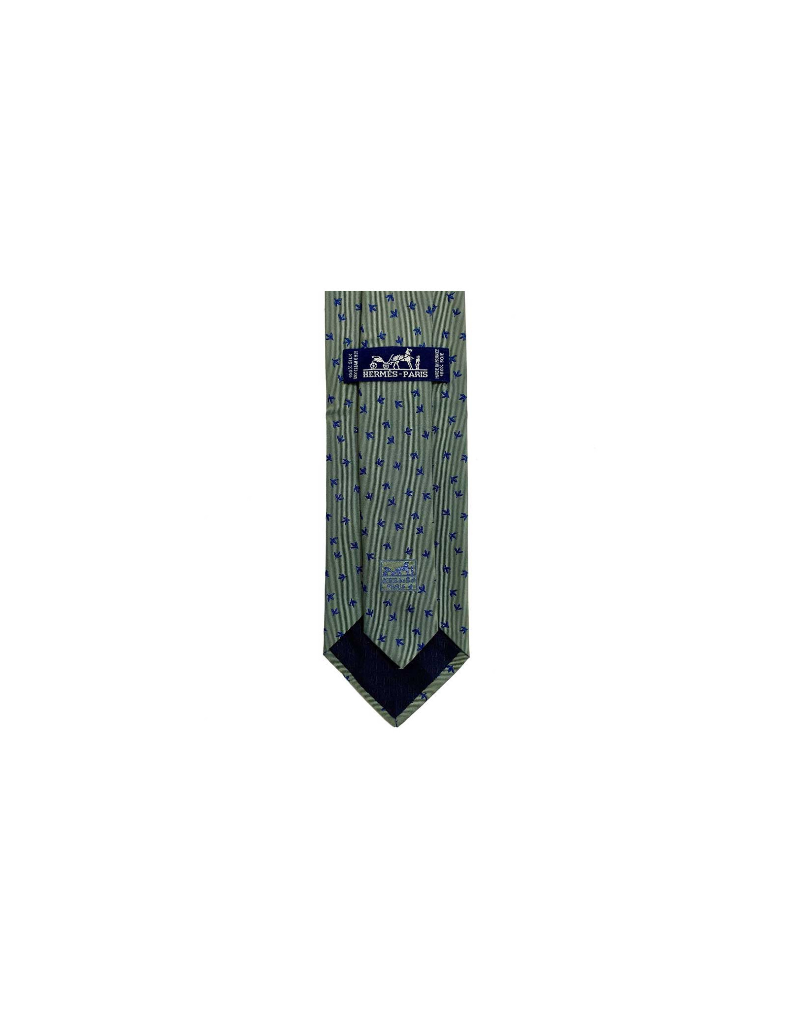 Cravate de la Maison HERMES en soie kaki. Le motif : feuilles. La doublure est en soie bleu marine monogrammée H. Cette cravate est sobre et s'accordera avec tous vos costumes.