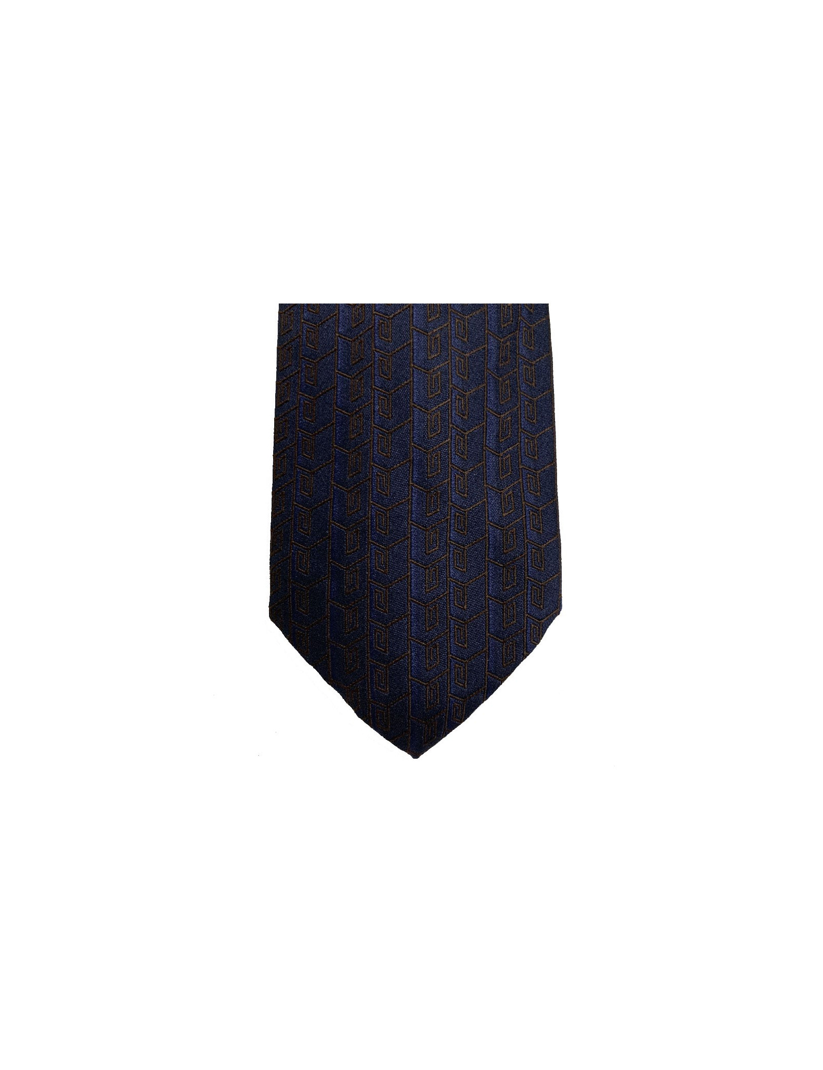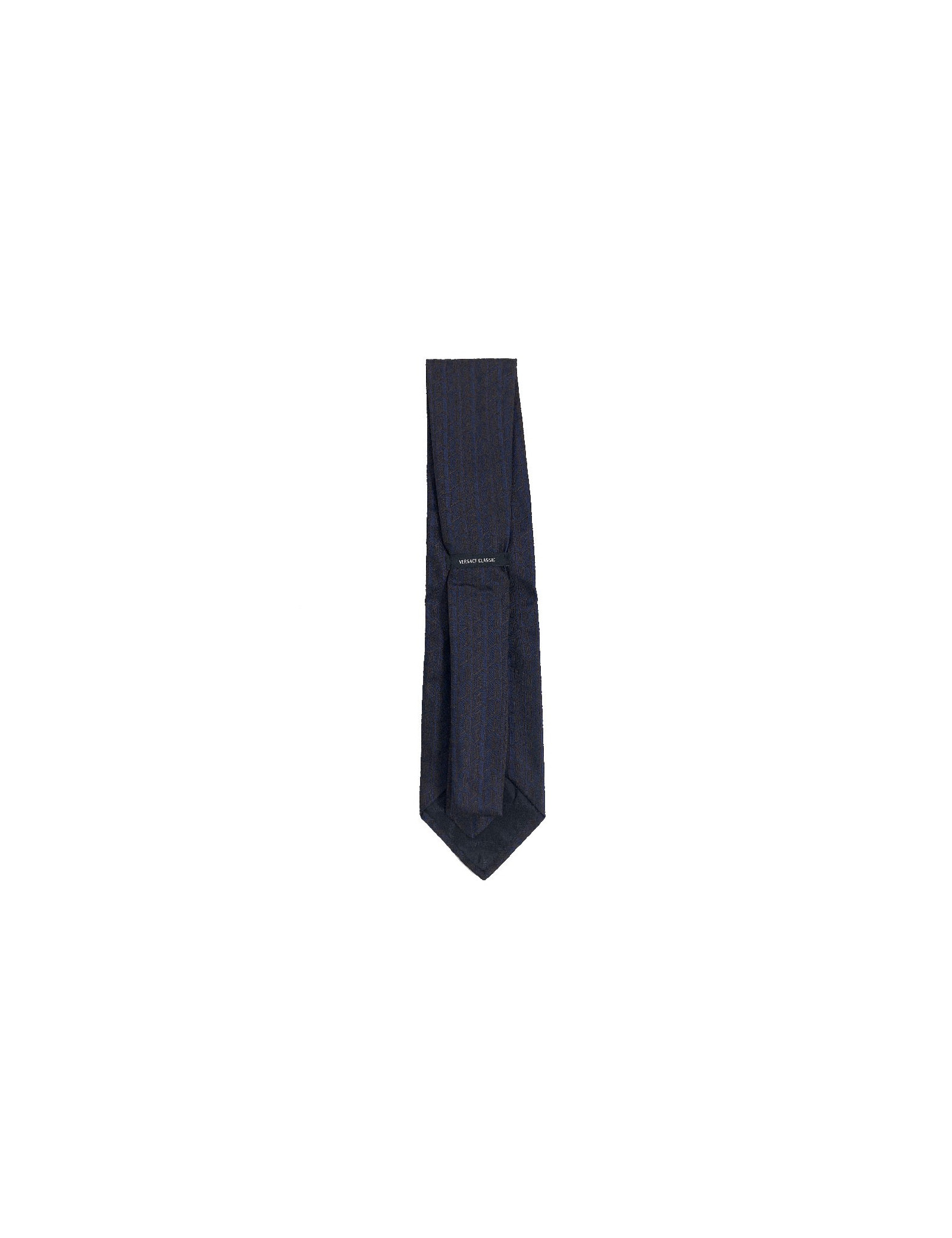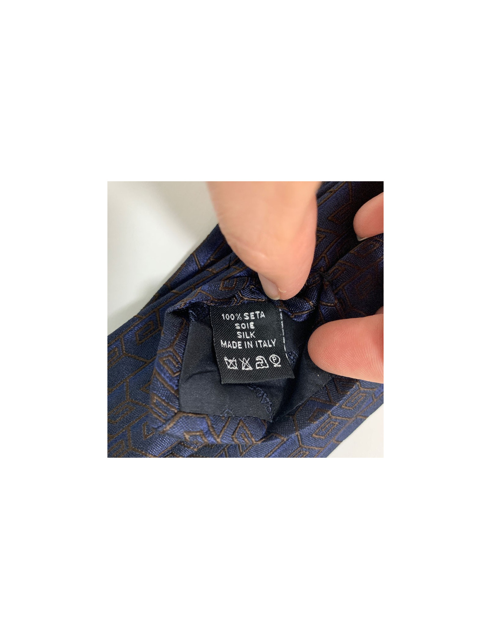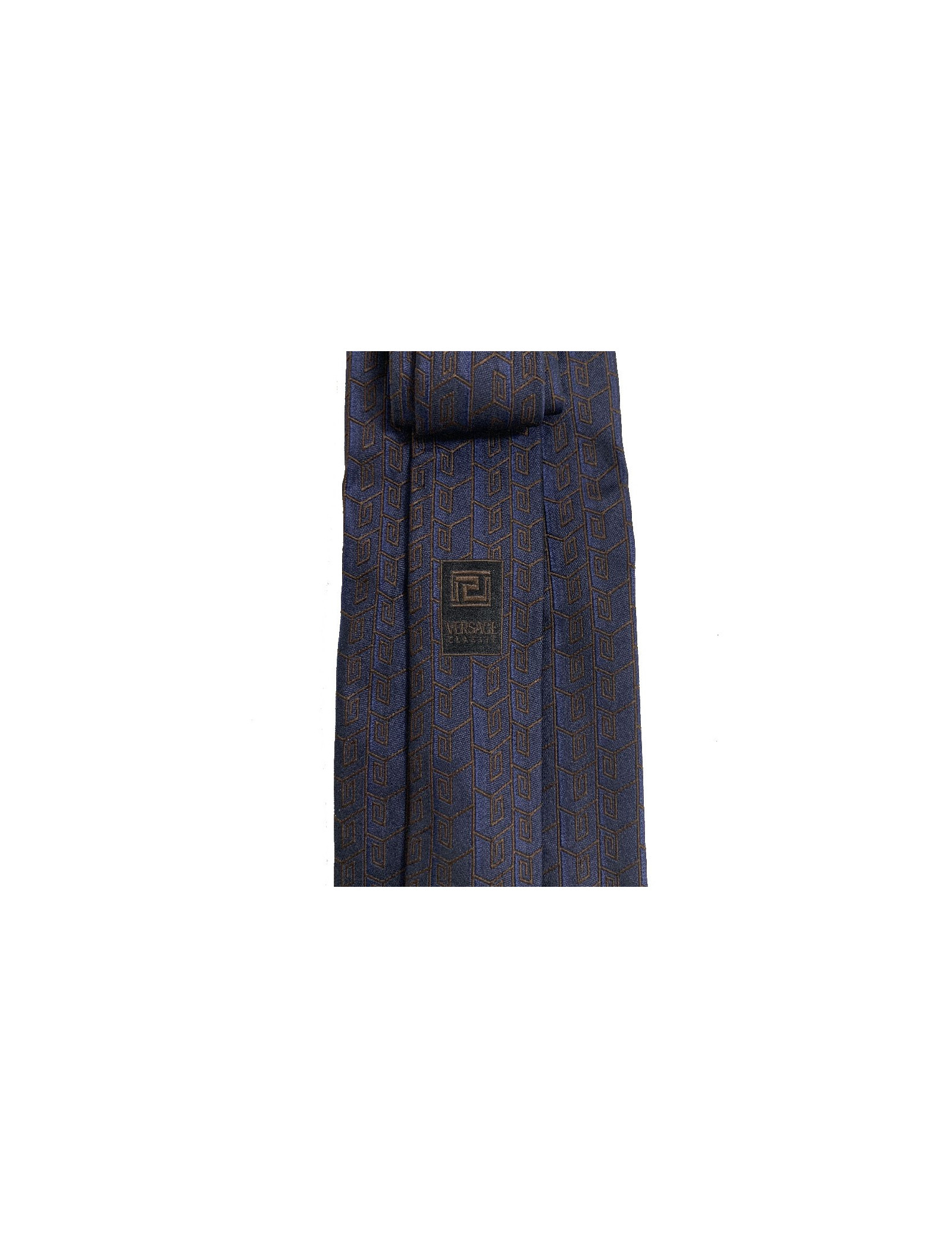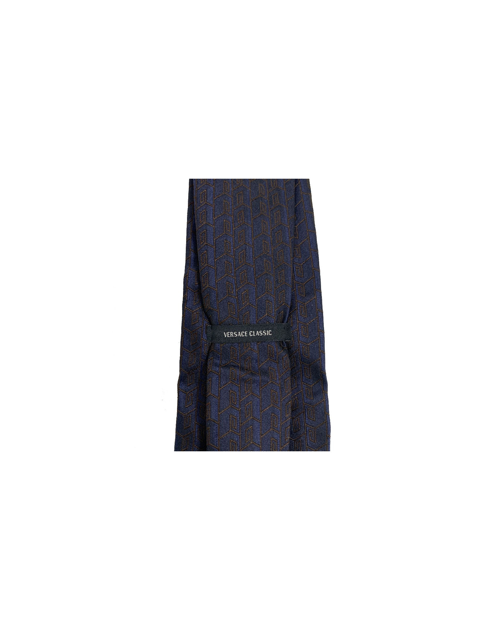Cravate Versace Classic en soie bleu nuit. Motif Versace en fil de soie marron. C'est une cravate très esthétique de part sa couleur sombre. Sa doublure est en soie bleu nuit monogrammée VERSACECLASSIC.