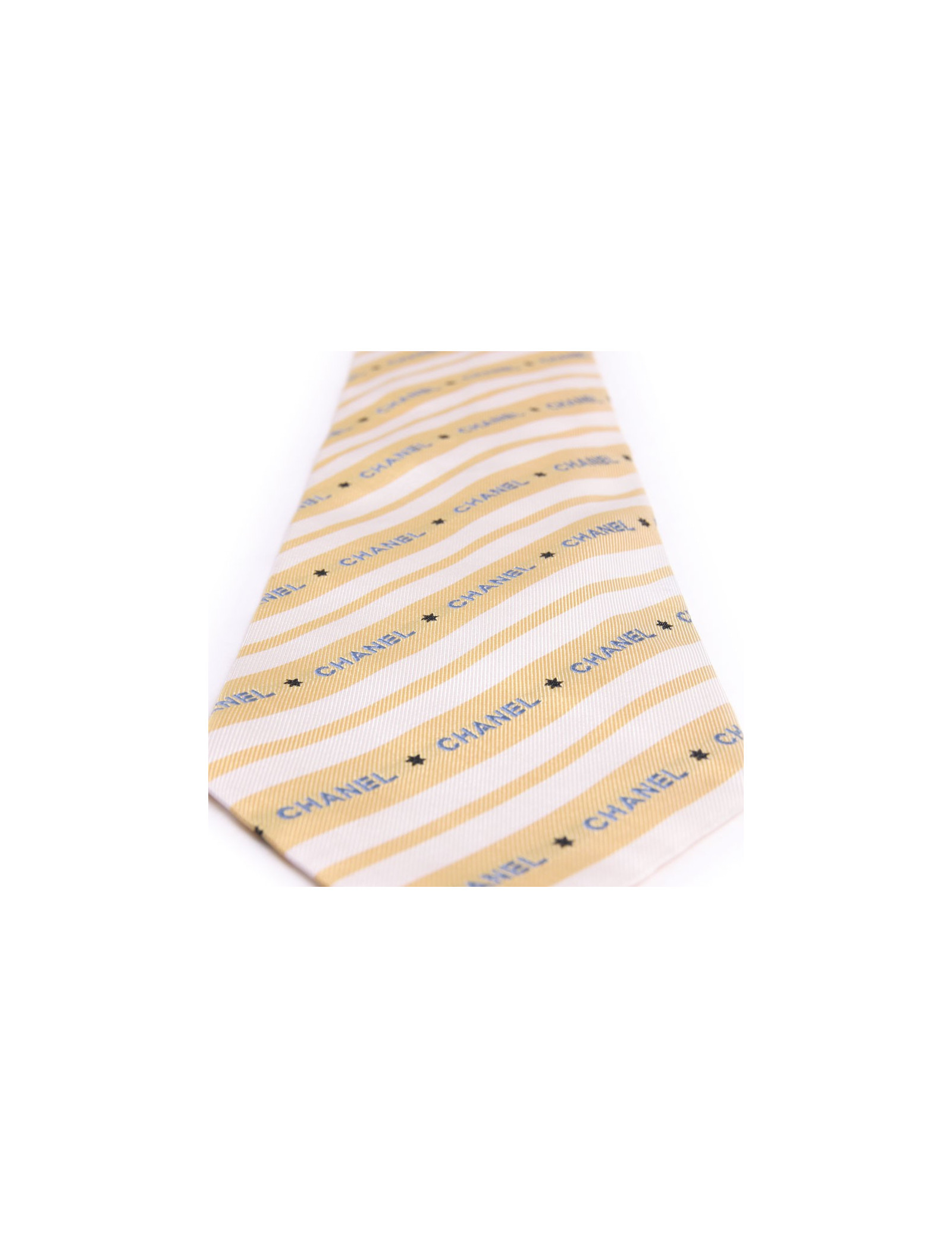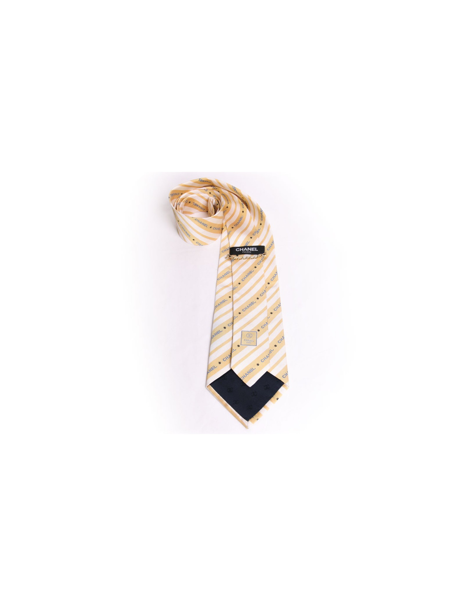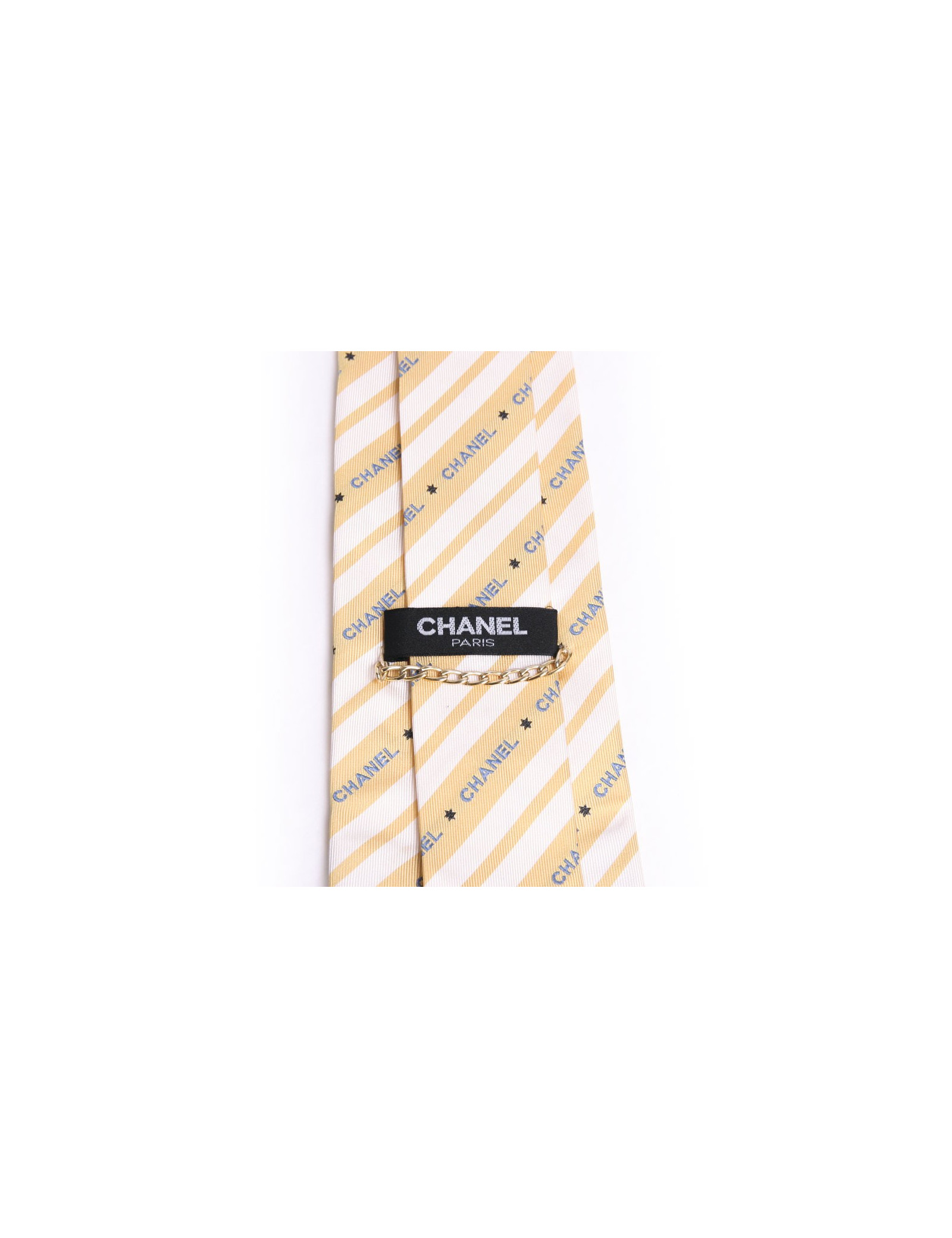 Cravate Chanel 100% soie, les rayures de la cravate sont de couleur jaune et blanche et les inscriptions Chanel de couleur bleue, petite chainette à l'envers de la cravate.