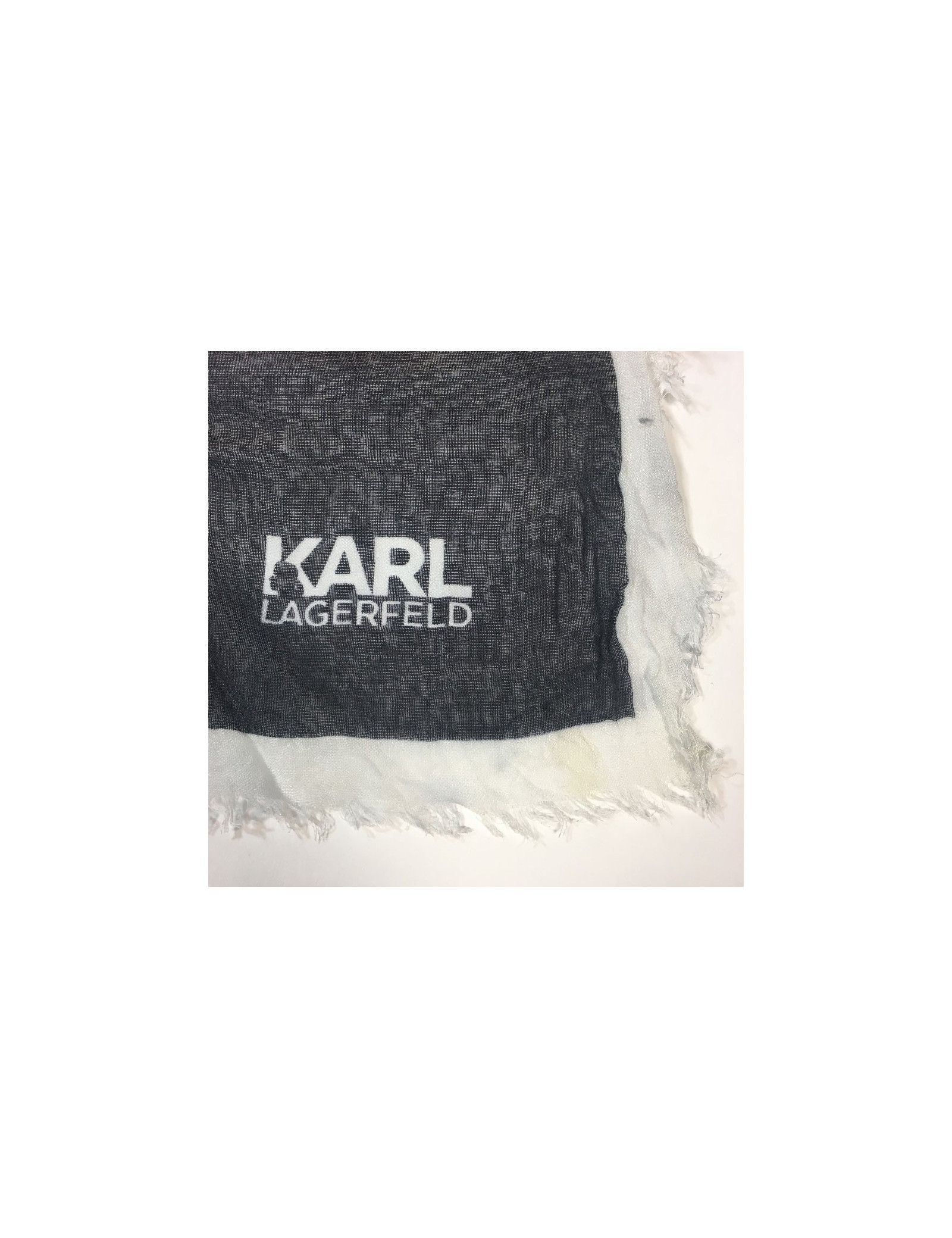 Foulard Karl Lagerfeld noir et blanc à petites franges.