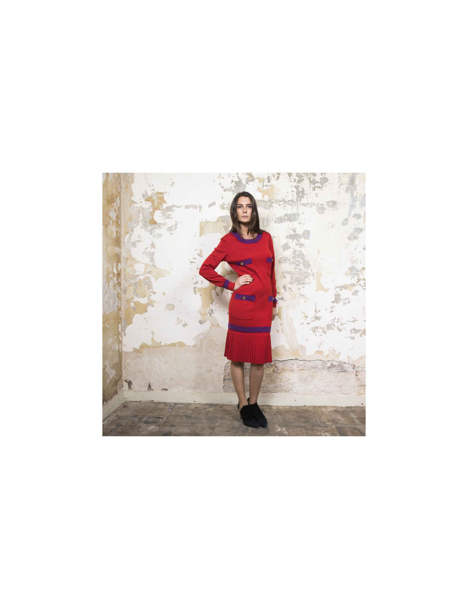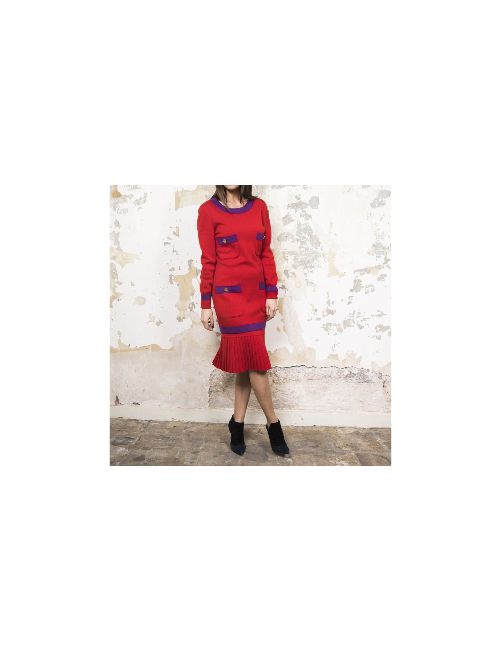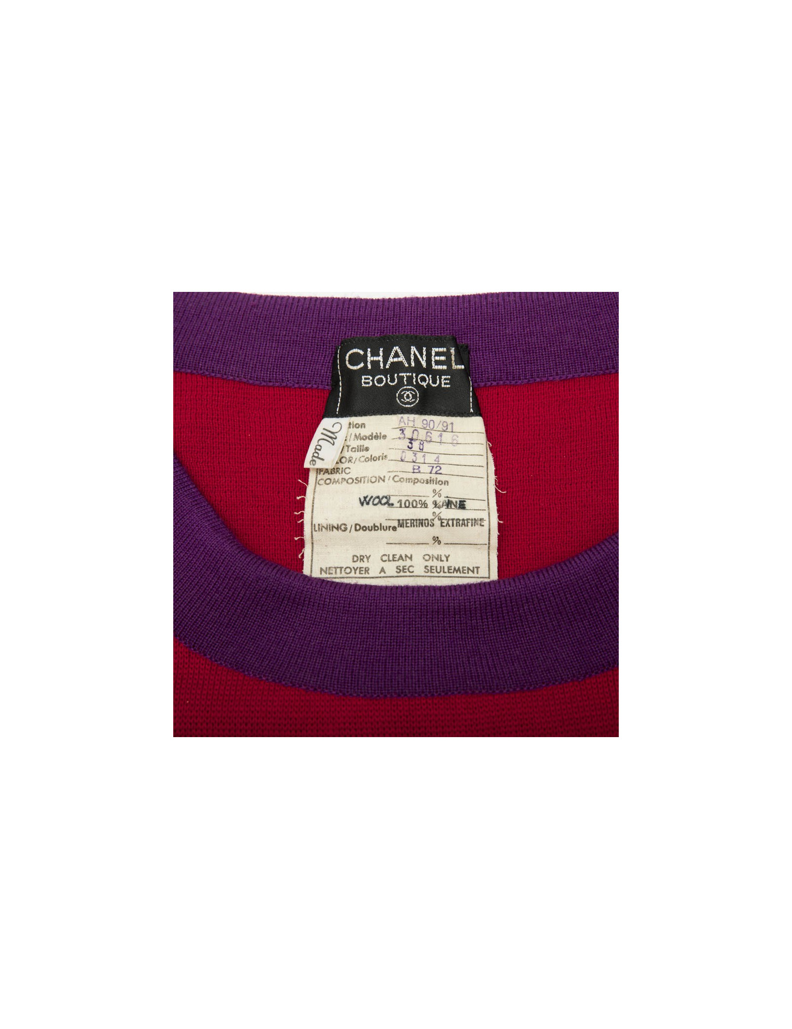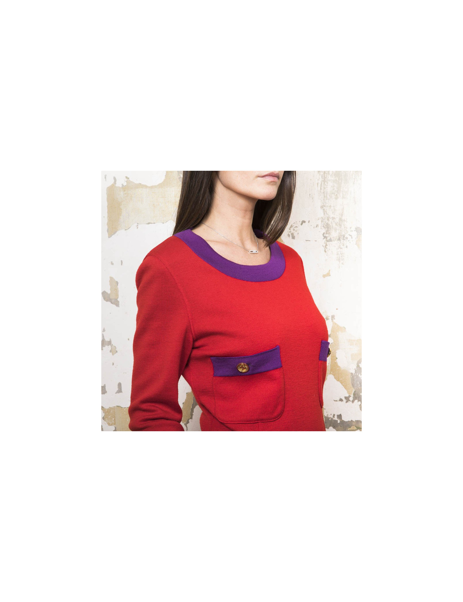 Ensemble pull et jupe Chanel en laine rouge avec bordures violettes.