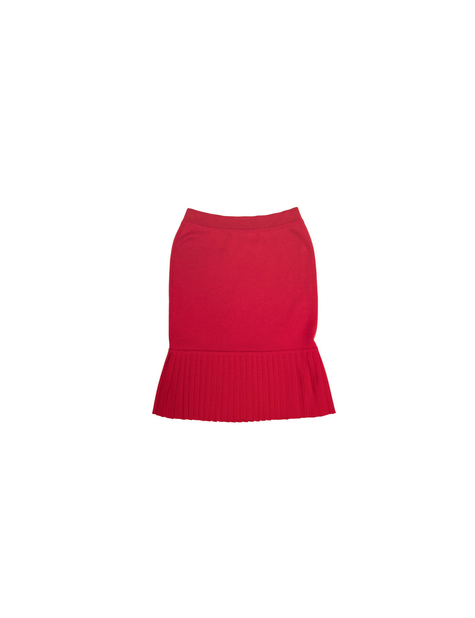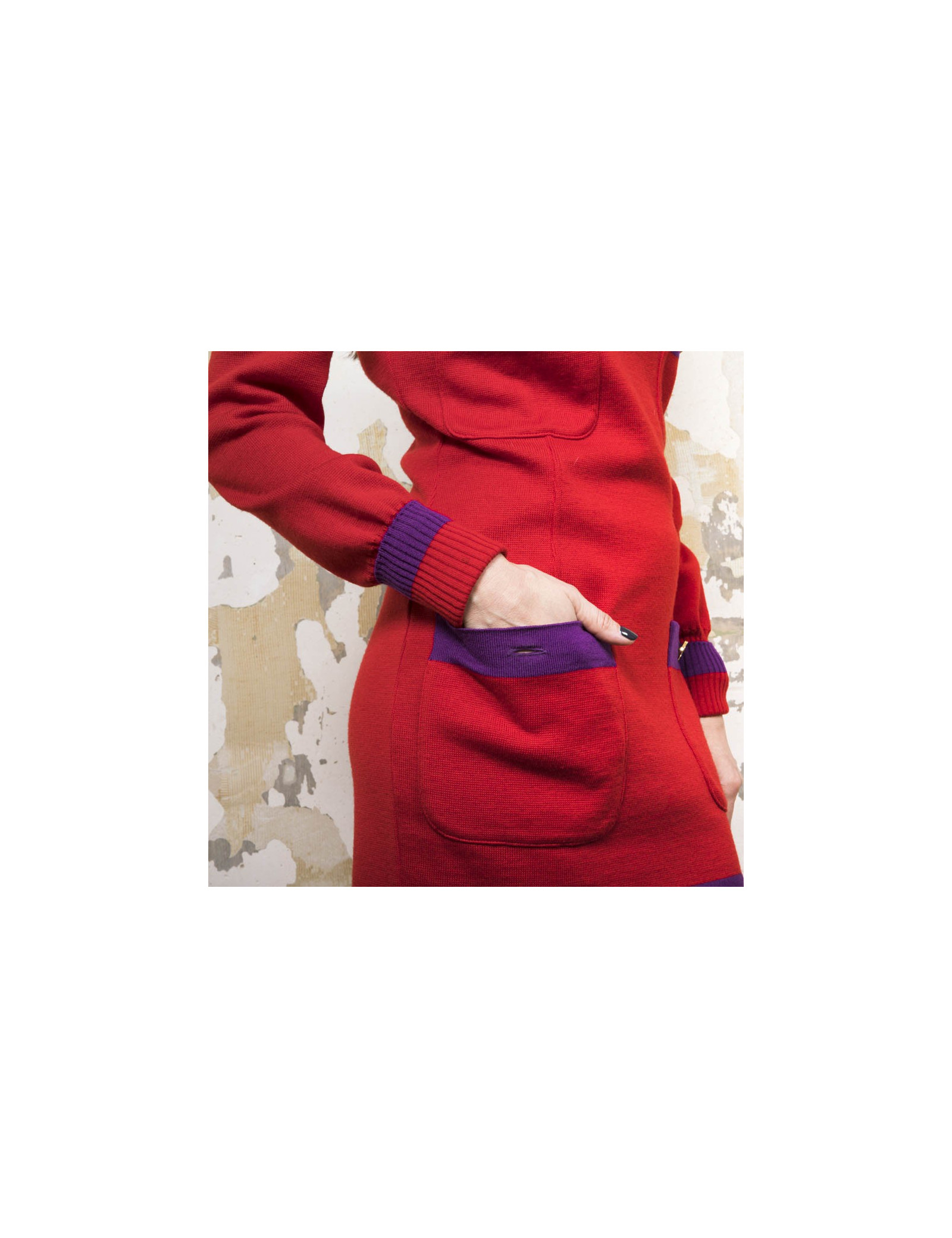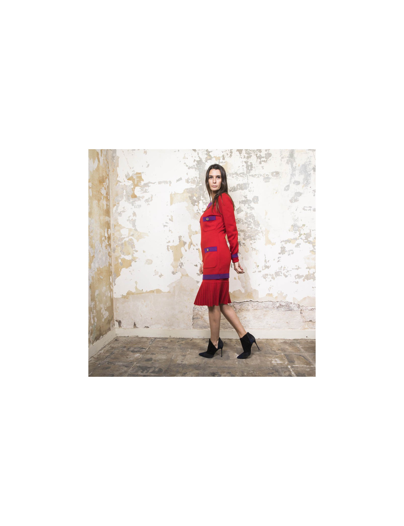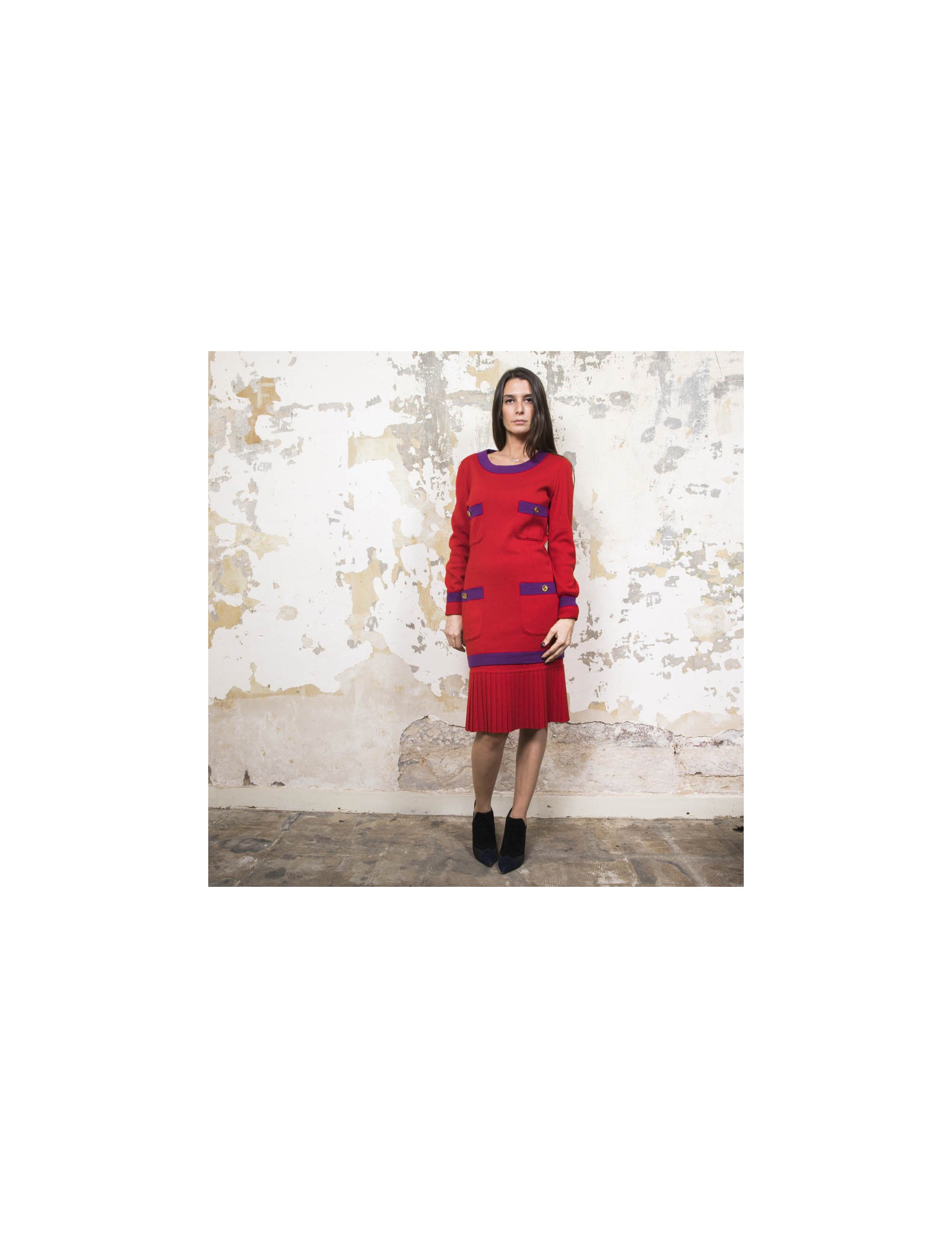 Ensemble pull et jupe Chanel en laine rouge avec bordures violettes.