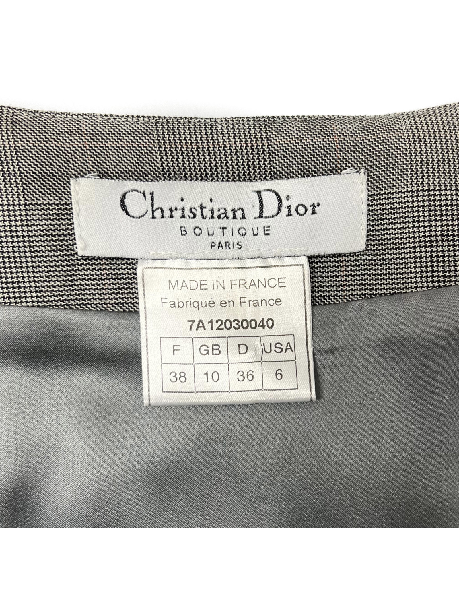 Détails : tailleur vintage Christian Dior signé John Galliano lorsqu'il était directeur artistique de la Maison de Couture. La veste se ferme par 4 boutons formant le mot D.I.O.R, et présence de deux poches plaquées.