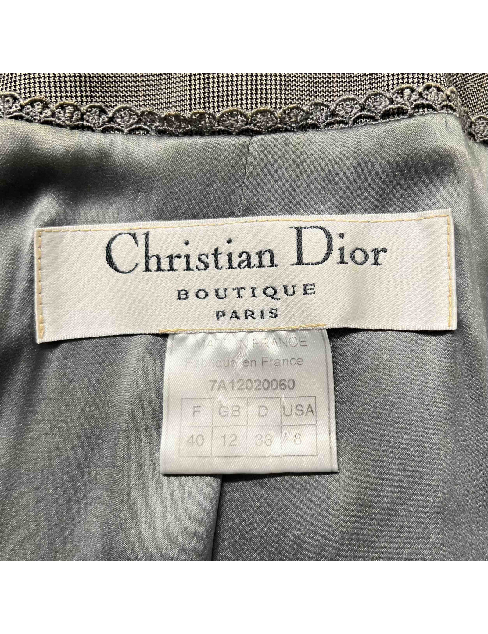 La doublure en soie grise de la veste est signée C.D. La jupe taille haute a une discrète fermeture zippée sur le côté, les plis sont en soie et dentelle nous rapellant les codes de la veste.