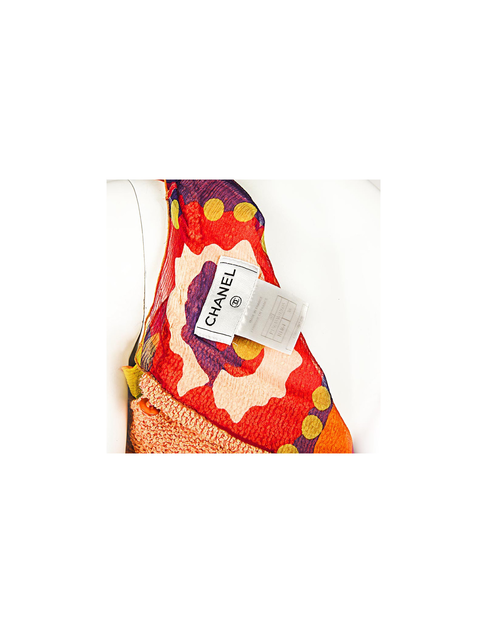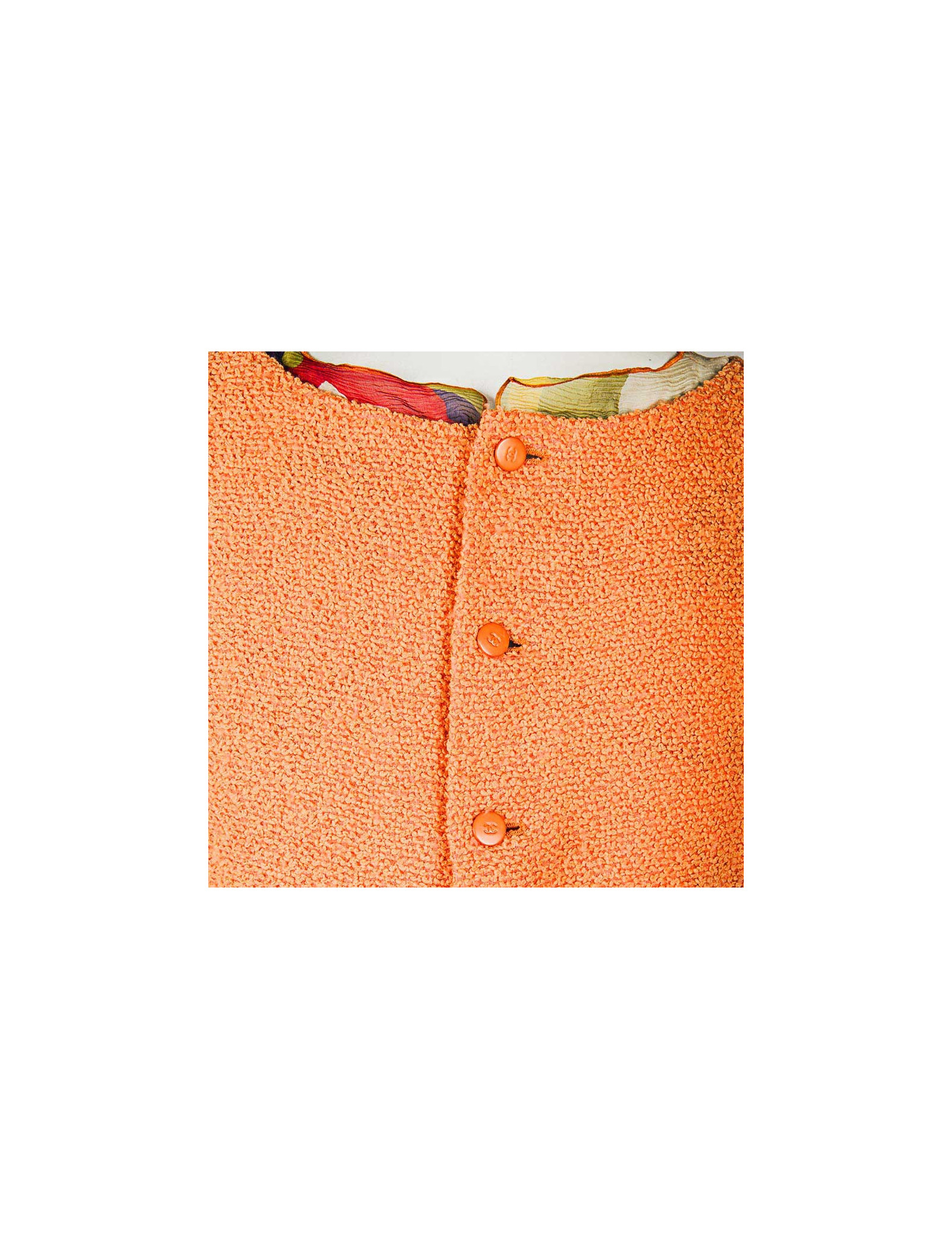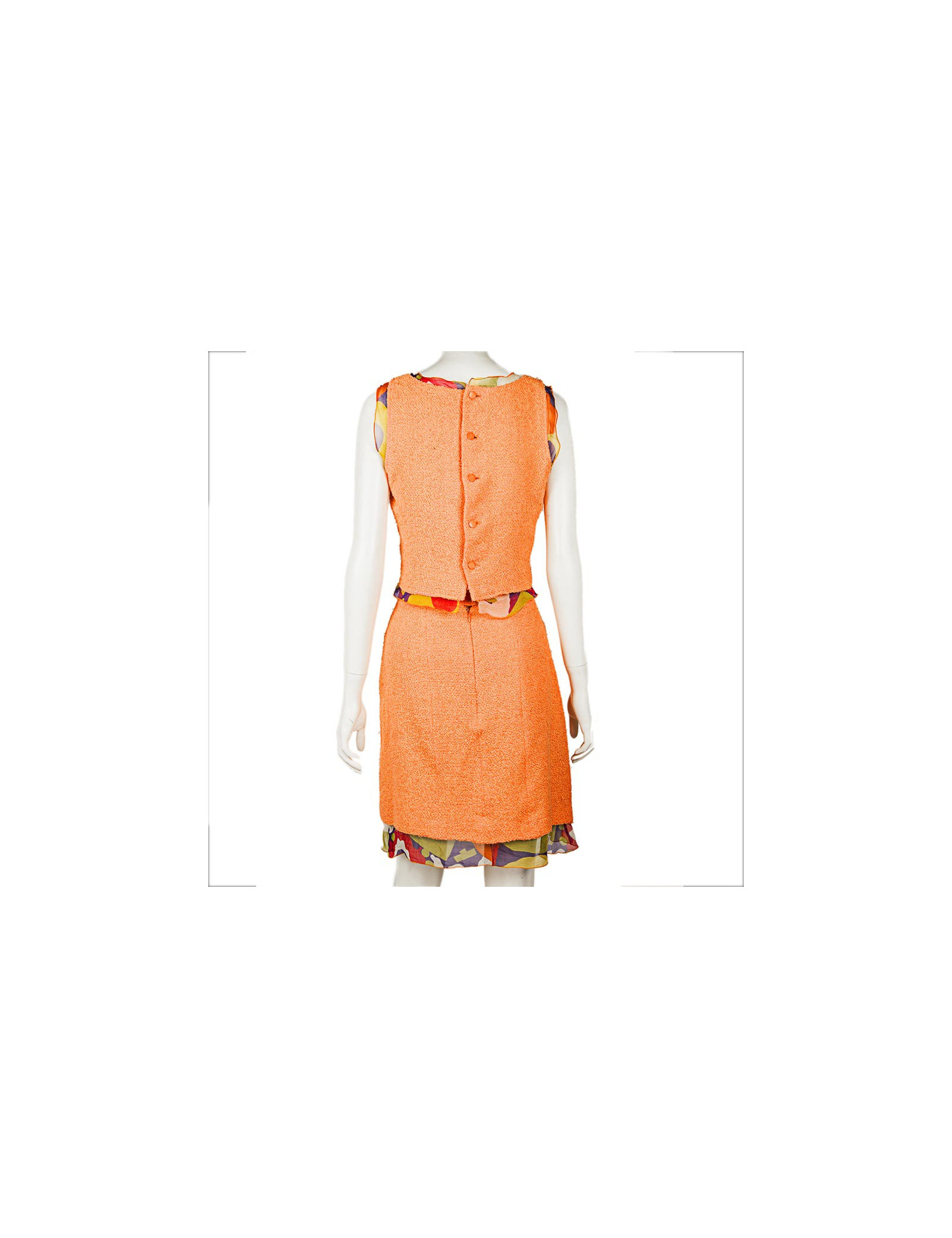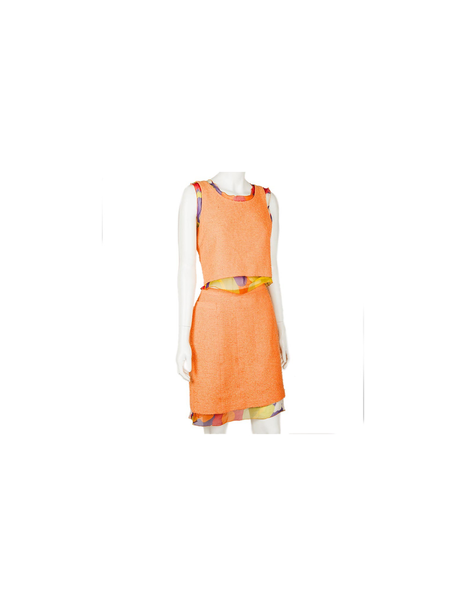 Ensemble CHANEL en laine corail Chanel taille 38 FR. Top sans manche fermé par une rangée de boutons corail marqués du monogramme "Chanel"; et d'une jupe taille haute composée d'une poche discrète à droite, d'un sigle métallique "Chanel Paris" couleur corail à droite (voir photo) et d'une fermeture zippée discrète accompagnée d'un bouton siglé, tous deux ornés d'une doublure en soie pure multicolore dépassant légèrement.