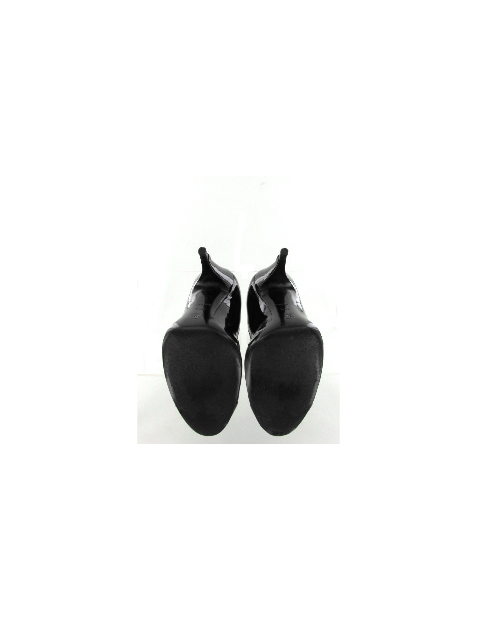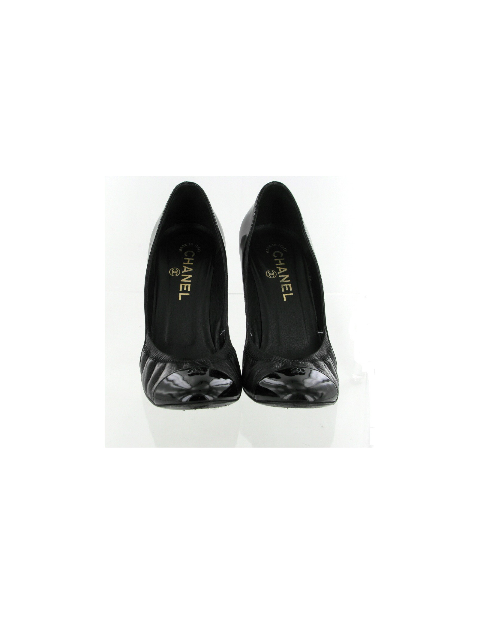 Superbes escarpins CHANEL T 37,5 en cuir lisse et cuir vernis noir. L'arrière de la chaussure est en cuir vernis noir et l'avant en cuir lisse et cuir vernis noir. Sur le bout de la chaussure le sigle CC est présent. Le talon est en cuir vernis, il y est inscrit CHANEL .