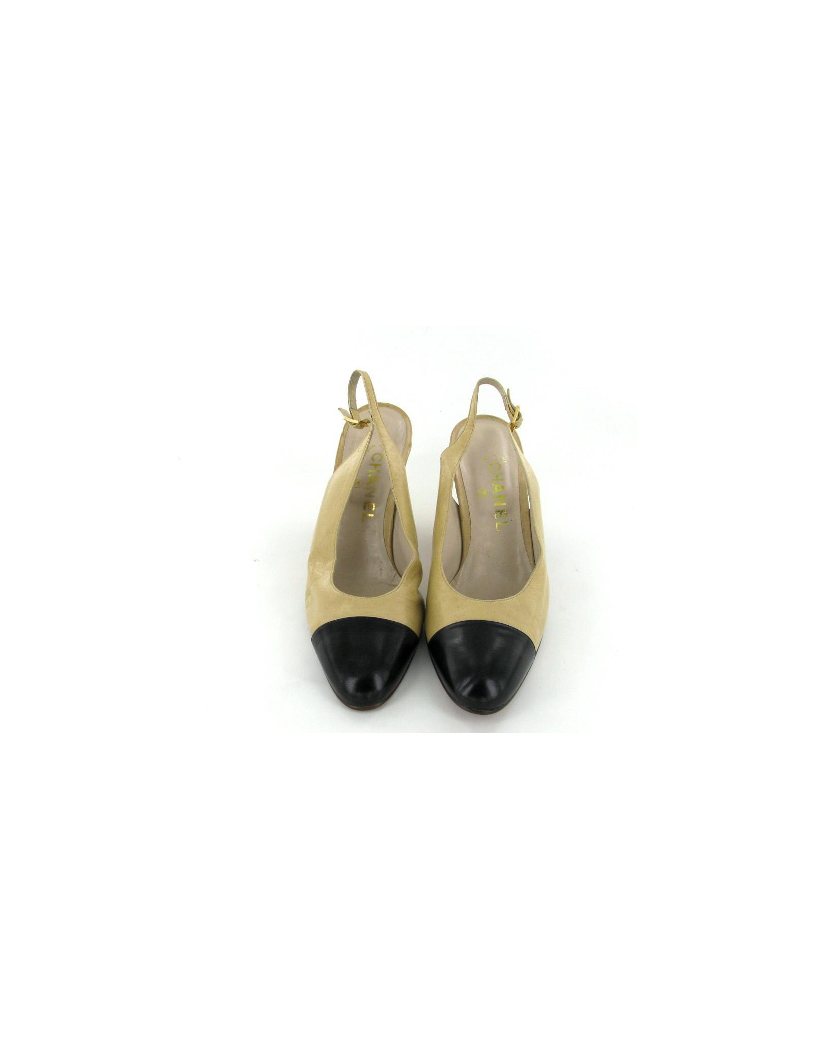 Classiques et mythiques escarpins CHANEL bicolores, beige et noir T39. Le fermoir de la lanière est en métal doré avec l'inscription "CHANEL" gravé dessus. on remarquera des traces d'usures ainsi que de petites tâches. Ils sont en bon état.