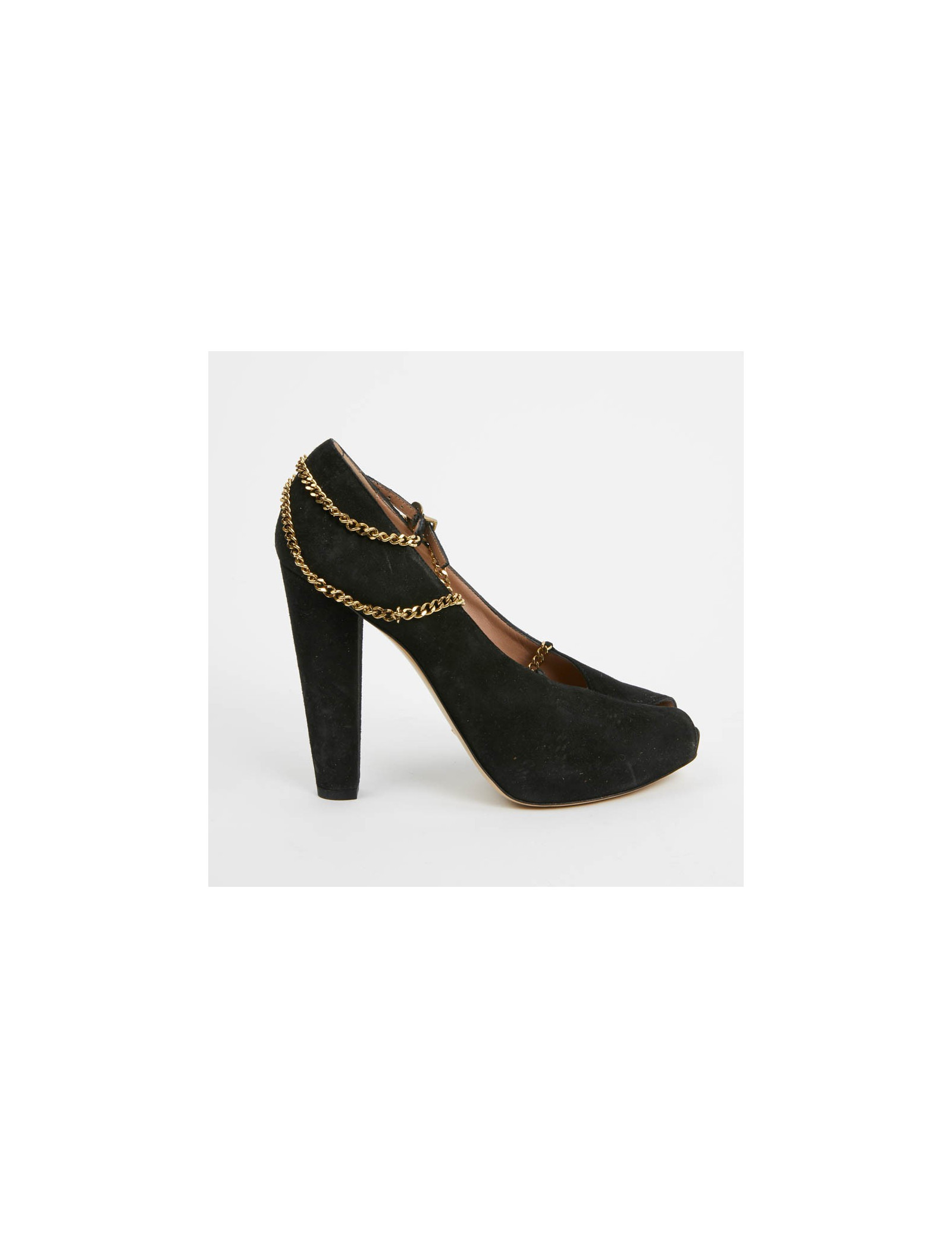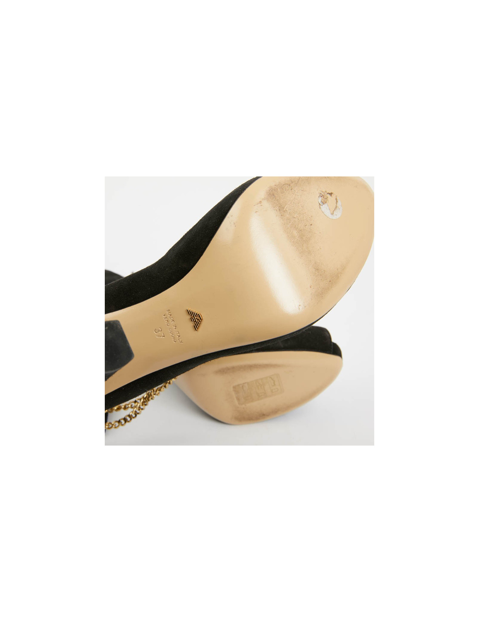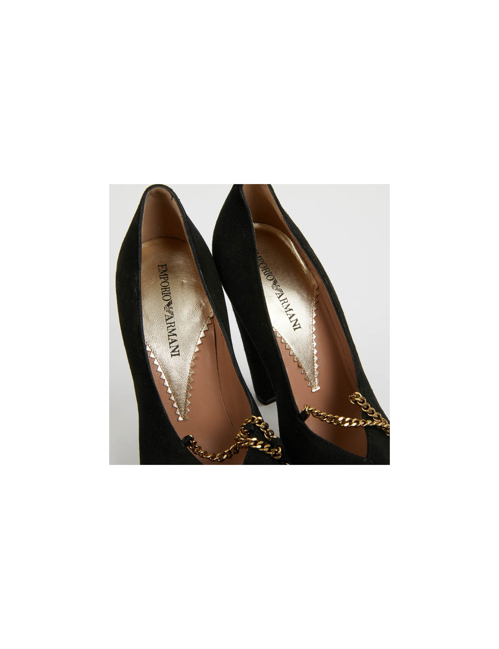 Escarpins Emporio ARMANI en suède noir. C'est une taille 37 fr. La chaine dorée s'attache autour de la cheville. Elles sont doublées en cuir. Elles n'ont jamais été portées, les traces visibles sur les semelles sont dues aux essayages.