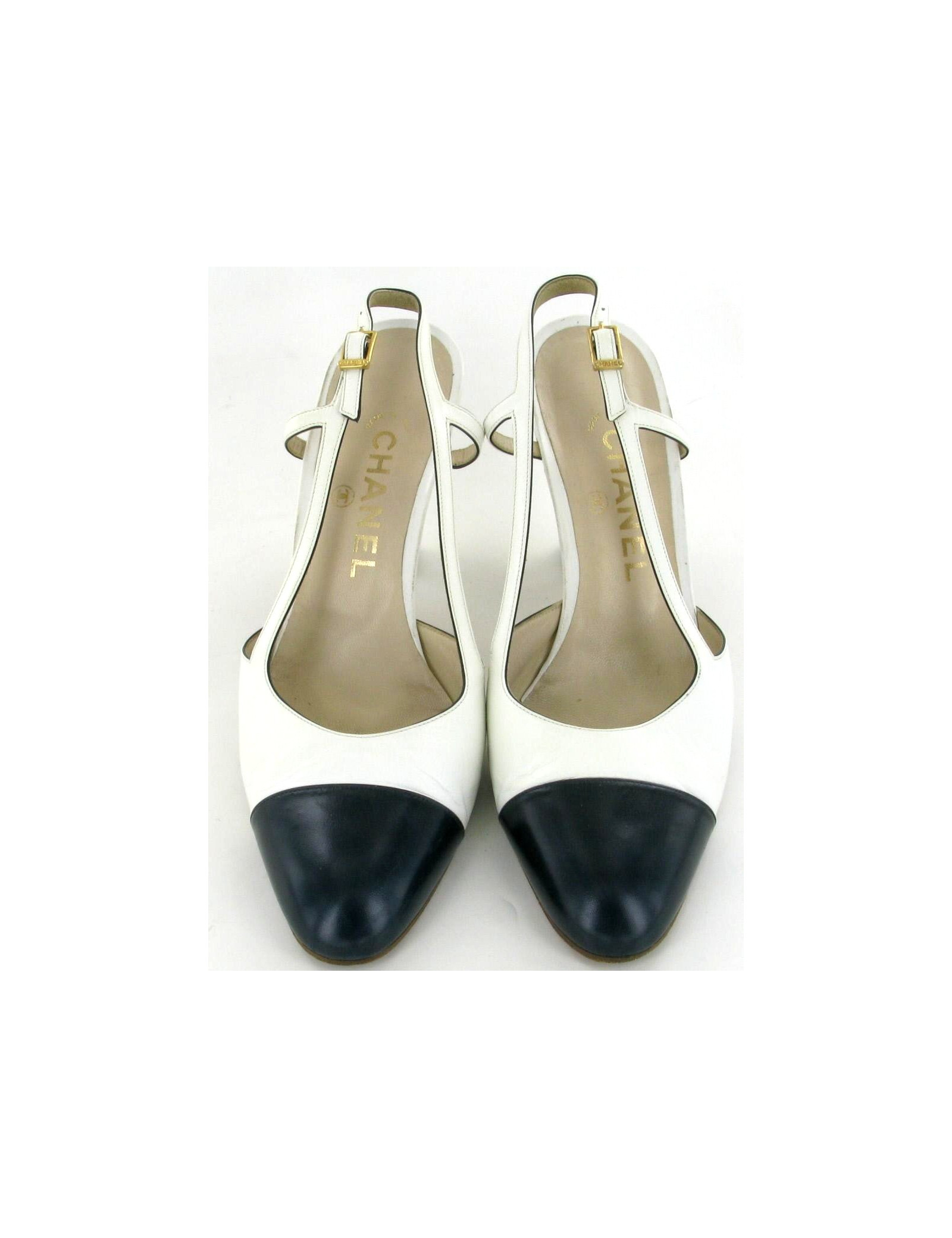 Escarpins CHANEL en cuir blanc et bleu marine, taille 38,5. Découpe très élégante le long du pied et au talon. Boucle de ferrmeture en métal doré gravée CHANEL. Cuir légèrement abîmé car ces chaussures ont été portées à plusieurs reprises. Vendues dans leur boîte d'origine. Made in Italy.
