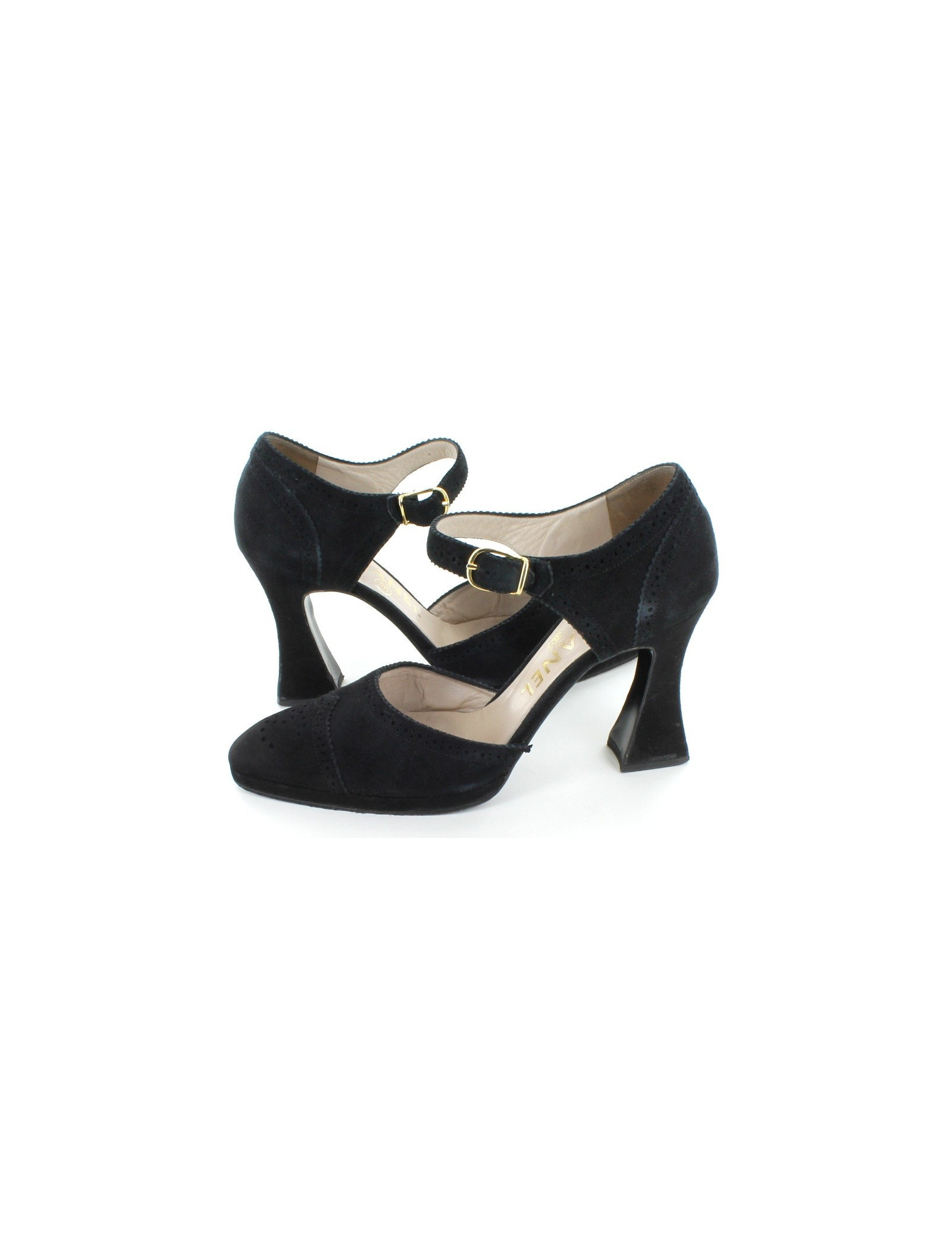 Escarpins Chanel en veau velours noir bouts fleuris, style church's, taille 36,5. En très bon état, cette paire très tendance et très confortable. Talon forme sculpturale. Boucle dorée. Made in Italy. Vendues avec leur dustbag et leur boîte d'origine. Finition main.