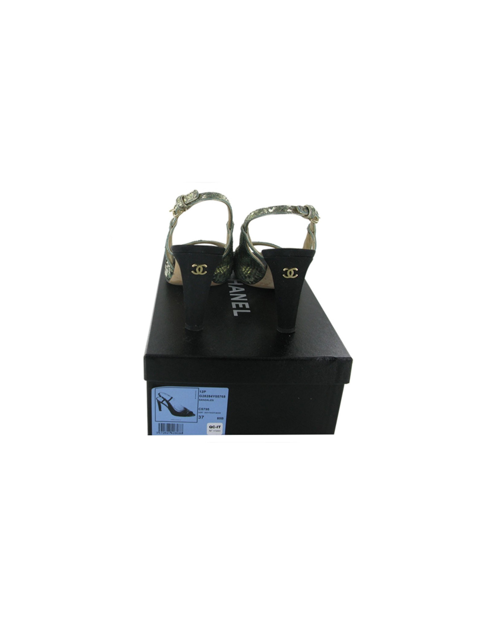 Grand classique de la Maison Chanel. Il y a un double "c" à l'arrière de la chaussure métal doré et le talon est enrobé d'un gros grain noir.