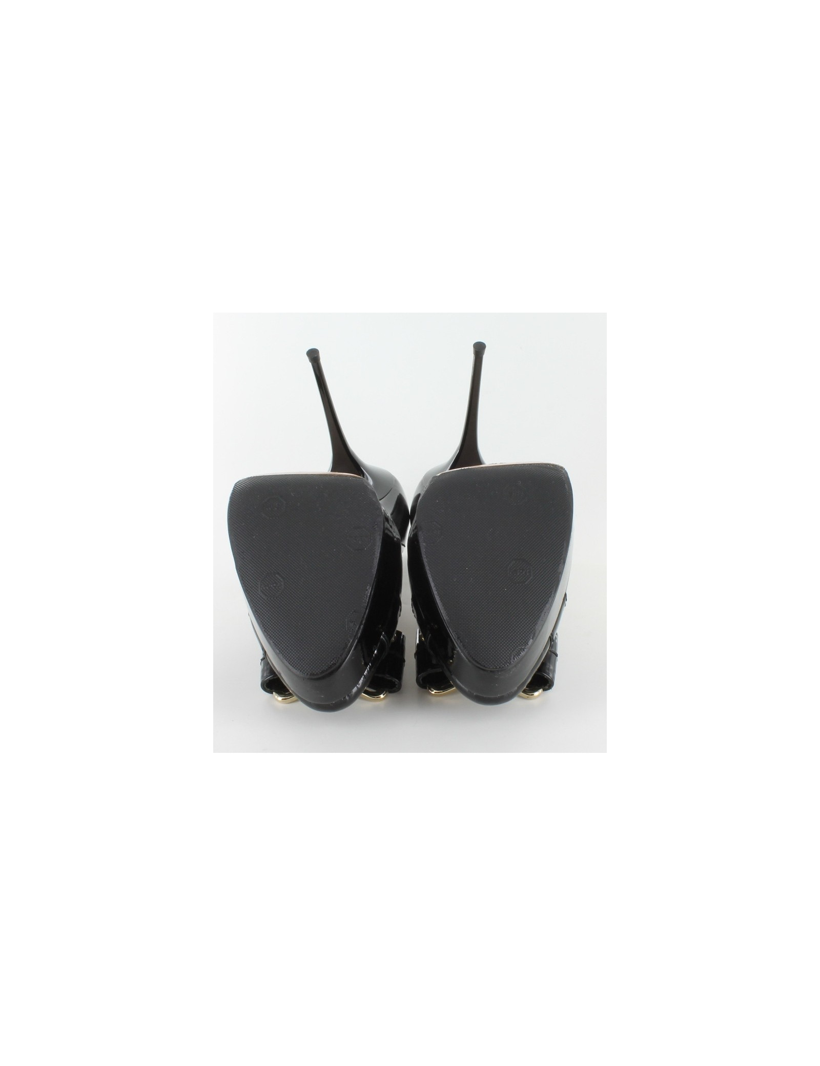 En parfait état, ces escarpins s'accomoderont à vos tenues de soirée. Un joli noeud en métal doré et en cuir verni agrémente l'avant du pied. Semelles intérieures et extérieures en cuir. Les patins ont été ressemelés. Made in Italy.